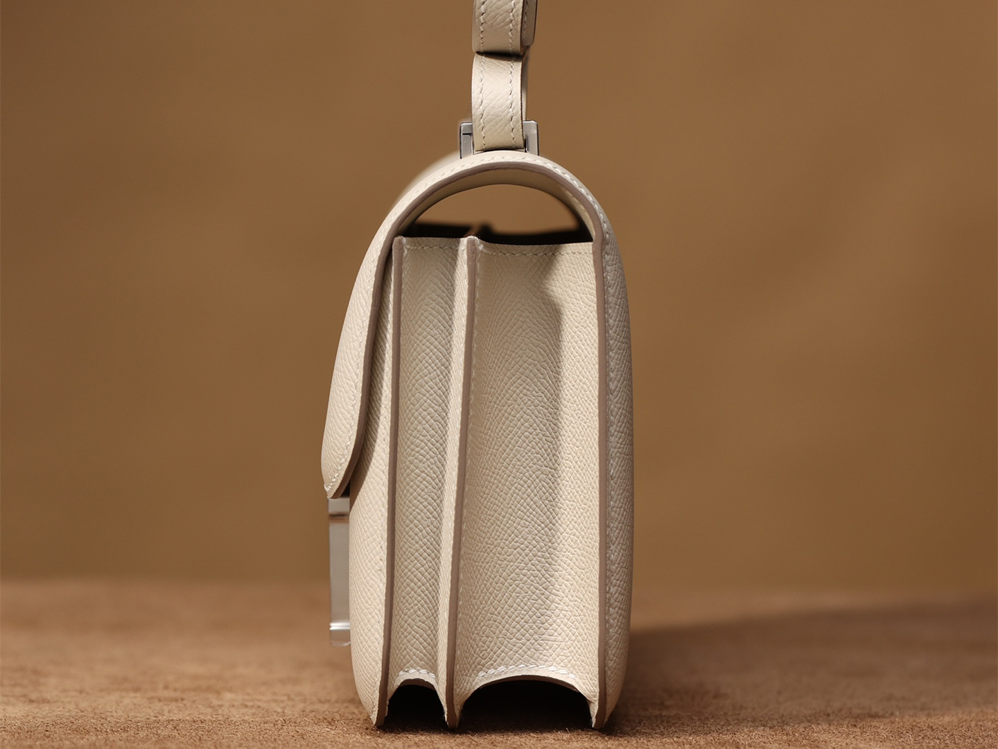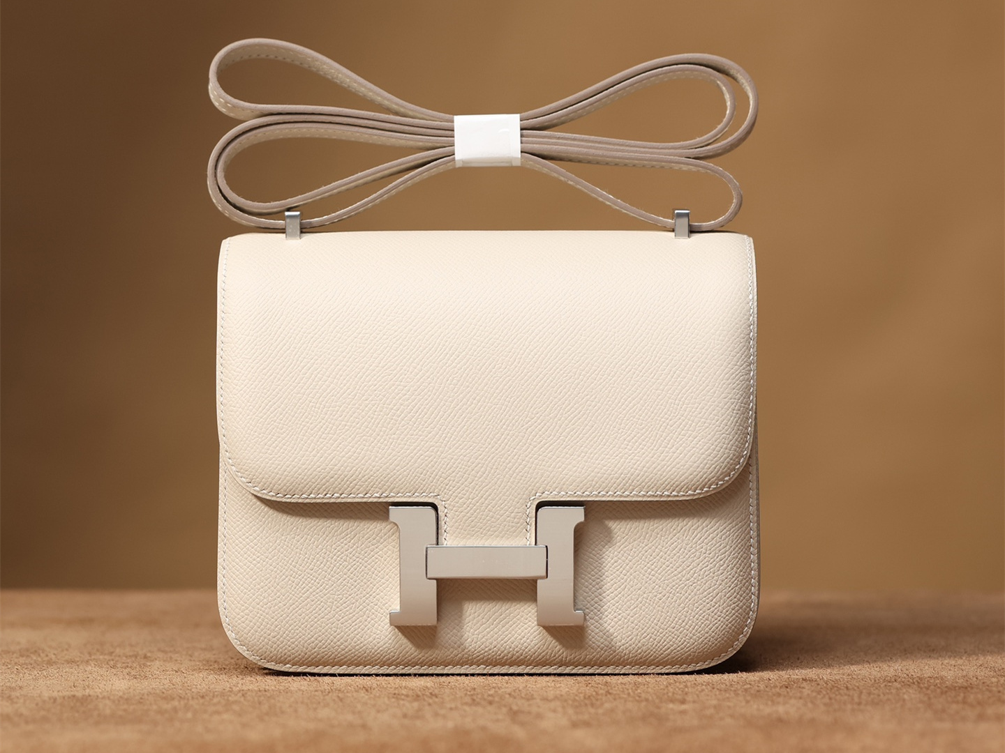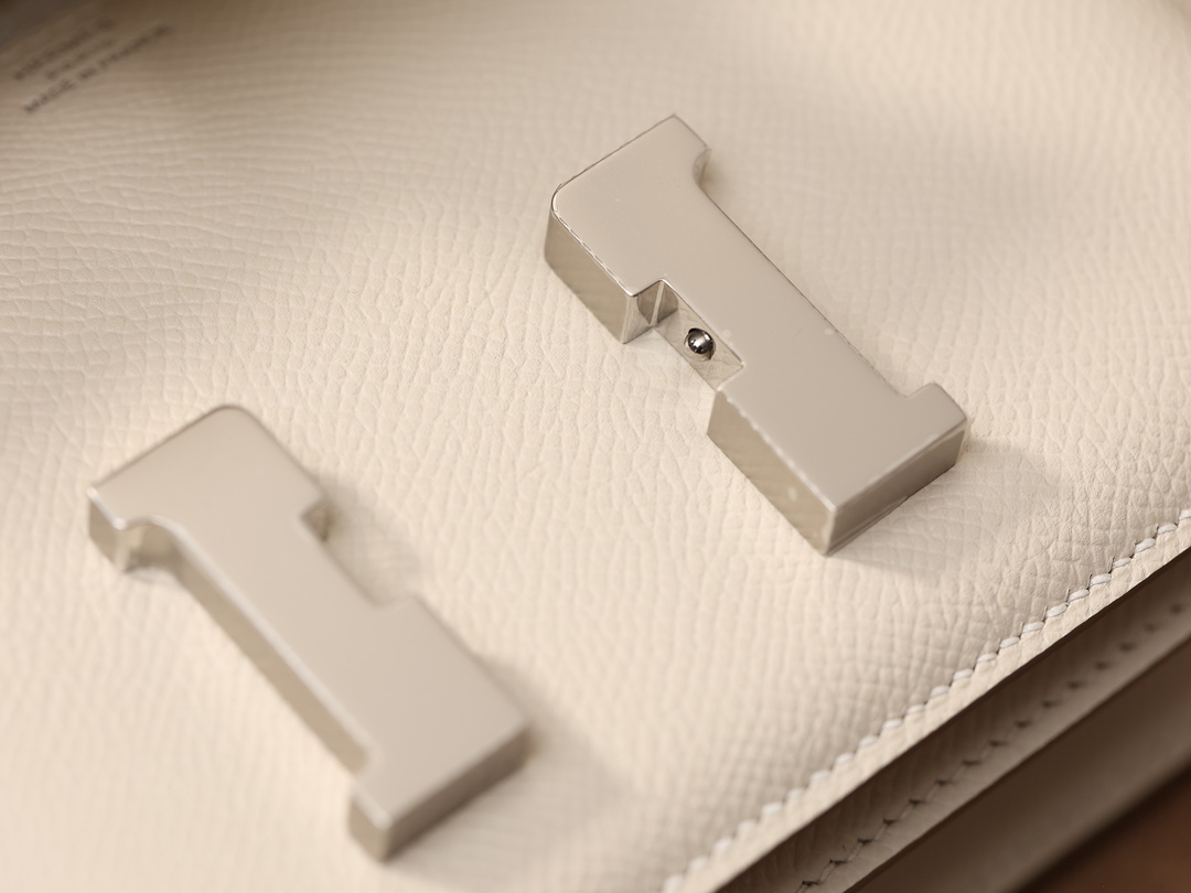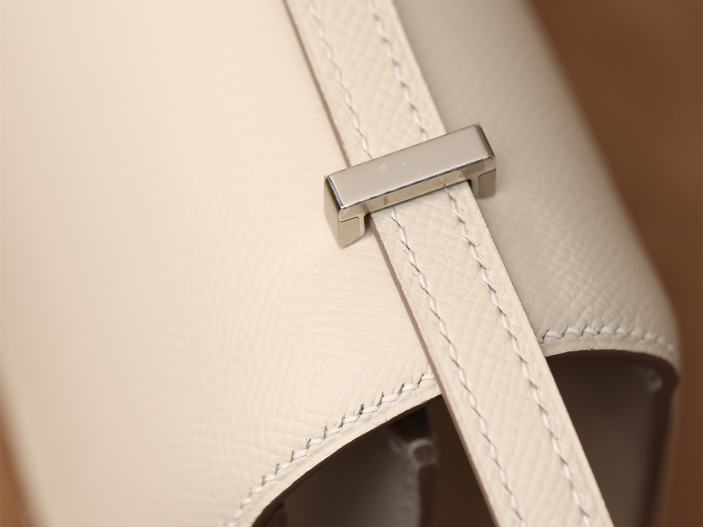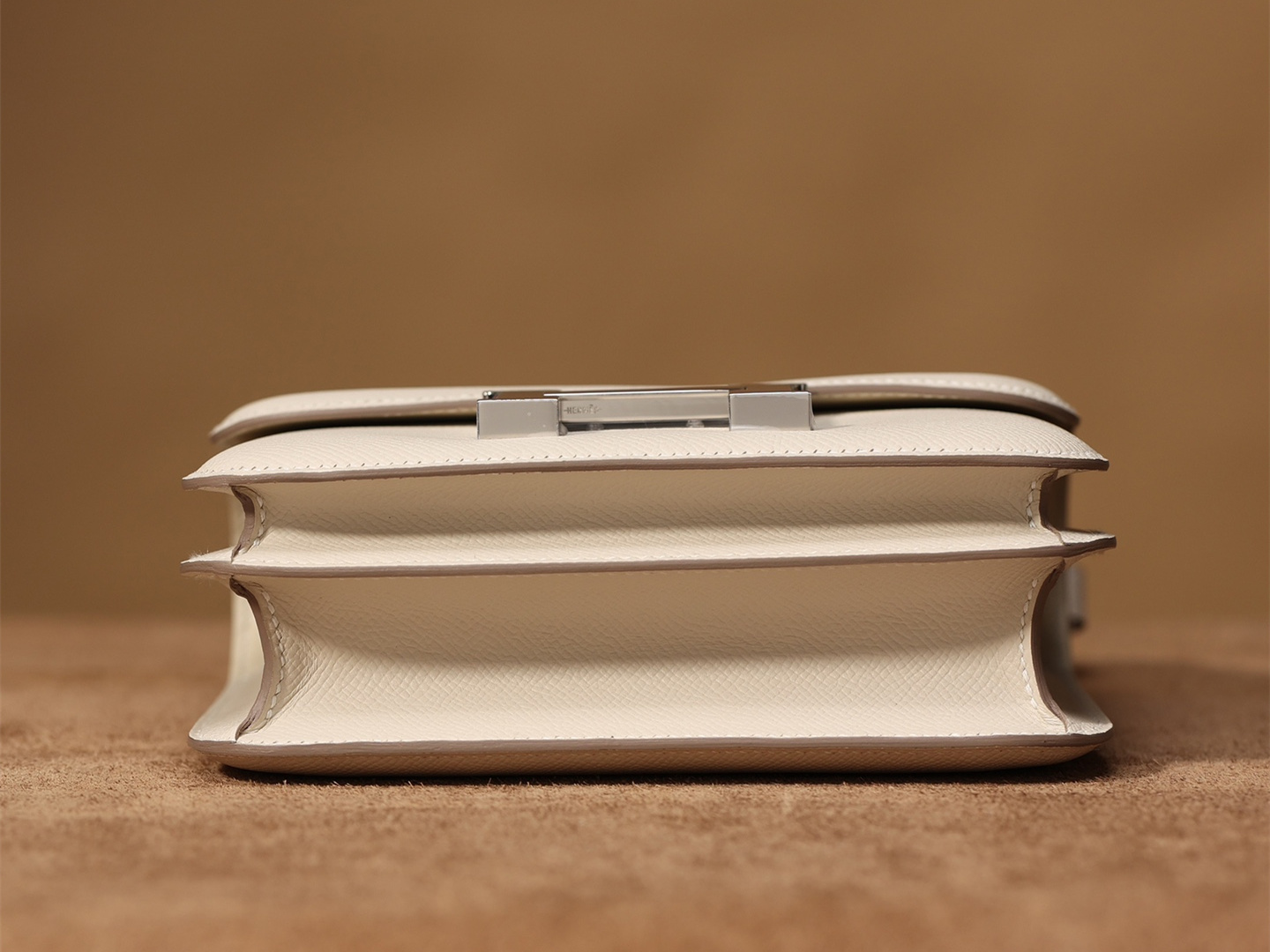 獨家正品級別高仿Hermes包包Constance系列奶昔白銀扣,採用百分百專櫃原產Epsom牛皮製作,並非市面上人造皮革,最大的區別是Epsom皮是通過機械壓印而得到的細緻紋理,帶有清晰的雙色調,同時纖細感中帶有光亮的小顆粒.而人造皮革一直都是劣質產品中低成本渾水摸魚的套路,完全不是一個級別的皮質.Hermes高仿在還原包體的形狀是根據專櫃相關尺寸1:1開模復刻.這一隻Constance系列奶昔白銀扣尺寸是規整的19X15X4CM.包身的立體感經過硬朗的皮革和純手工縫製均勻呈現,硬挺的姿身自重輕,不易刮傷非常耐用.