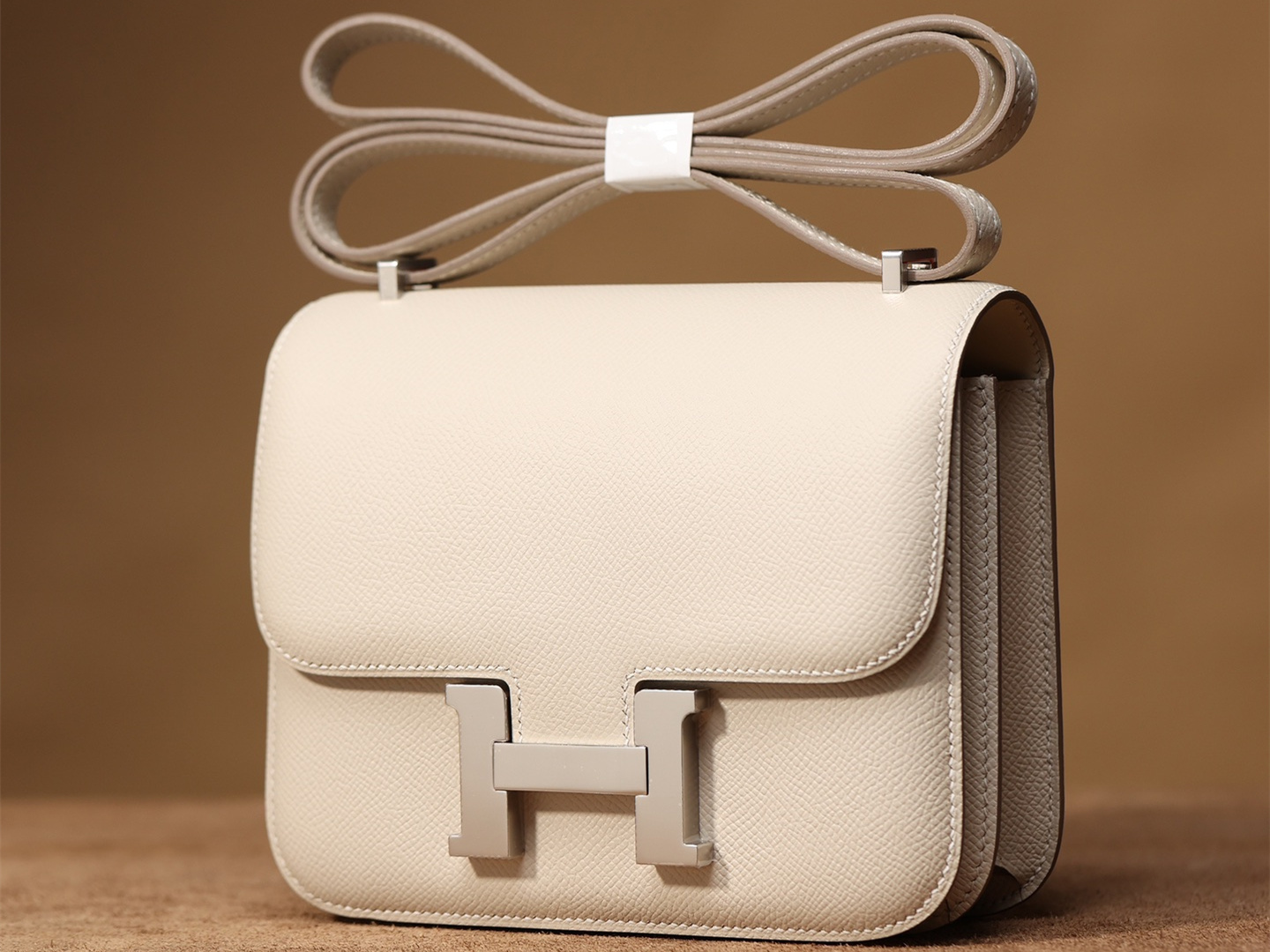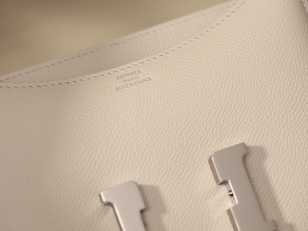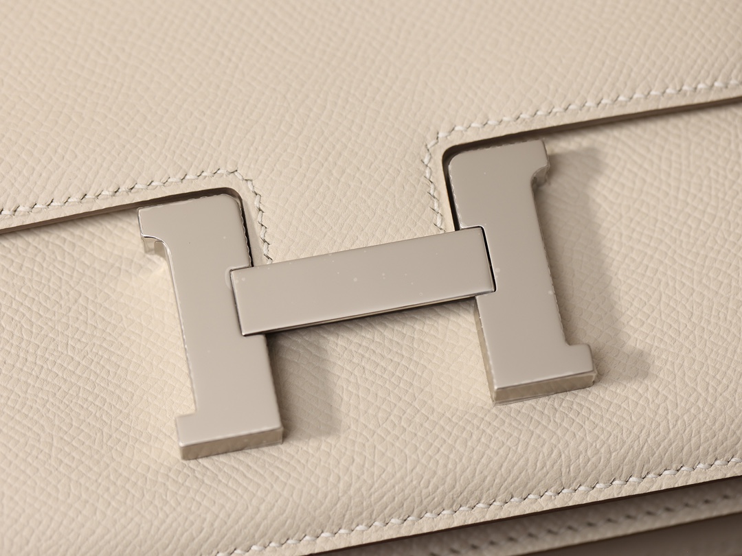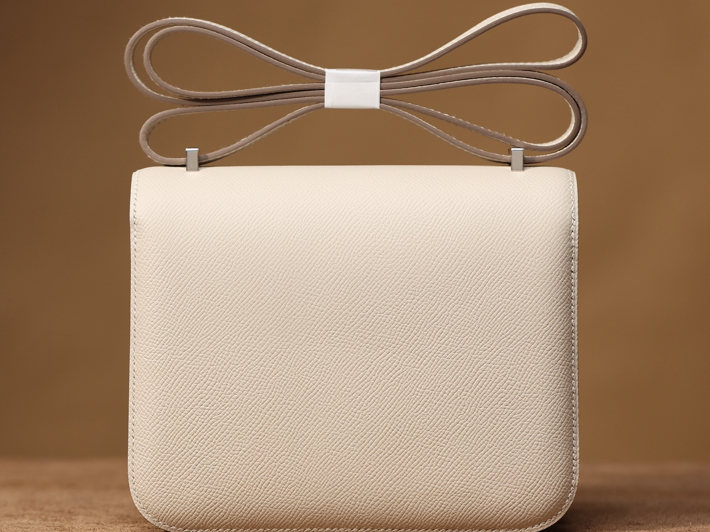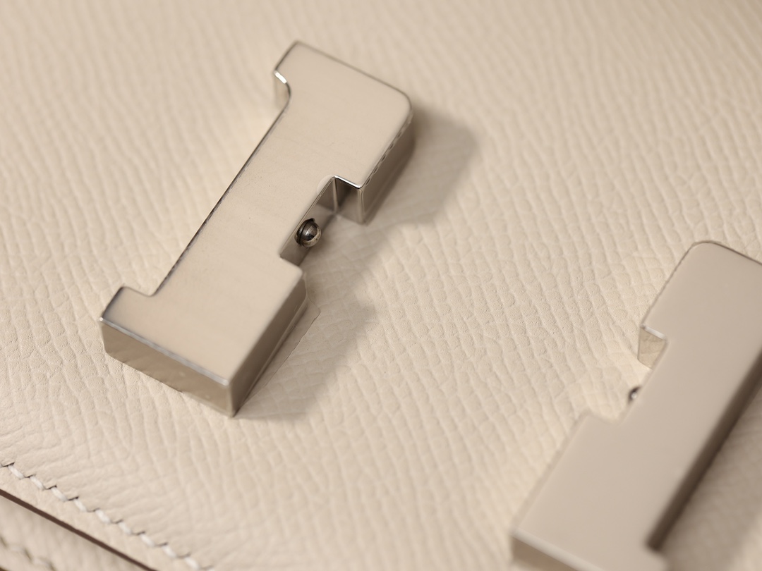 獨家正品級別高仿Hermes包包Constance系列奶昔白銀扣,採用百分百專櫃原產Epsom牛皮製作,並非市面上人造皮革,最大的區別是Epsom皮是通過機械壓印而得到的細緻紋理,帶有清晰的雙色調,同時纖細感中帶有光亮的小顆粒.而人造皮革一直都是劣質產品中低成本渾水摸魚的套路,完全不是一個級別的皮質.Hermes高仿在還原包體的形狀是根據專櫃相關尺寸1:1開模復刻.這一隻Constance系列奶昔白銀扣尺寸是規整的19X15X4CM.包身的立體感經過硬朗的皮革和純手工縫製均勻呈現,硬挺的姿身自重輕,不易刮傷非常耐用.