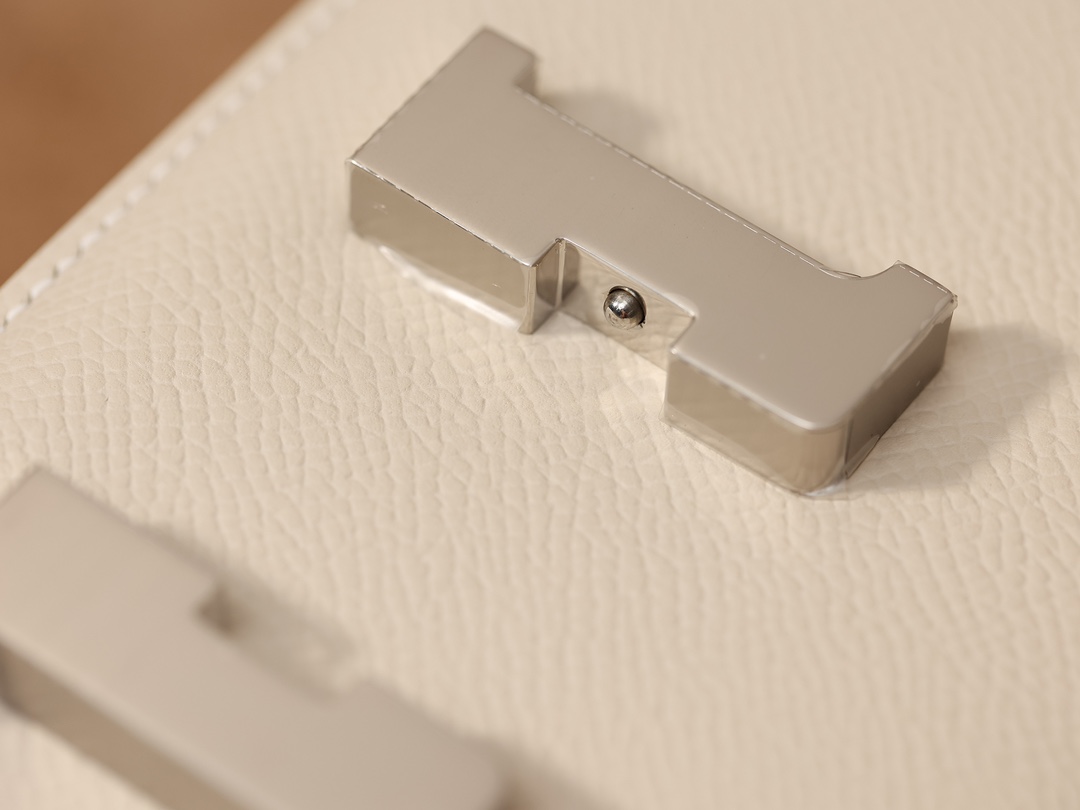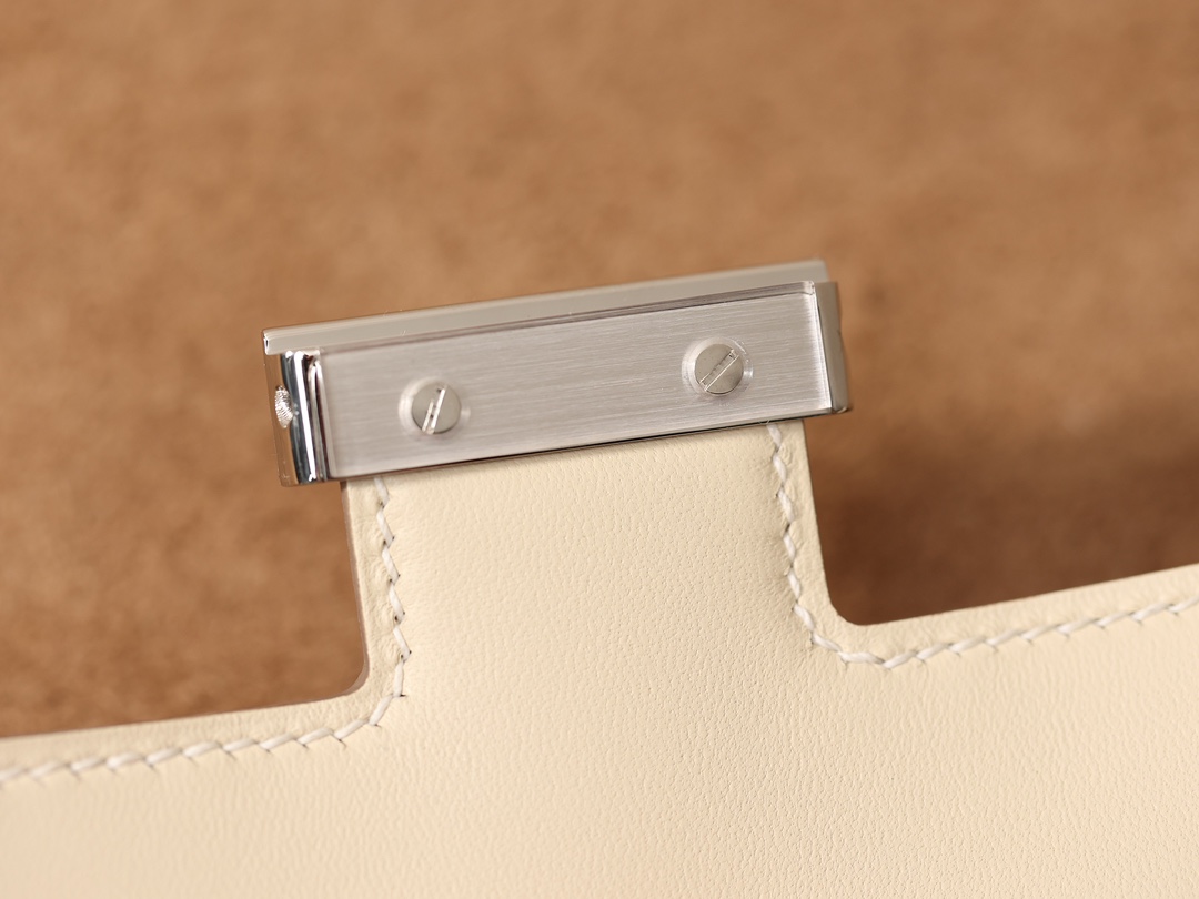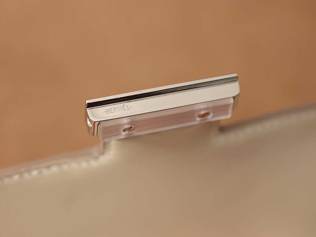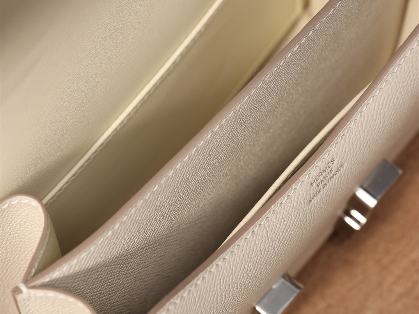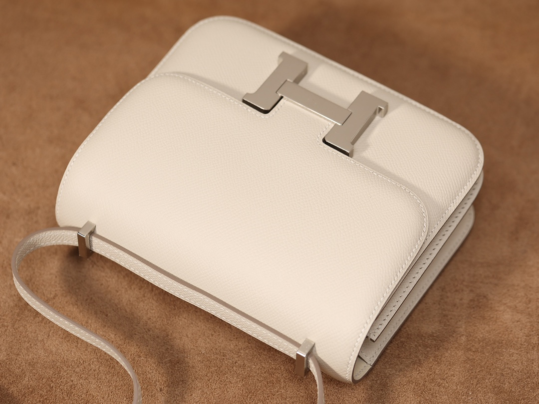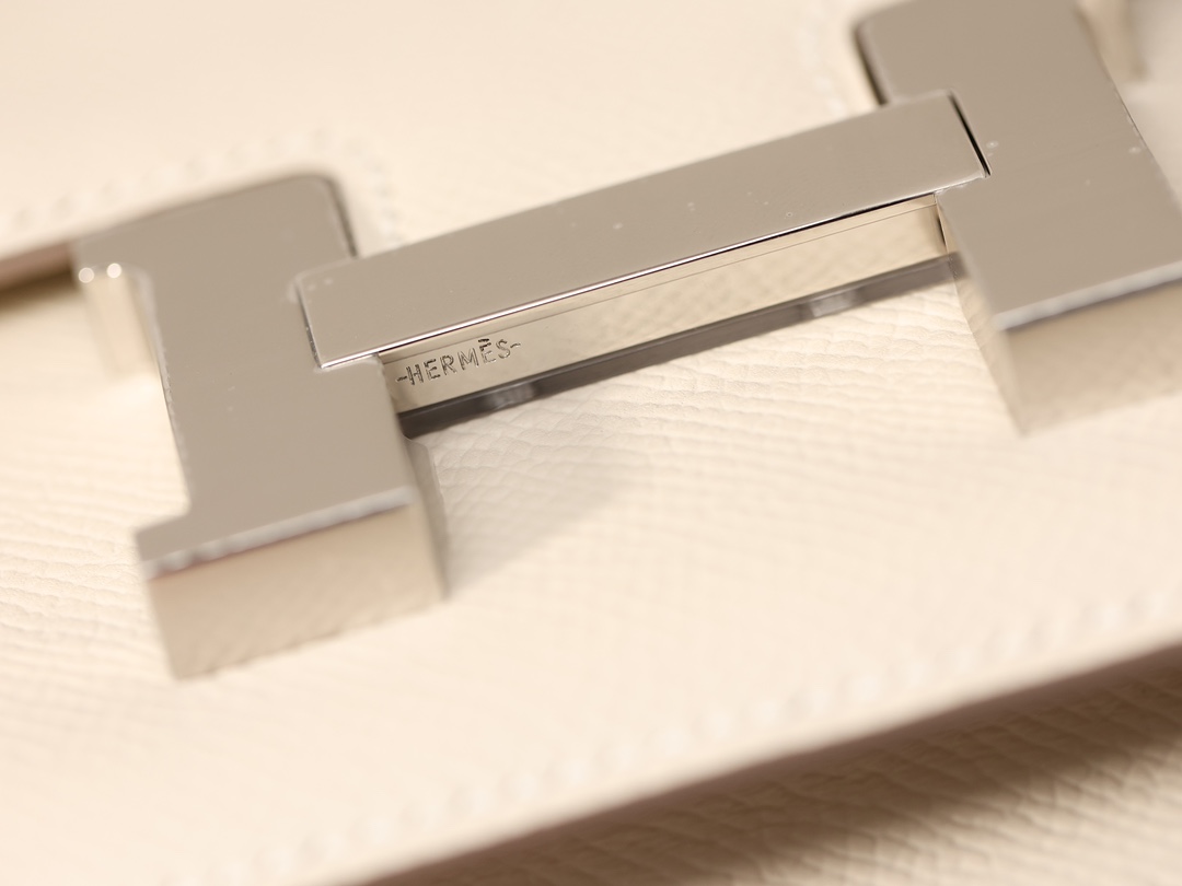 獨家正品級別高仿Hermes包包Constance系列奶昔白銀扣,採用百分百專櫃原產Epsom牛皮製作,並非市面上人造皮革,最大的區別是Epsom皮是通過機械壓印而得到的細緻紋理,帶有清晰的雙色調,同時纖細感中帶有光亮的小顆粒.而人造皮革一直都是劣質產品中低成本渾水摸魚的套路,完全不是一個級別的皮質.Hermes高仿在還原包體的形狀是根據專櫃相關尺寸1:1開模復刻.這一隻Constance系列奶昔白銀扣尺寸是規整的19X15X4CM.包身的立體感經過硬朗的皮革和純手工縫製均勻呈現,硬挺的姿身自重輕,不易刮傷非常耐用.
