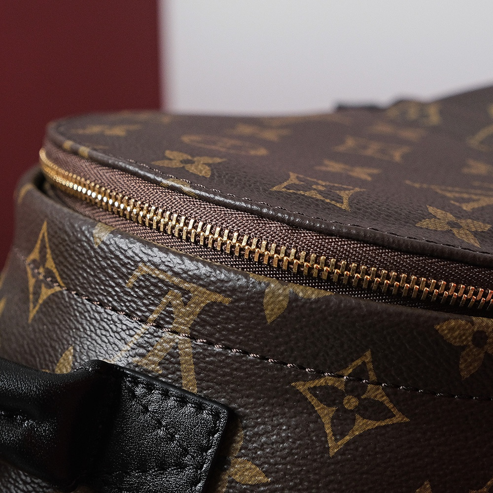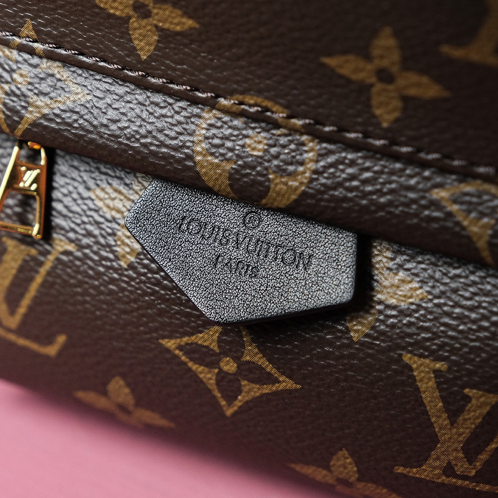 採用與專櫃同一種Monogram帆布,源材質是鹽化帆布後續經過塗層演變而成現狀的老花帆布.皮質上的印花每一處的標準還原定格復原在包面,從字母弧度和印花的控距可對比原裝正品.小巧玲瓏的版型,原廠帆布的厚實呈現一種立體感完美無缺.同時原單LV雙肩包為帆布縫合,採用德國進口莎菲棉線純手工縫合,外縫線細節精準還原.