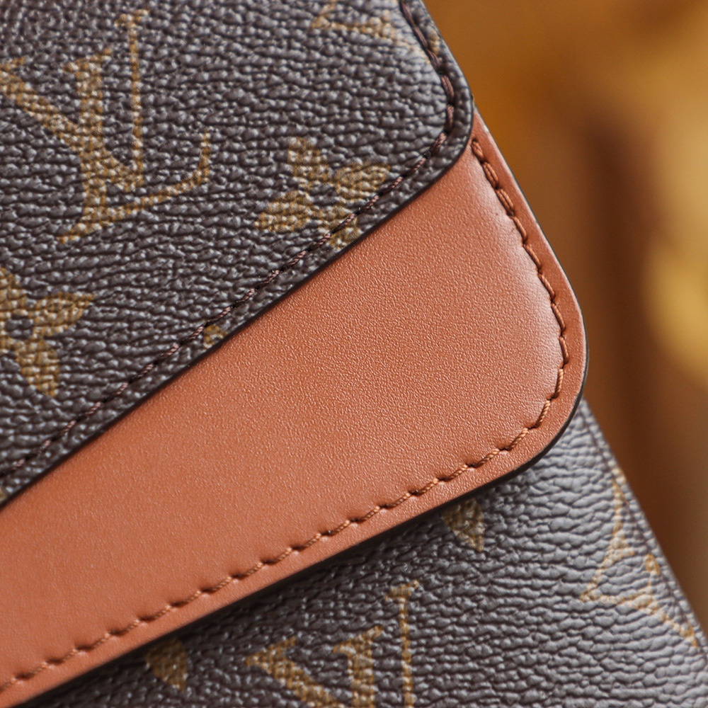 對於精仿LV來說,針對每一個細節之處都及其講究,包形的立體感詮釋了手工手法的重要性.正面部分帆布與皮革的搭配,原單LV翻蓋包採取外縫線穿孔縫合,純手工製作完全貼近原裝正品.外露的縫線由感而發的突出每一針每一線的細節處理,整齊工整,與劣質工藝形成明顯的比對.