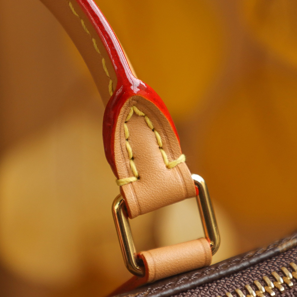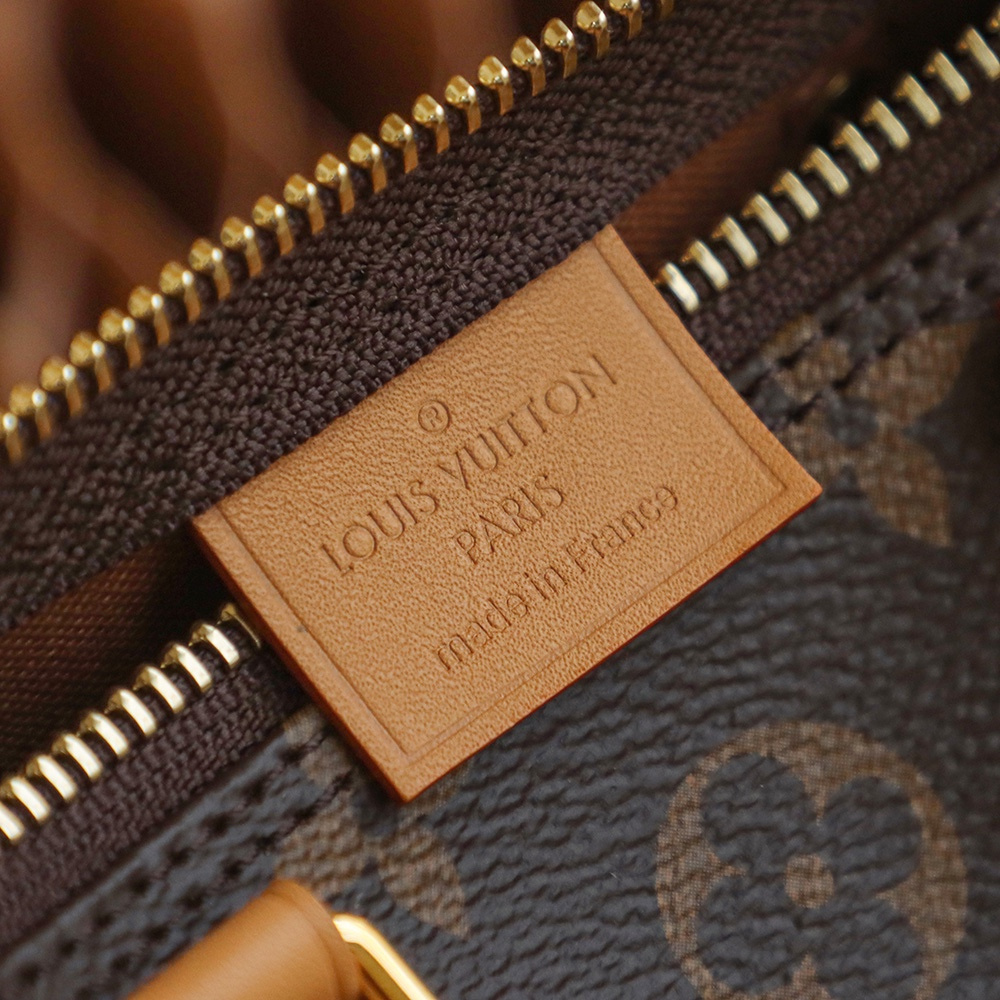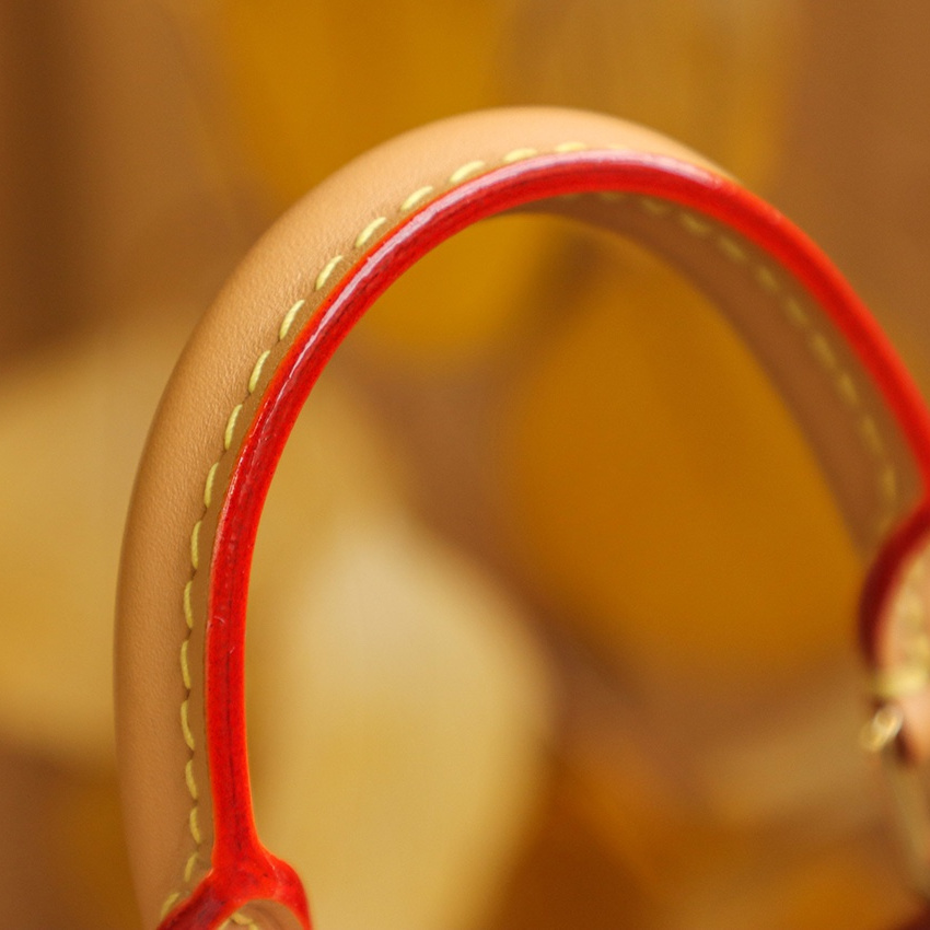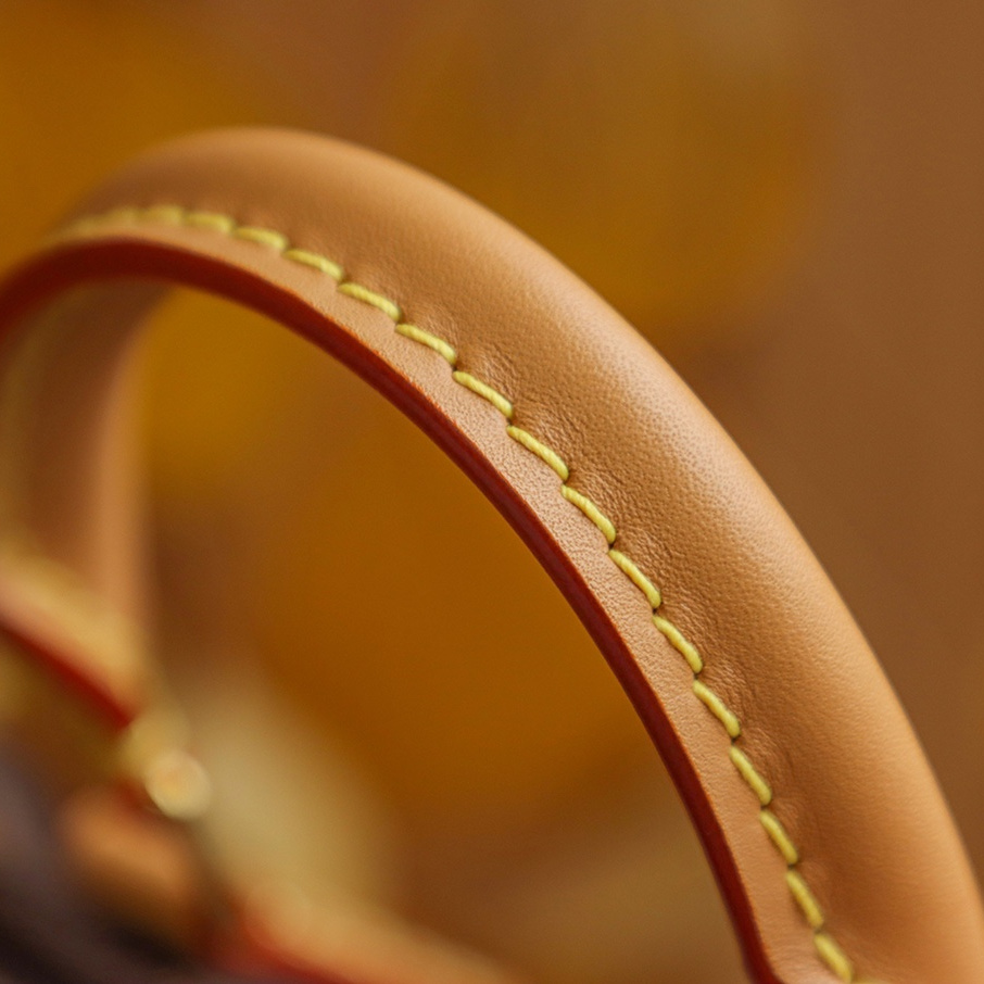 4面形帆布,控距相關尺寸標準,每一處印花標準位置,由分解原版包型了解裁剪區域,後續通過縫合機制達到整體的效果.圓邊形狀對於復刻難度更加講究工藝技術.兩邊帆布搭配雙層皮革縫製.體現原單LV包包頂級的製作過程,無線頭外露更為極致還原正品效果.