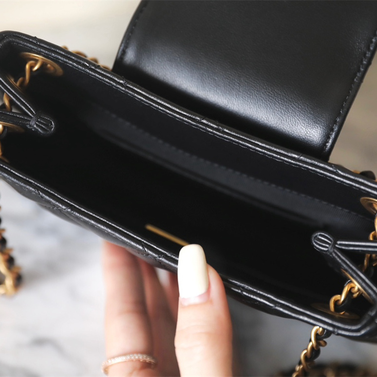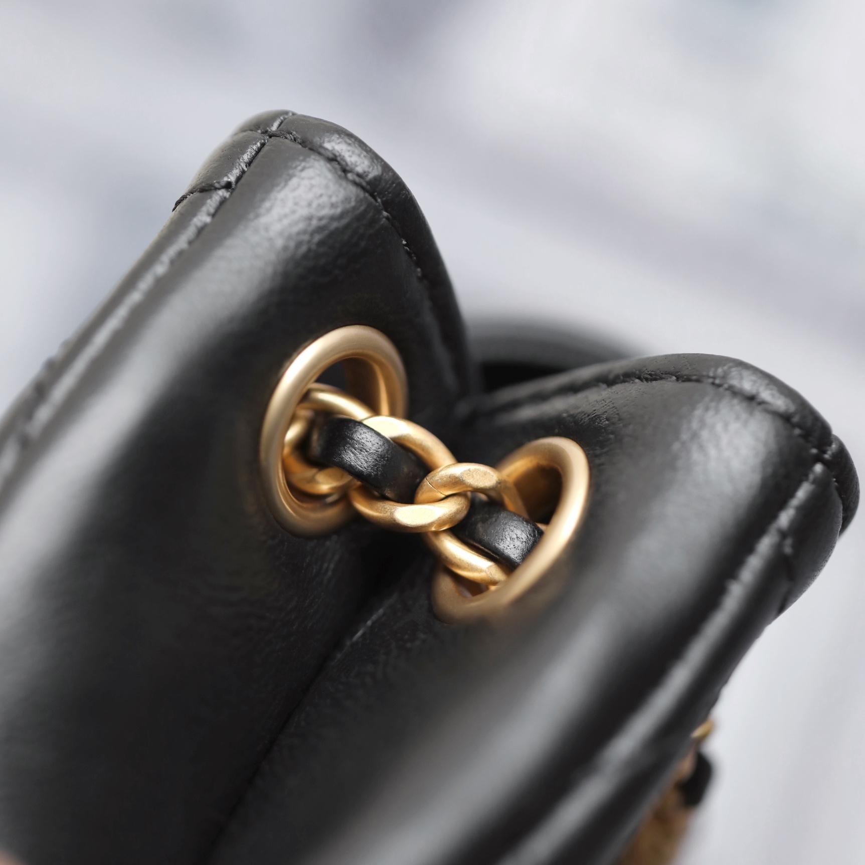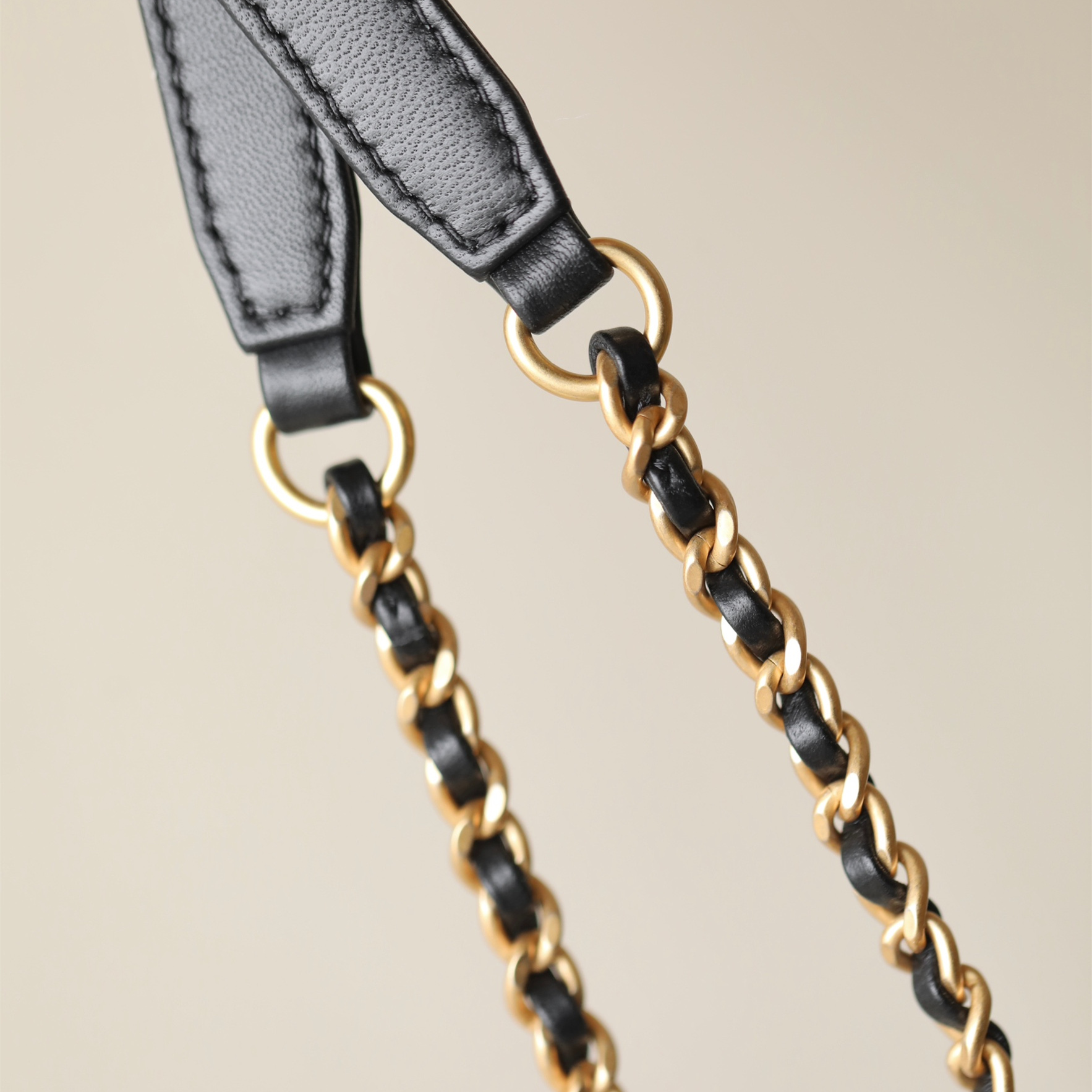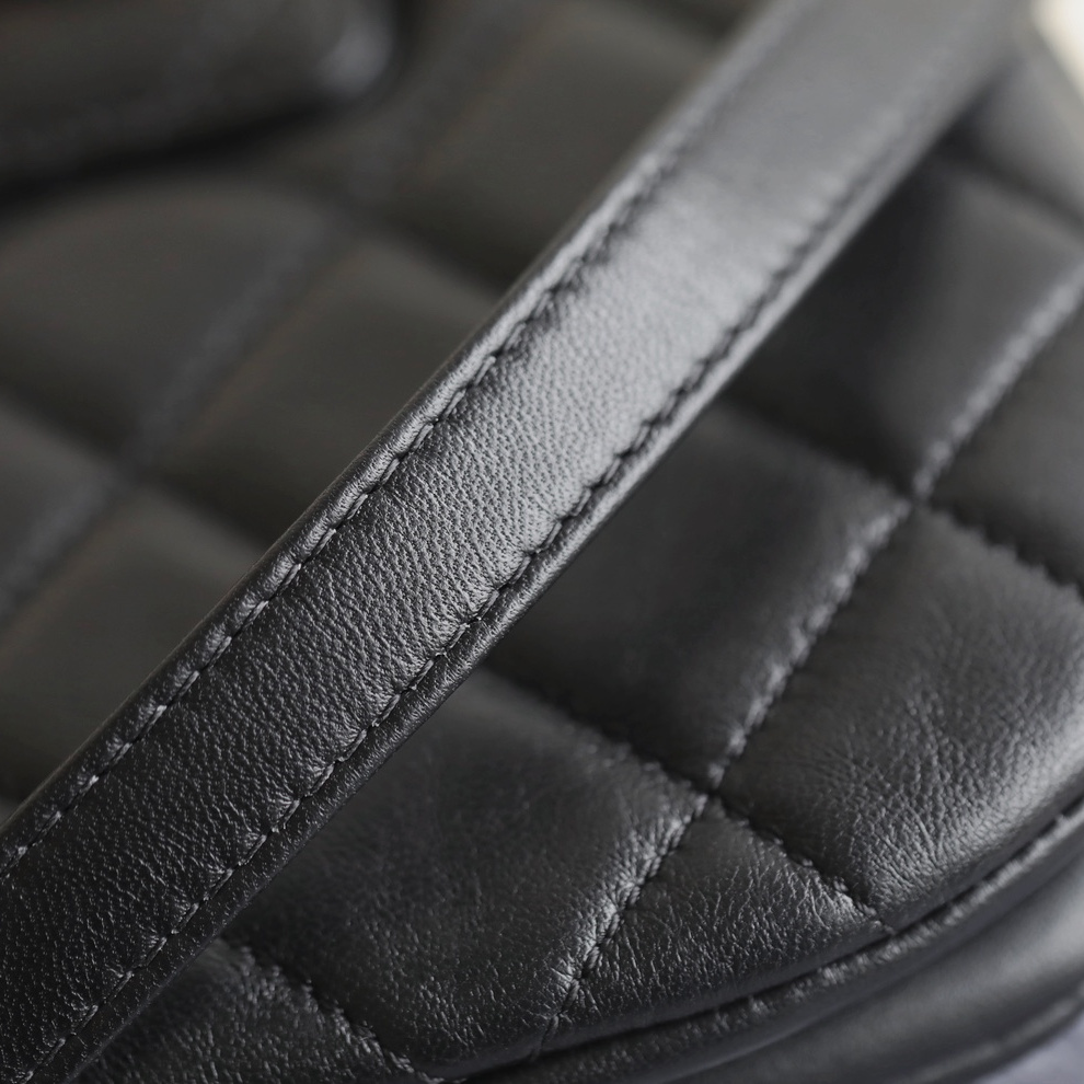 LOGO和圓弧度設計,融合了古典魅力與現代優雅.黑色皮革材質的選擇,完美契合了當代女性的審美理念.根據原版精確1:1復製的這款包包,不僅在包身結構上輕薄,而且提供了靈活的雙滑鏈條設計,適應多樣的背法.