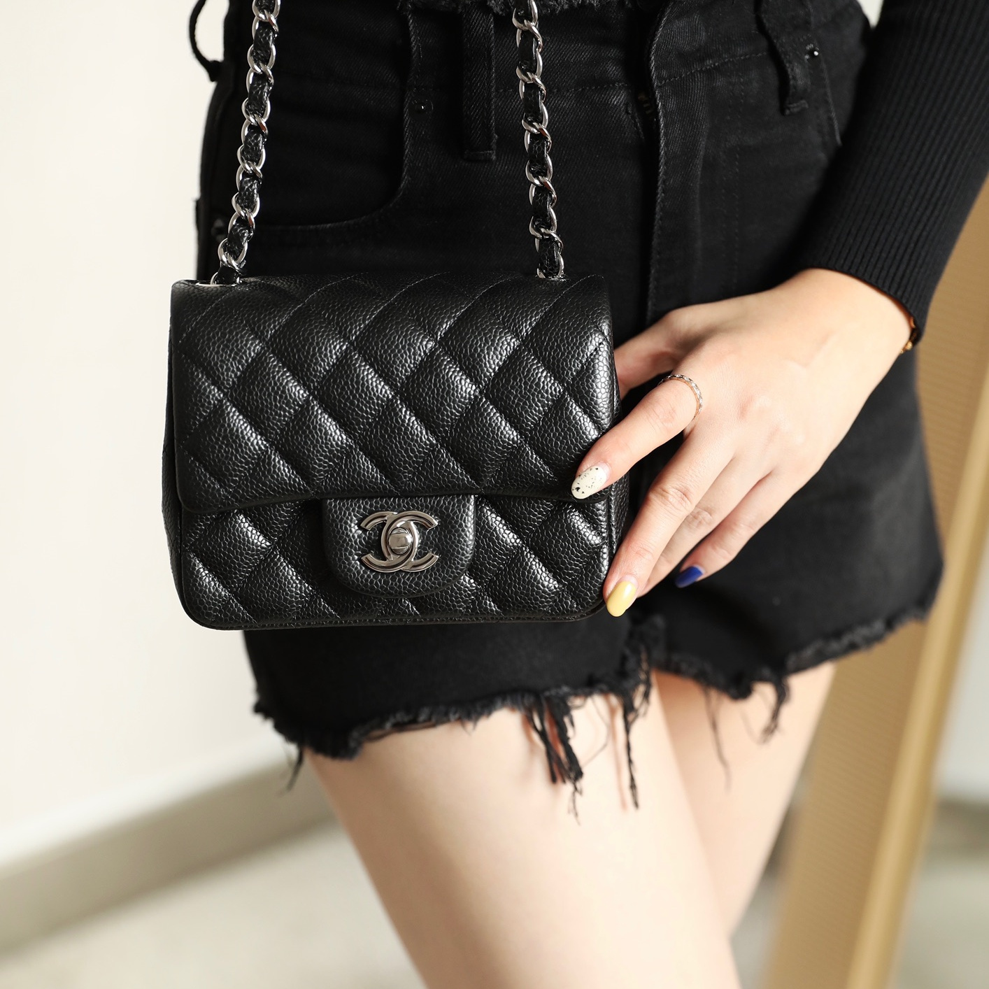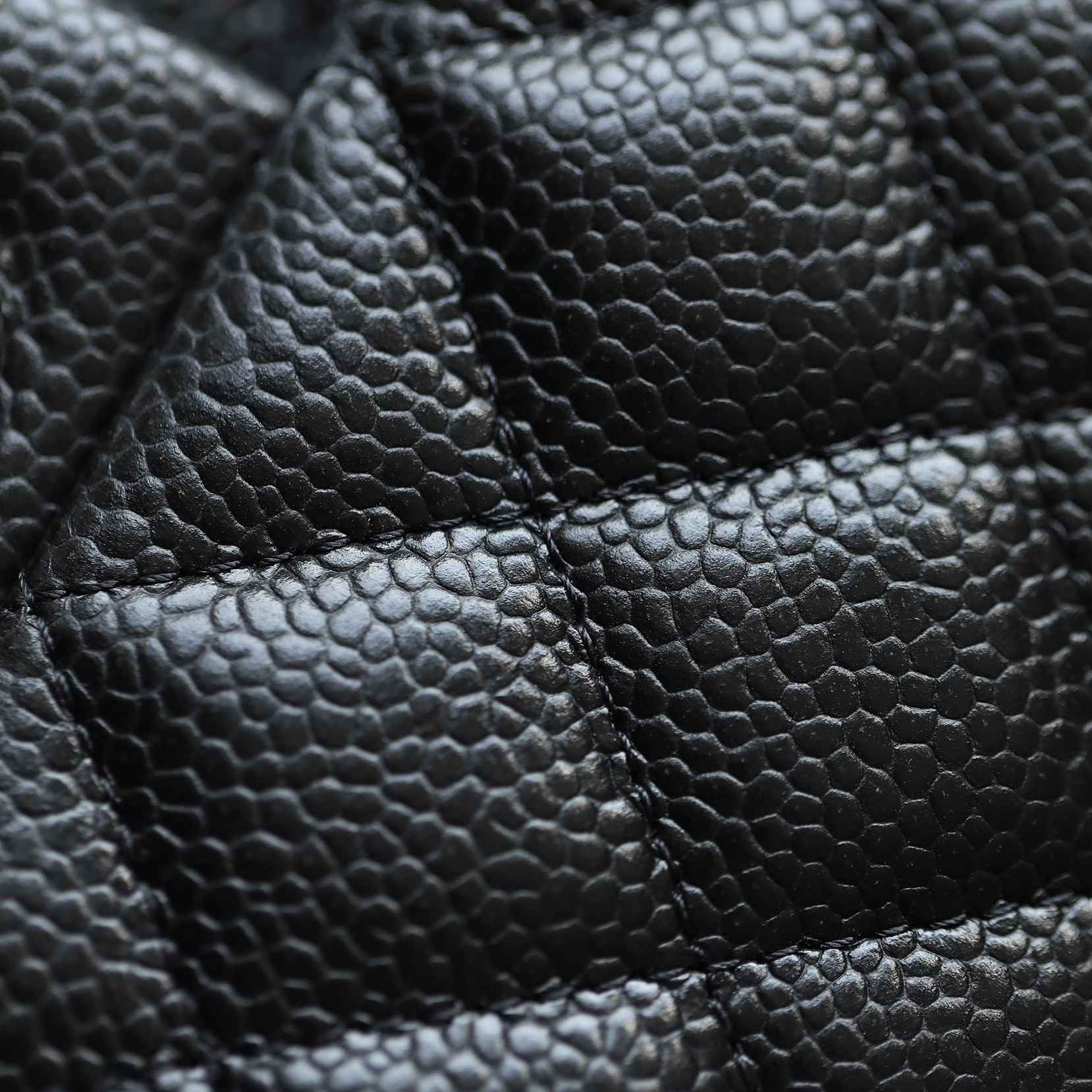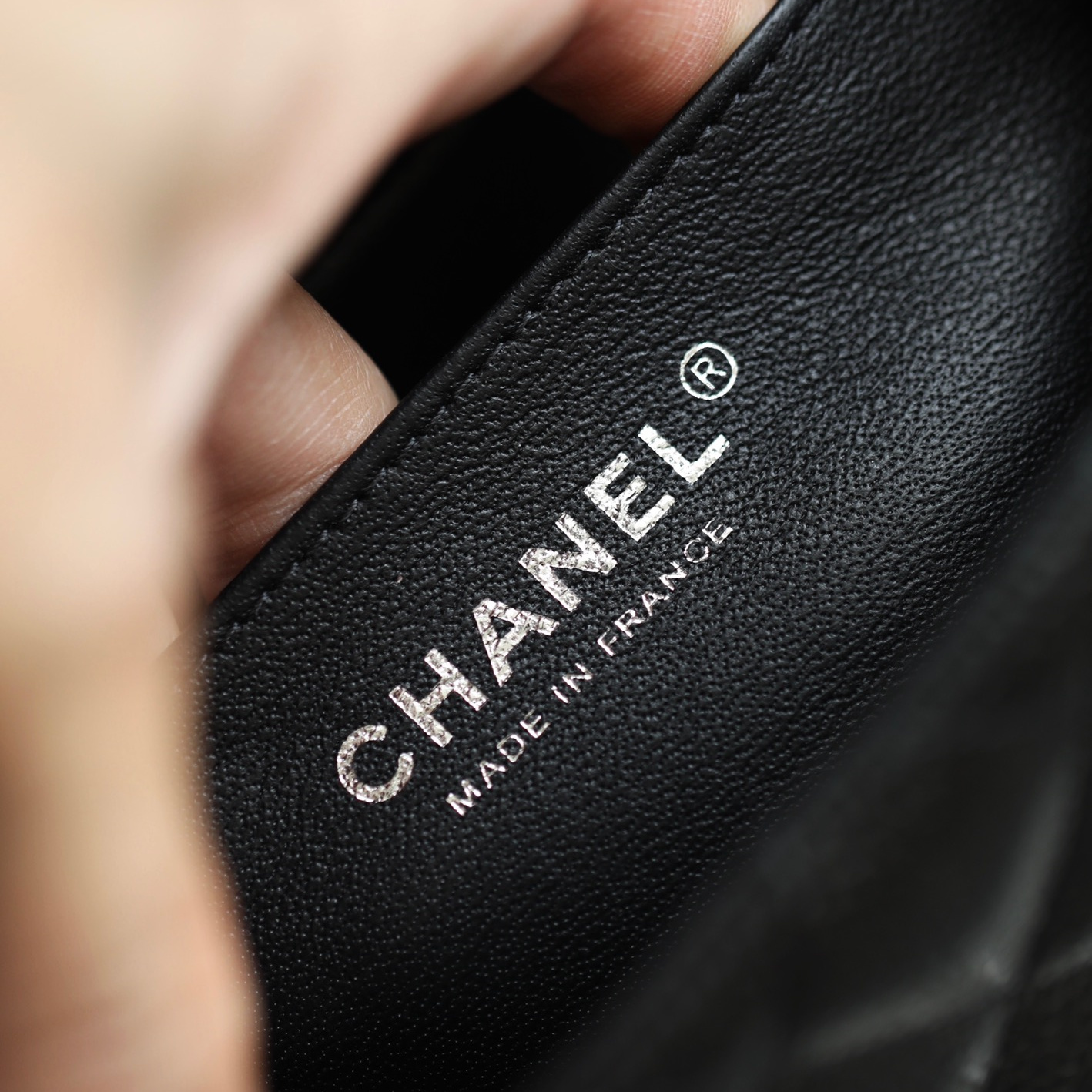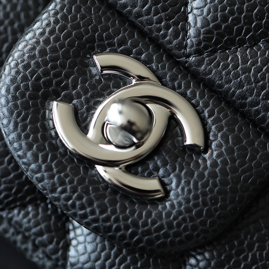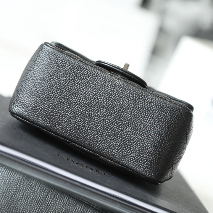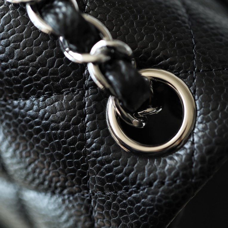 在皮質上沿用了同步原版的Haas皮革,被譽為高貴的魚子醬牛皮革.皮料的部分呈現出典雅黑的光澤度,顆粒感明顯,類似鱷魚皮,但手感上會比較鱷魚皮更加柔軟舒適.而原單Chanel口蓋包對於標誌性的衍縫線菱格,都以原廠縫線製作,杜絕使用機車縫線的粗糙劣質.