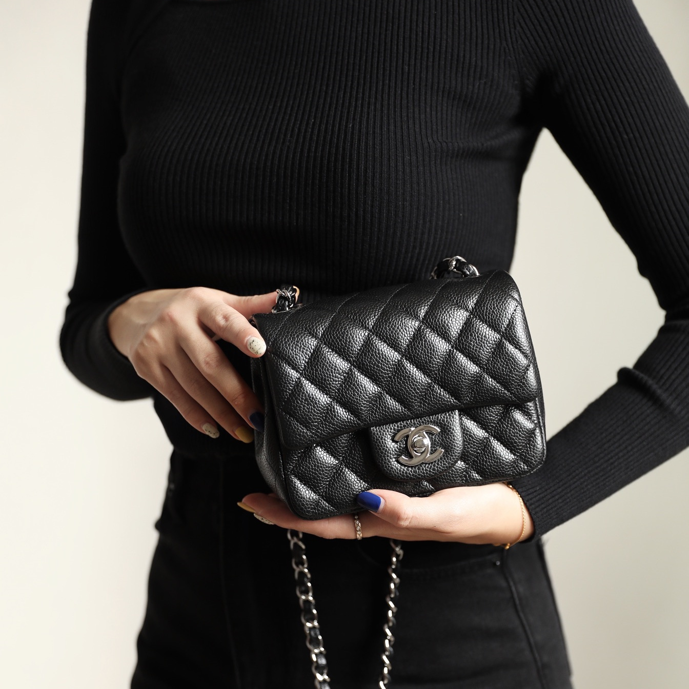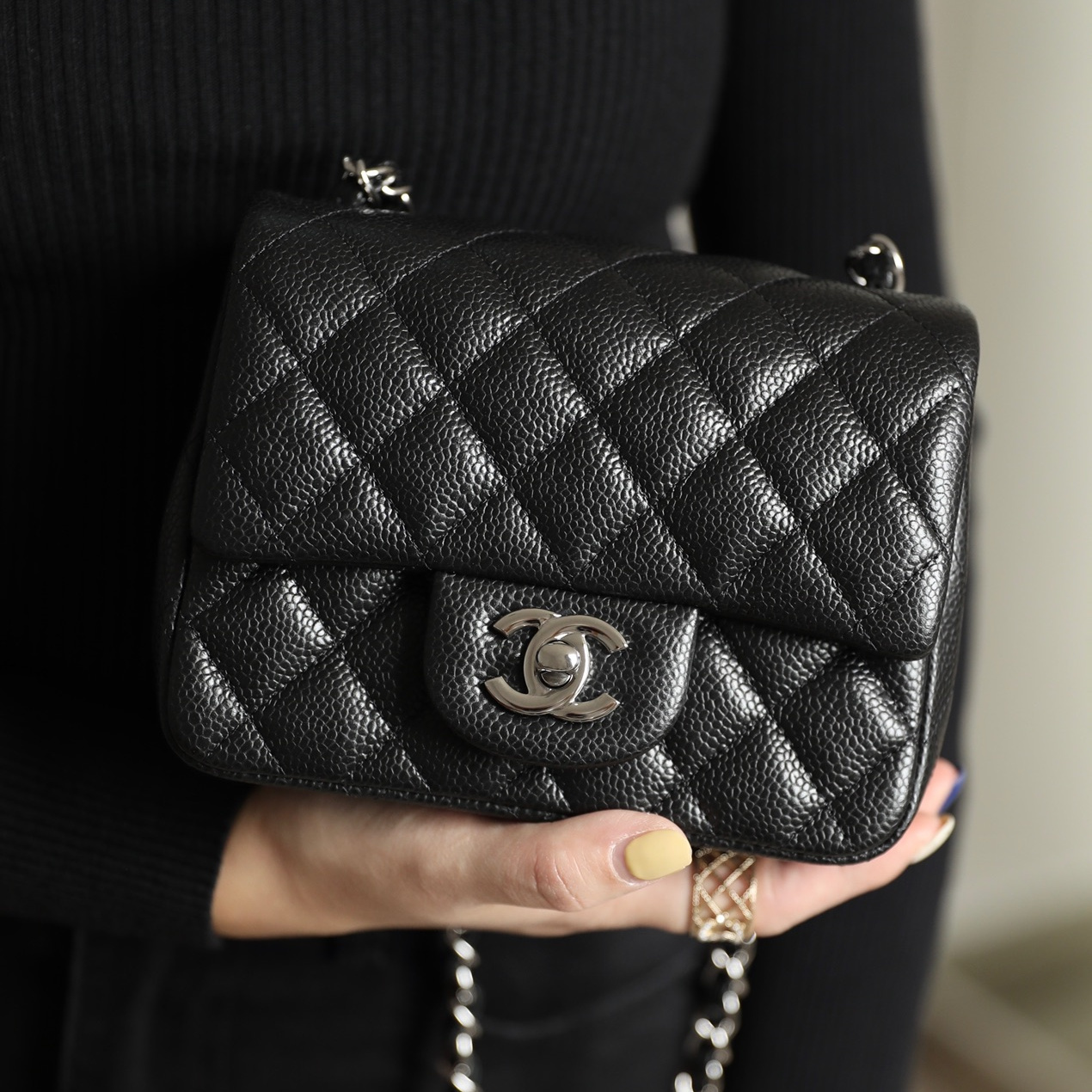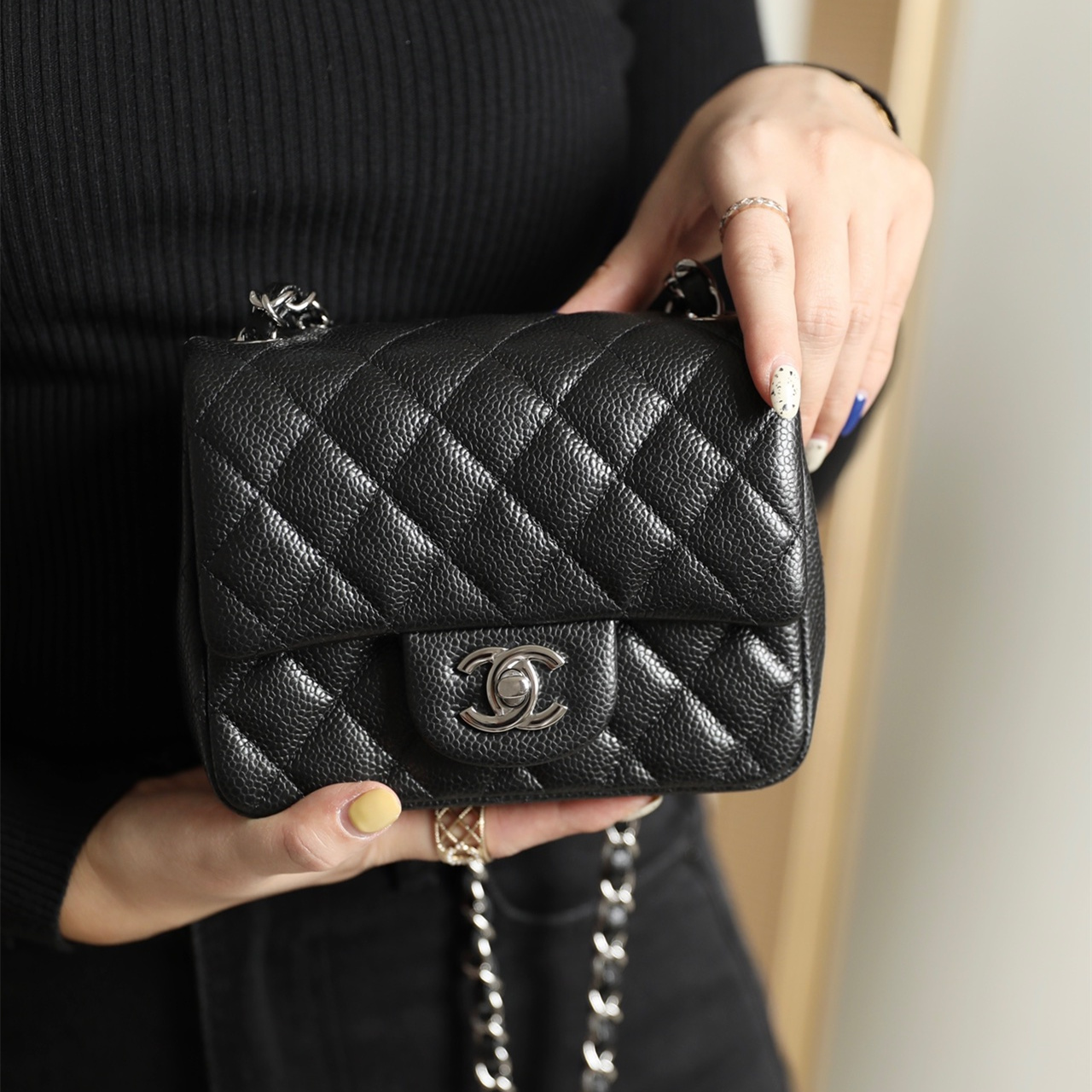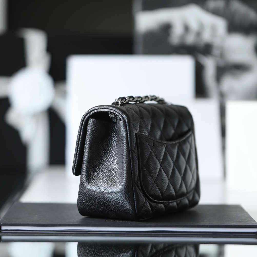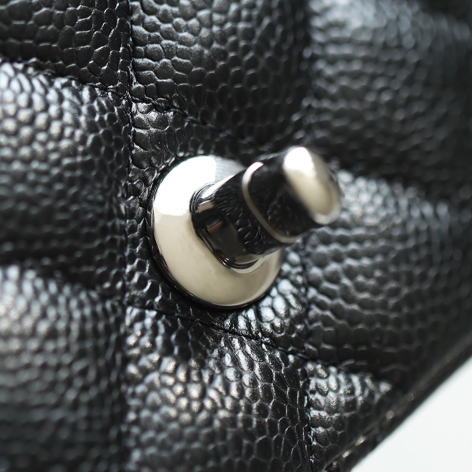 在皮質上沿用了同步原版的Haas皮革,被譽為高貴的魚子醬牛皮革.皮料的部分呈現出典雅黑的光澤度,顆粒感明顯,類似鱷魚皮,但手感上會比較鱷魚皮更加柔軟舒適.而原單Chanel口蓋包對於標誌性的衍縫線菱格,都以原廠縫線製作,杜絕使用機車縫線的粗糙劣質.