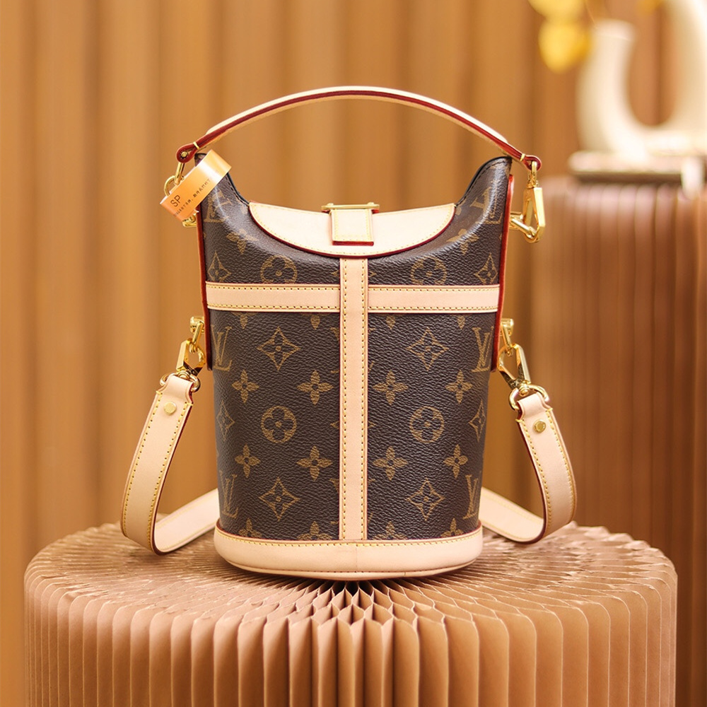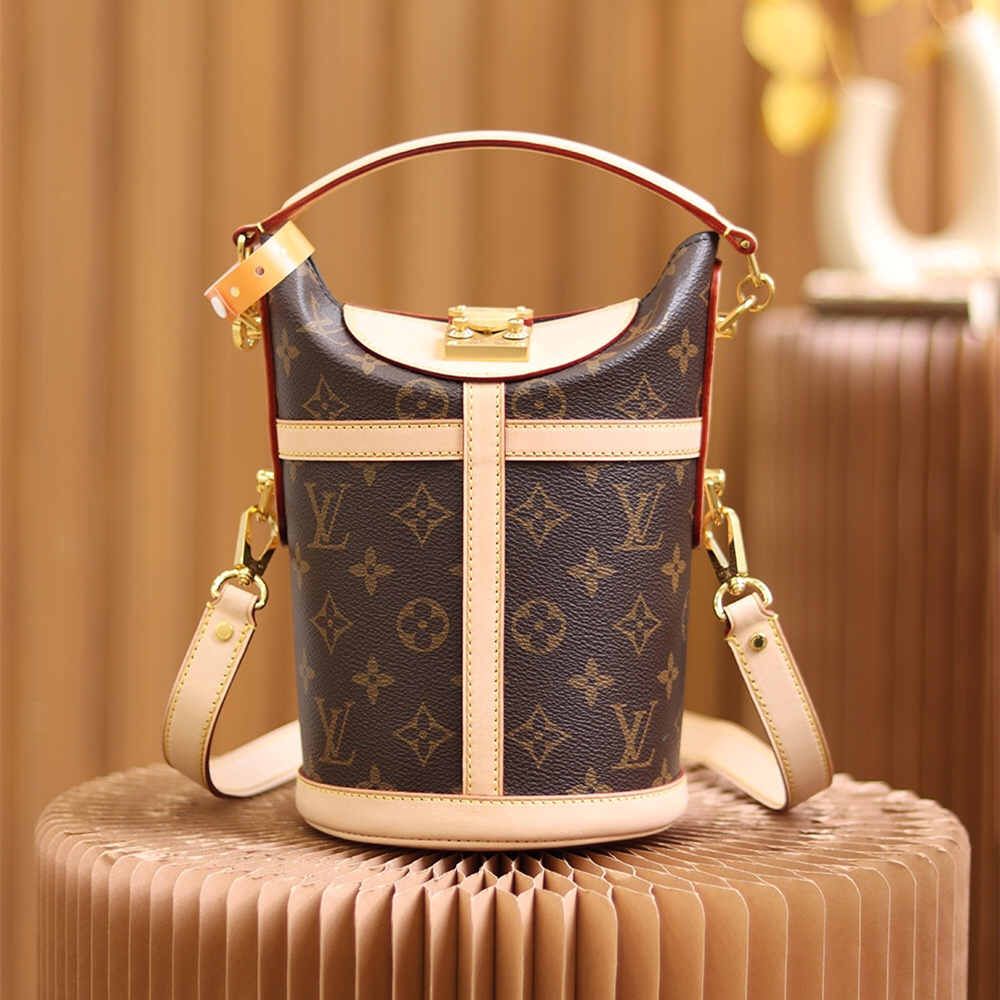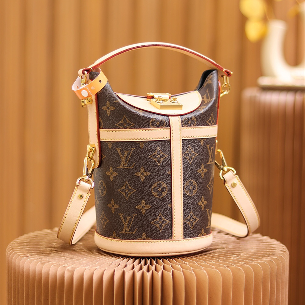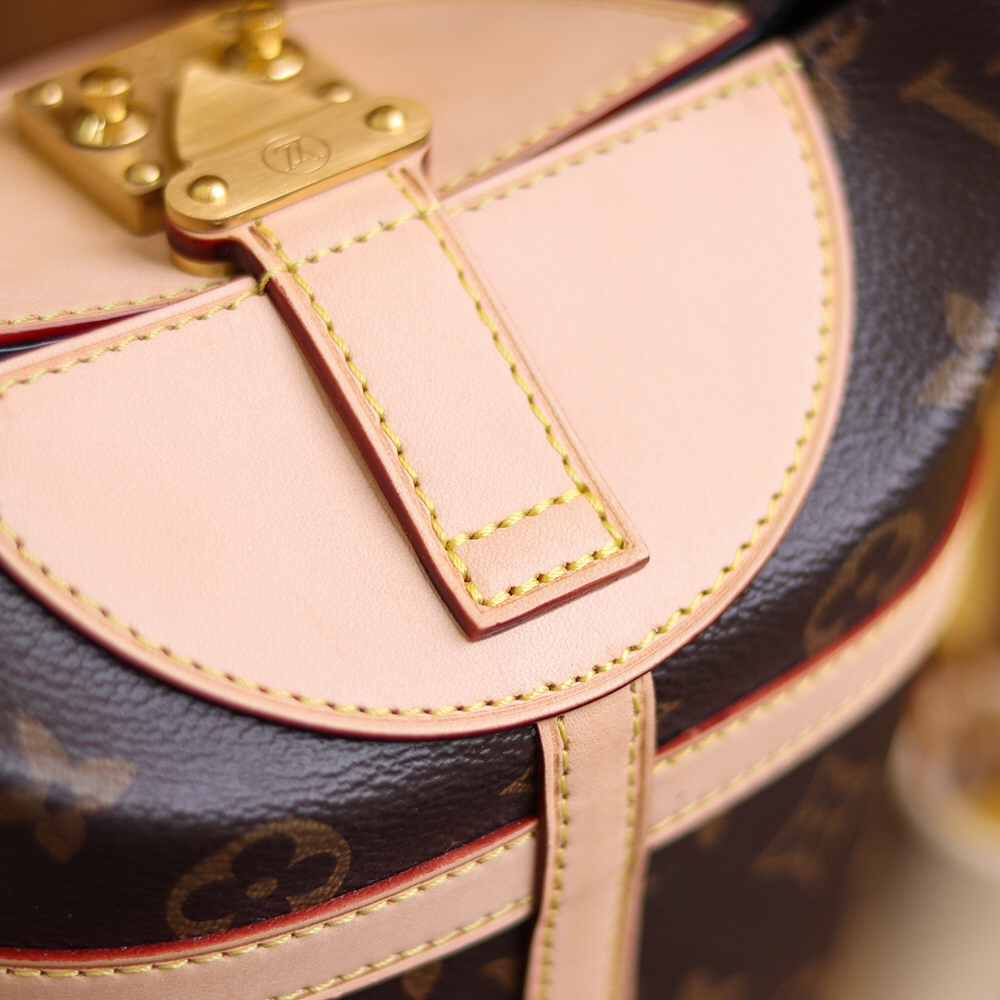 硬挺的包型,無論是手提裝飾或者是單肩 斜跨背戴原單高仿包包所呈現的質感和手感完全1:1還原.圓形設計帆布對位裁剪,精準達到印花LOGO標準把控.高仿LV單肩包實現了百分之99無限接近專櫃品質.正面部分則是以皮革縫製十字結構,利用了外縫線設計.