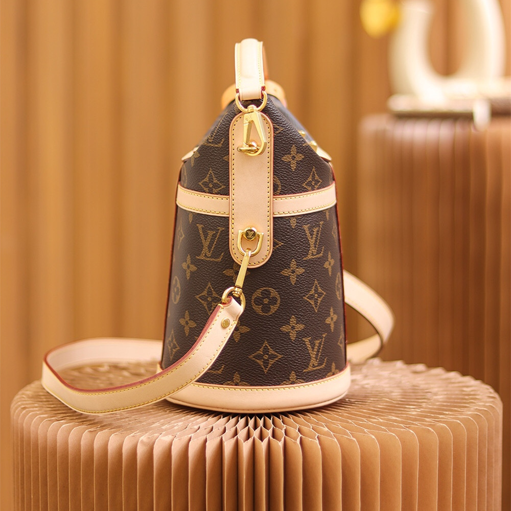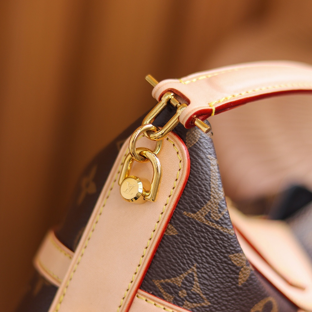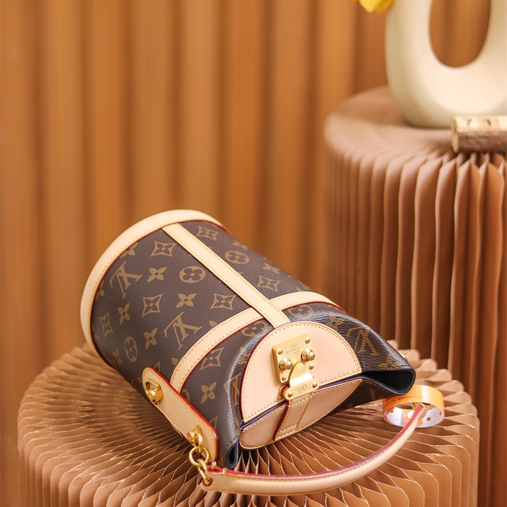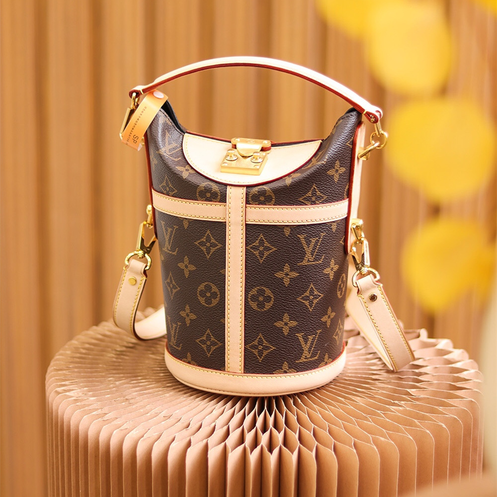 硬挺的包型,無論是手提裝飾或者是單肩 斜跨背戴原單高仿包包所呈現的質感和手感完全1:1還原.圓形設計帆布對位裁剪,精準達到印花LOGO標準把控.高仿LV單肩包實現了百分之99無限接近專櫃品質.正面部分則是以皮革縫製十字結構,利用了外縫線設計.