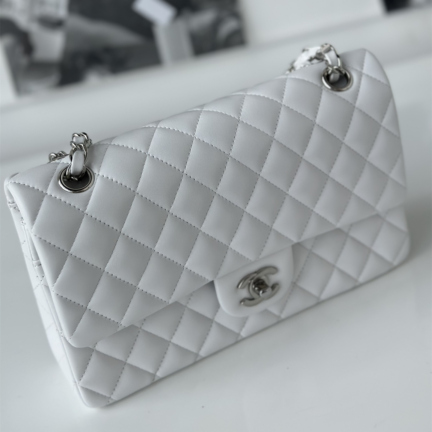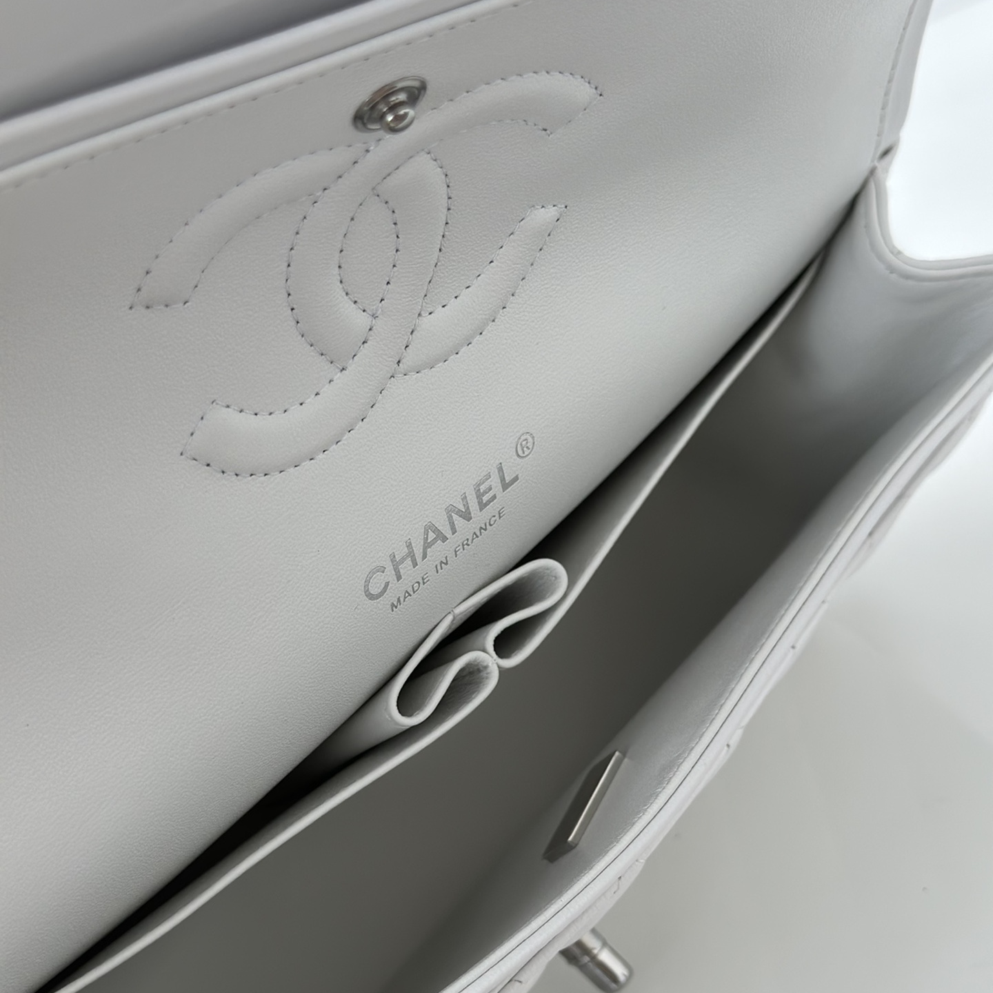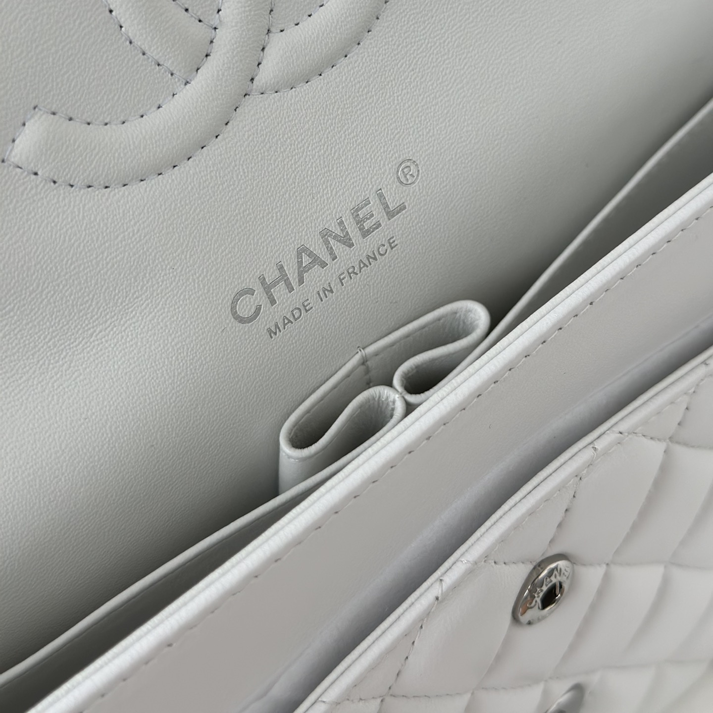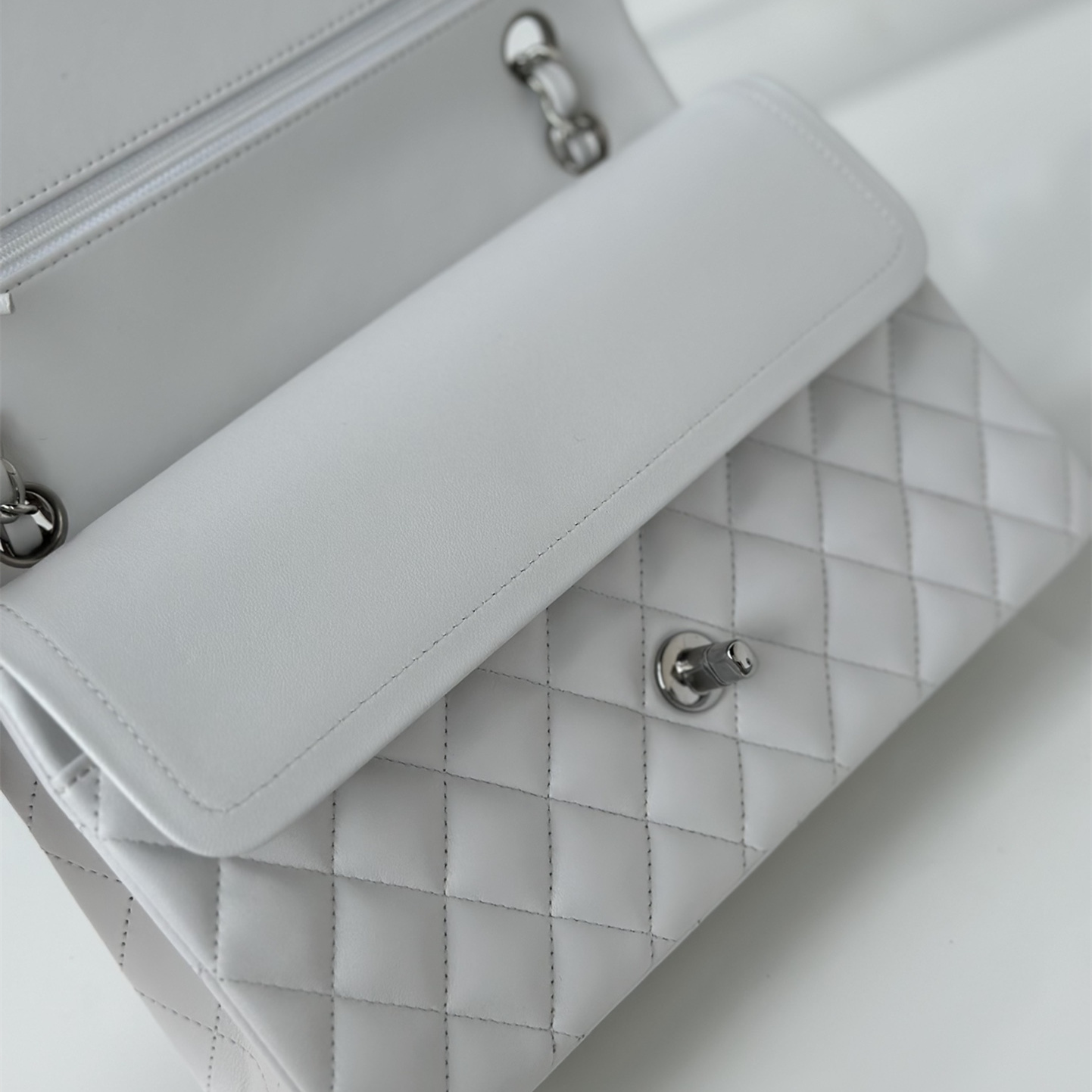 以傳統的口蓋包作為主體設計,具有高級感同時出淤泥而不染的白色小羊皮佔據絕大部分的高端品位,其中包身結構依舊是根據原裝正品Chanel高仿包進行1:1打造還原.每一處包體的手感延伸到體積大小均為百分之99的還原.毫無差別的製作才能夠體現出Chanel復刻A貨的精益求精.