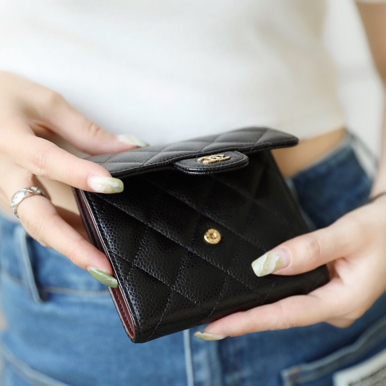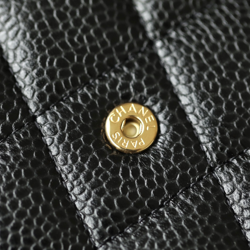 此次升級原單香奈兒短夾是採用了同步專櫃正品一致的Caviar-leather魚子醬皮純手工製作而成,皮質的手感充滿飽和的質感,柔軟適中並且配合絲滑流暢的包身完全融為一體.其紋路顆粒明顯,並且帶有較為明顯的光澤.衍縫線的設計是Chanel標誌性的設計.
