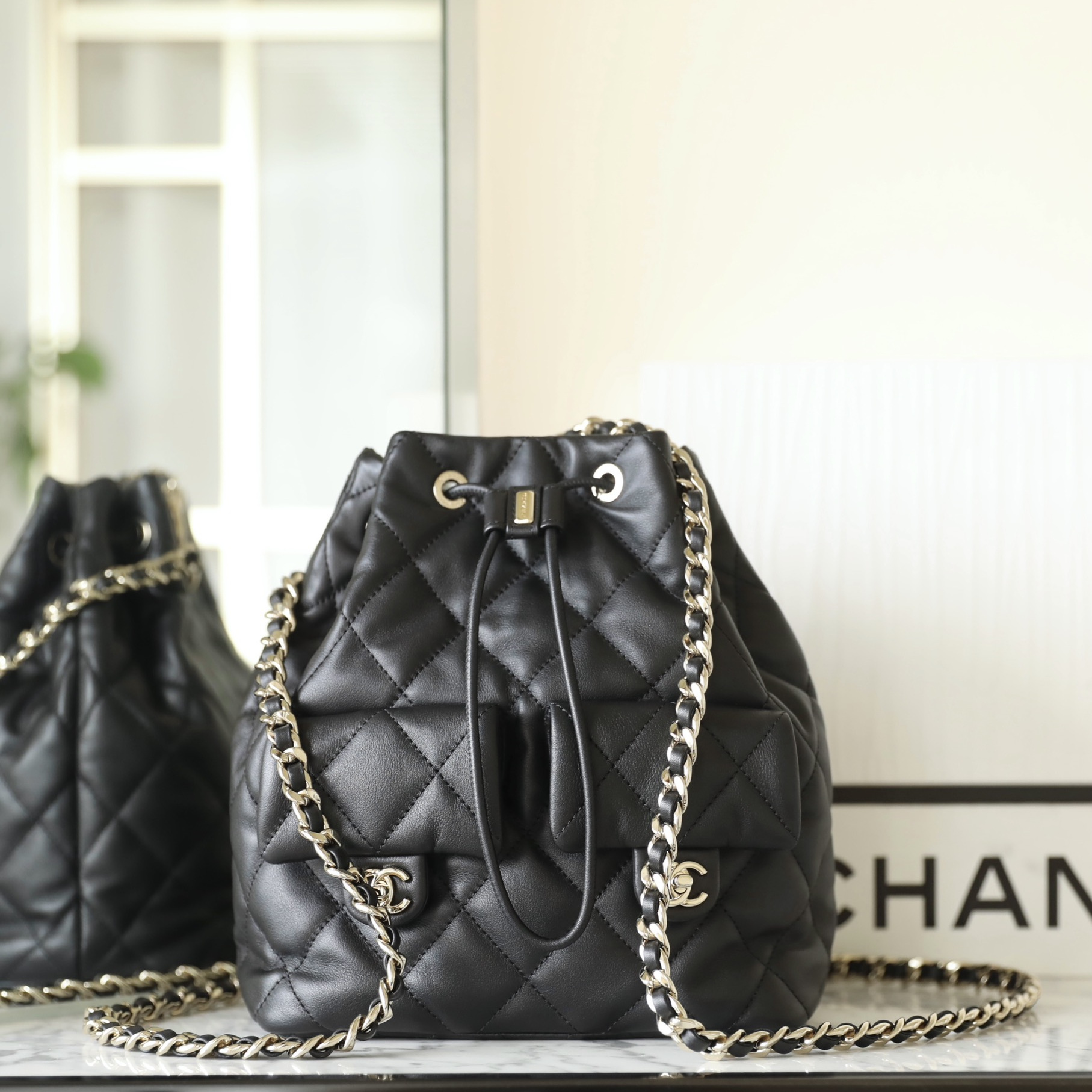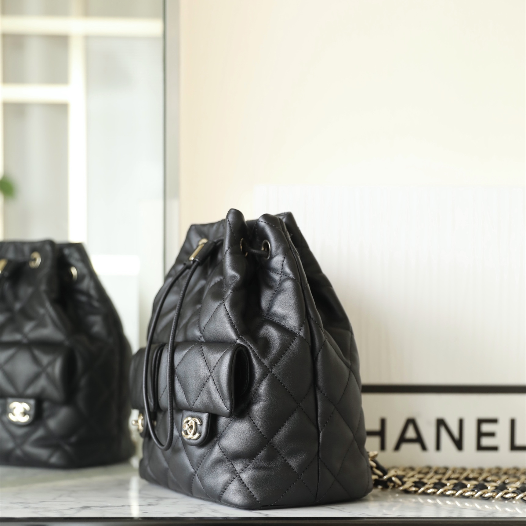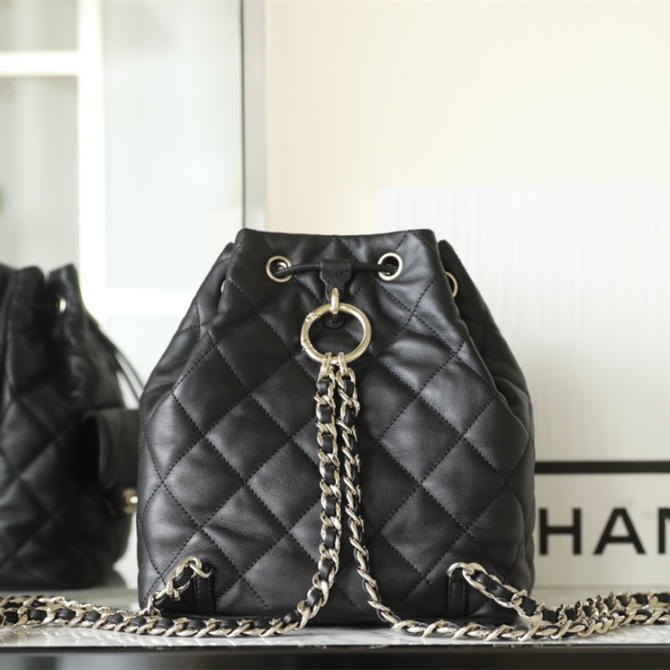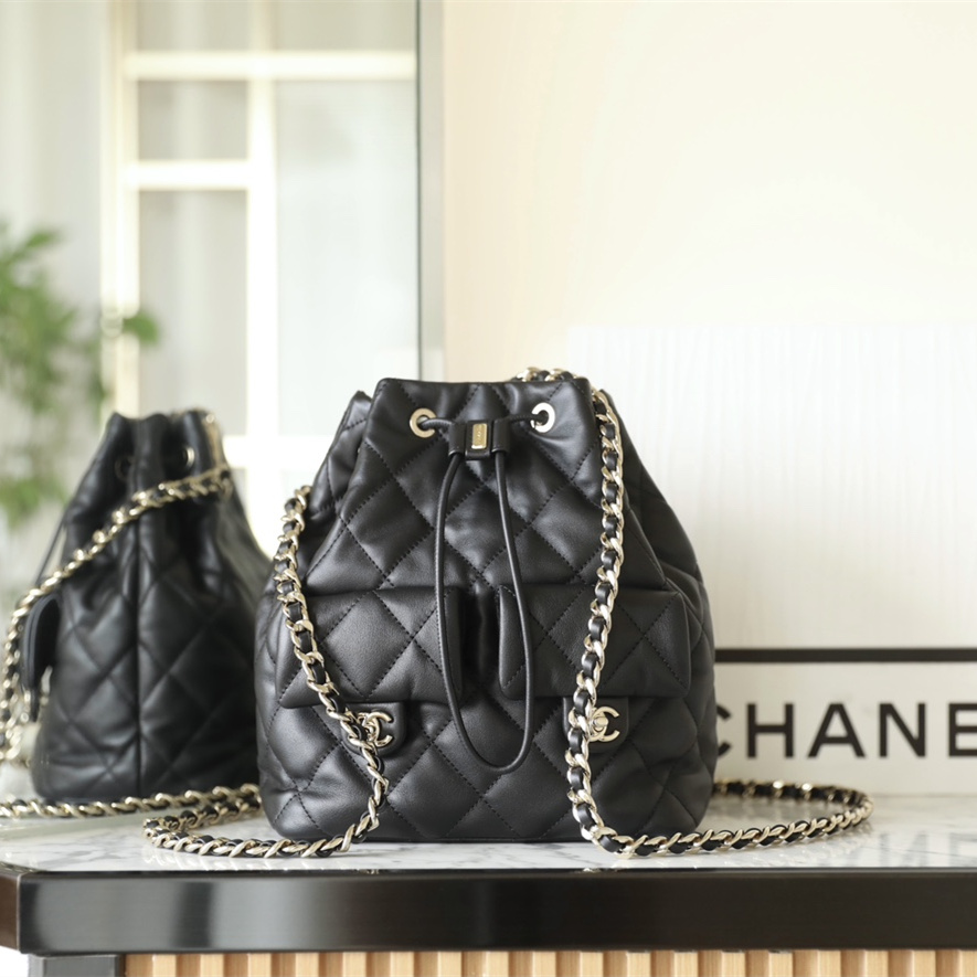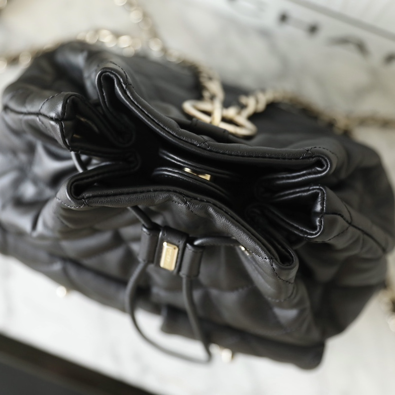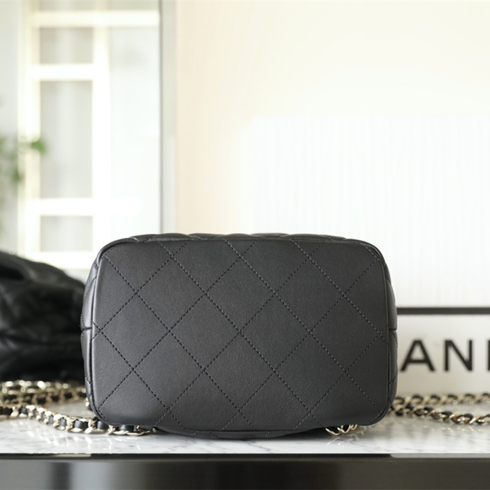 以原版開模為主1:1Chanel水桶包復刻精度還原了大小尺寸規格,針對皮革的應用精選到納帕小牛皮材質專屬打造原有的包身.在燈光或者日常光照射下,整個包包體現出的皮質光澤度都是完全媲美原裝正品.高仿Chanel背包繼承了專櫃一致的衣缽達到百分之99的還原.
