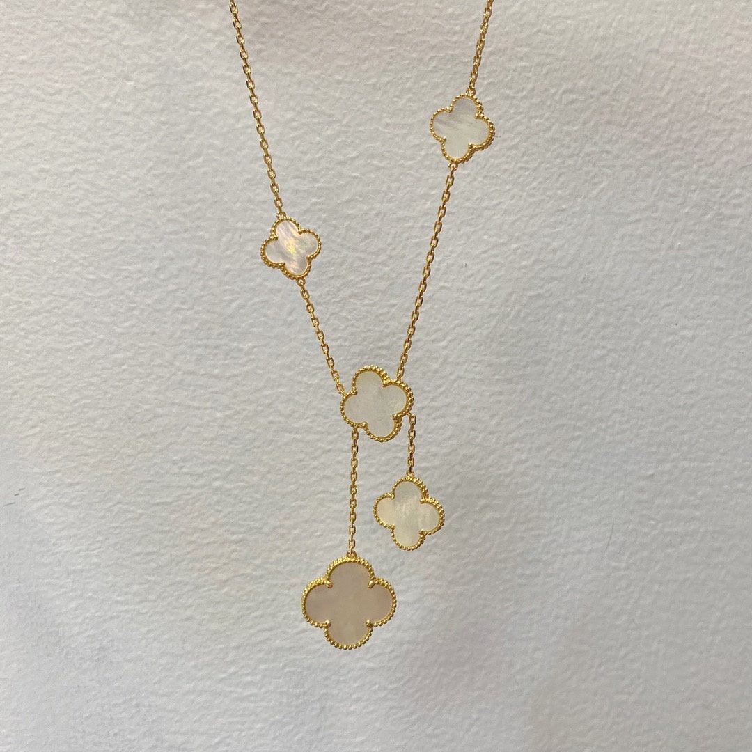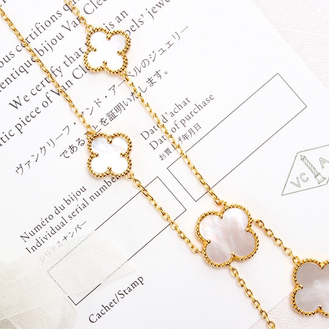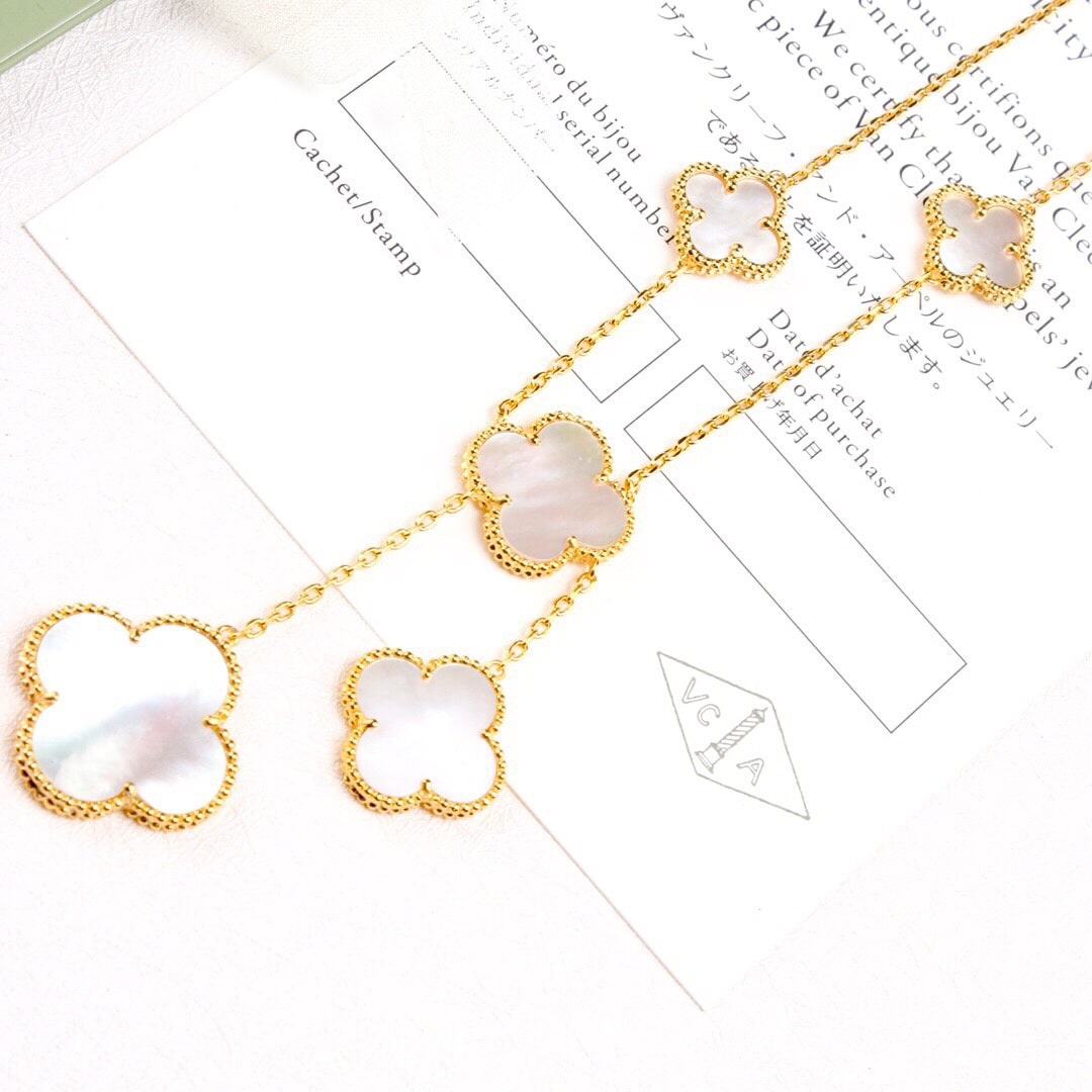 高仿Van Cleef & Arpels首飾Magic Alhsmbra四葉草項鏈,這款Magic Alhambra六花不規則項鏈簡直有點高調,由於太不日常,搭配時註意服飾大色調,幾乎可以一身黑或者一身簡單點的衣服,領口一定要大,