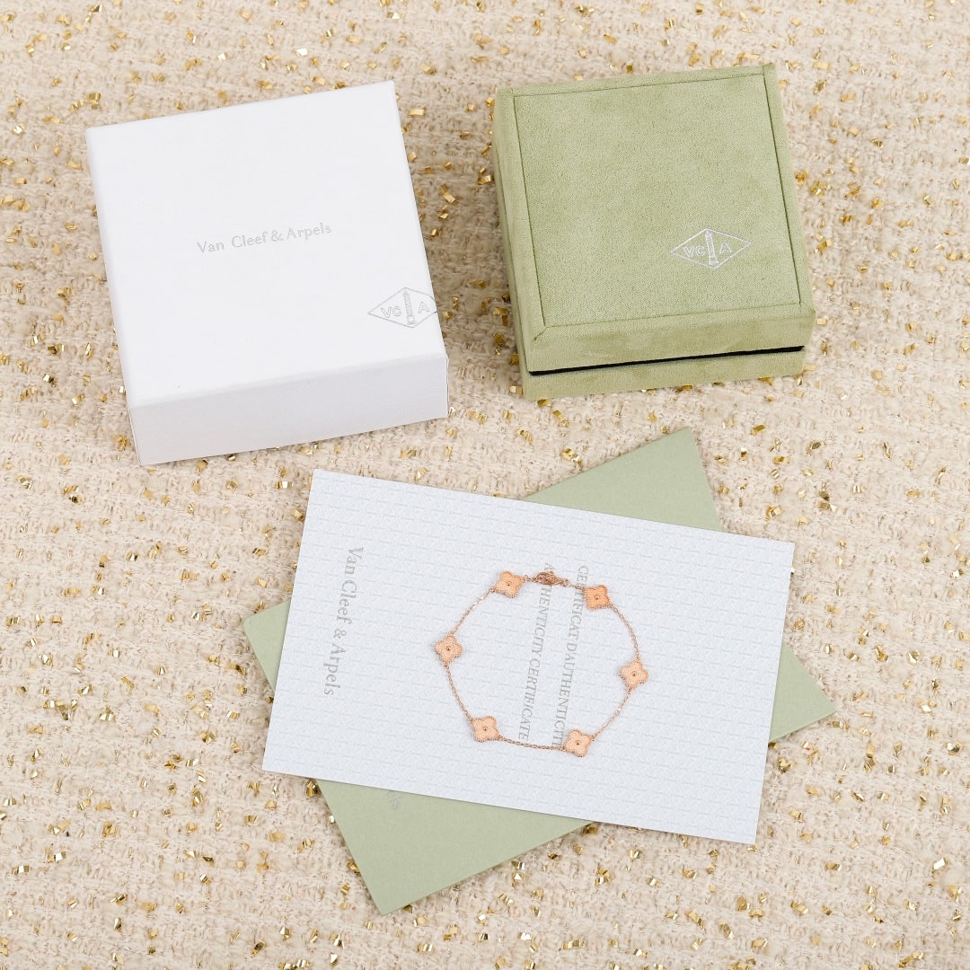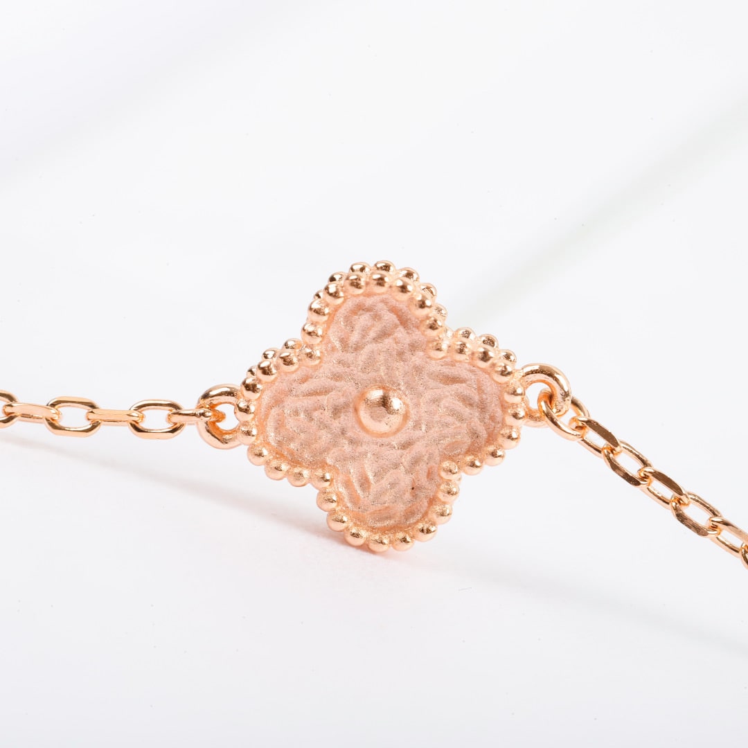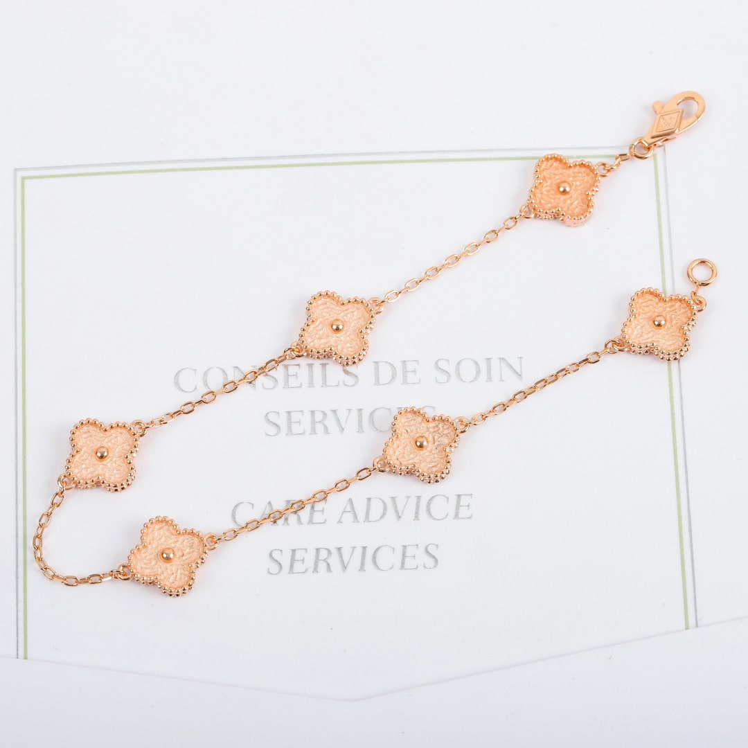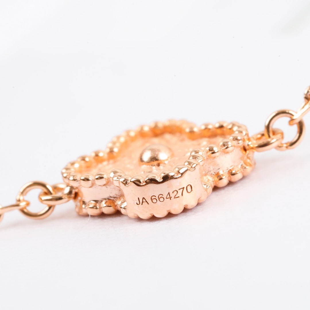 根據原版採用18K玫瑰金材質打造的玫紅色色澤高仿版本使用純銀材質打造,色澤部分可以做到對應的調色,整條手鏈涉及的光澤度,版型,弧度,亮度,手感都是工匠原版開模打造而成.其中正面反面分別有兩個菱形體凸出在表面,且菱形上邊VCA字母呈雙筆畫空心字體,其次是鎖扣部分細小結構部分,精準做到原版扣具版型.其長度17CM,符合眾多女士手腕尺寸.六花的寓意更能體現個人魅力.