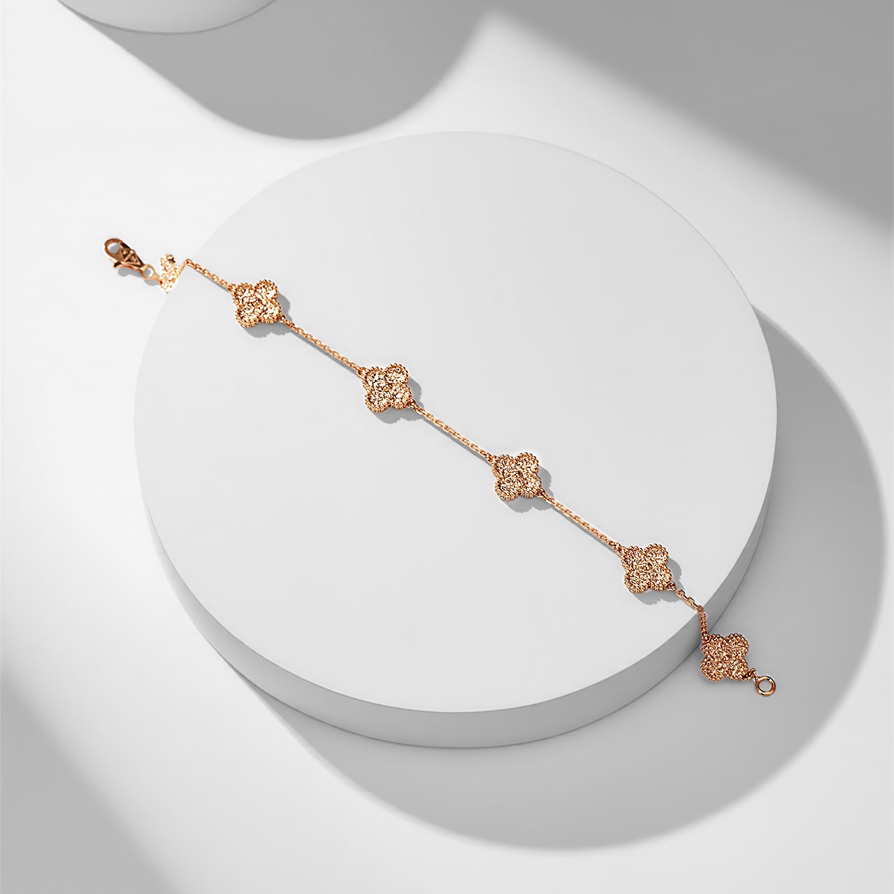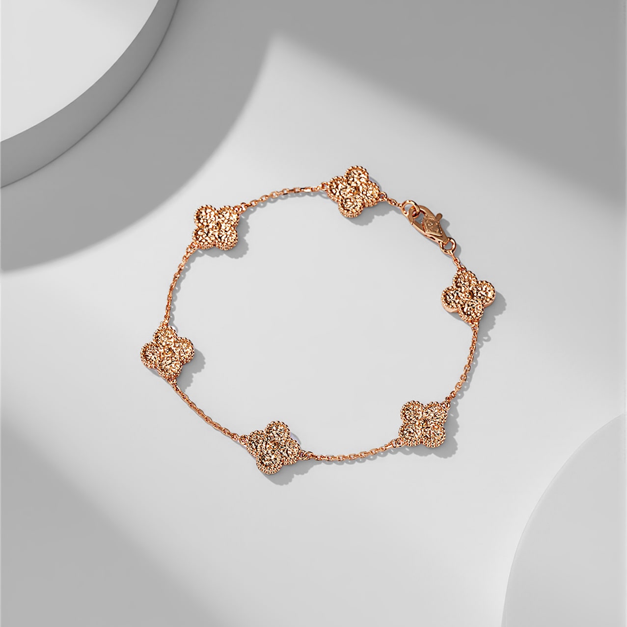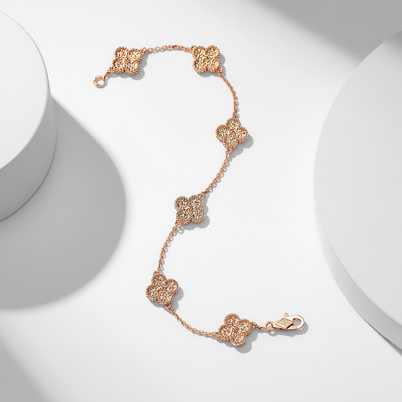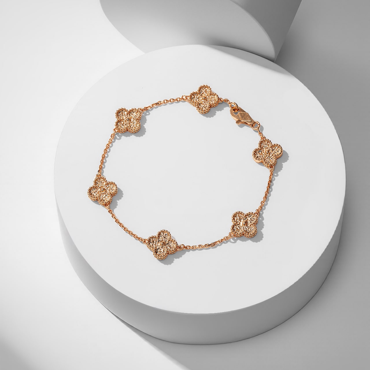 根據原版採用18K玫瑰金材質打造的玫紅色色澤高仿版本使用純銀材質打造,色澤部分可以做到對應的調色,整條手鏈涉及的光澤度,版型,弧度,亮度,手感都是工匠原版開模打造而成.其中正面反面分別有兩個菱形體凸出在表面,且菱形上邊VCA字母呈雙筆畫空心字體,其次是鎖扣部分細小結構部分,精準做到原版扣具版型.其長度17CM,符合眾多女士手腕尺寸.六花的寓意更能體現個人魅力.