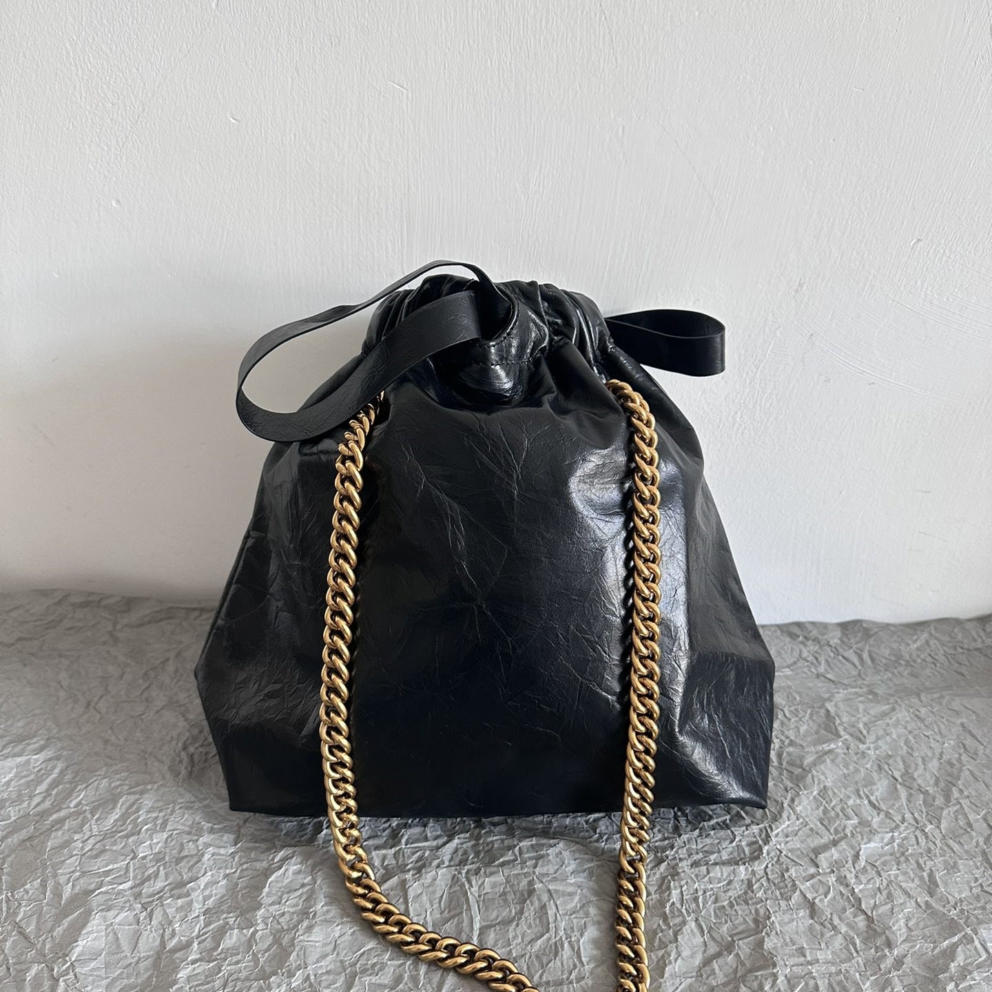 在仿真度與品質層面上,獨家高端私人定製純原版本,根據原版所使用到的小牛皮材質,具有皺紋的手感,且賦予了外層啞光色澤,配備的金屬鏈條與束口式的包口形成開合設計,有一半的設計理念偏向水桶包,可作為單肩使用和手拎方式,實現一包多用途.