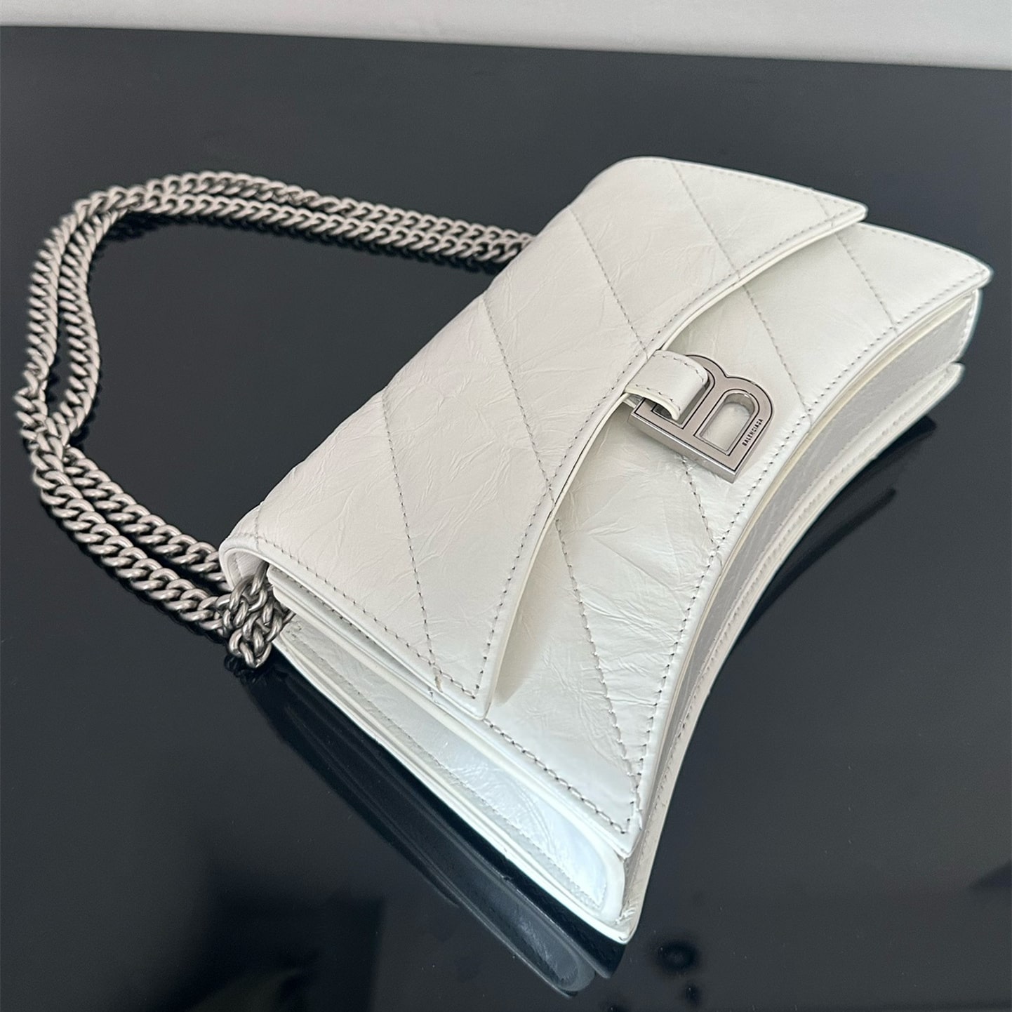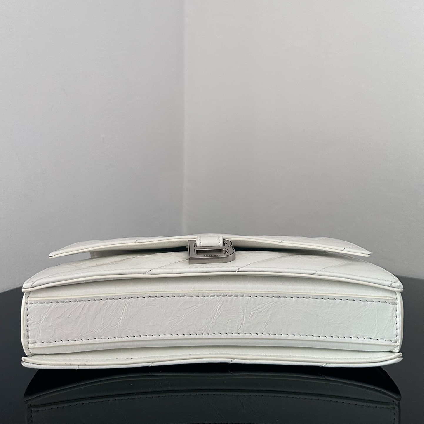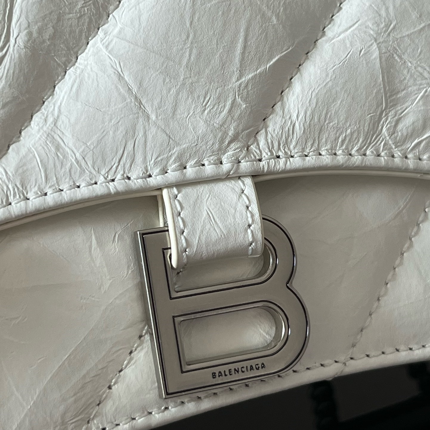 高仿包包巴黎世家Crush系列沙漏包全新推出小牛皮材質打造的白色手袋,一款以衍縫線結構組成的外觀設計,超小號的尺寸非常mini可愛,對於小巧的女性身材非常符合日常穿搭,而白色具有一種高級感.