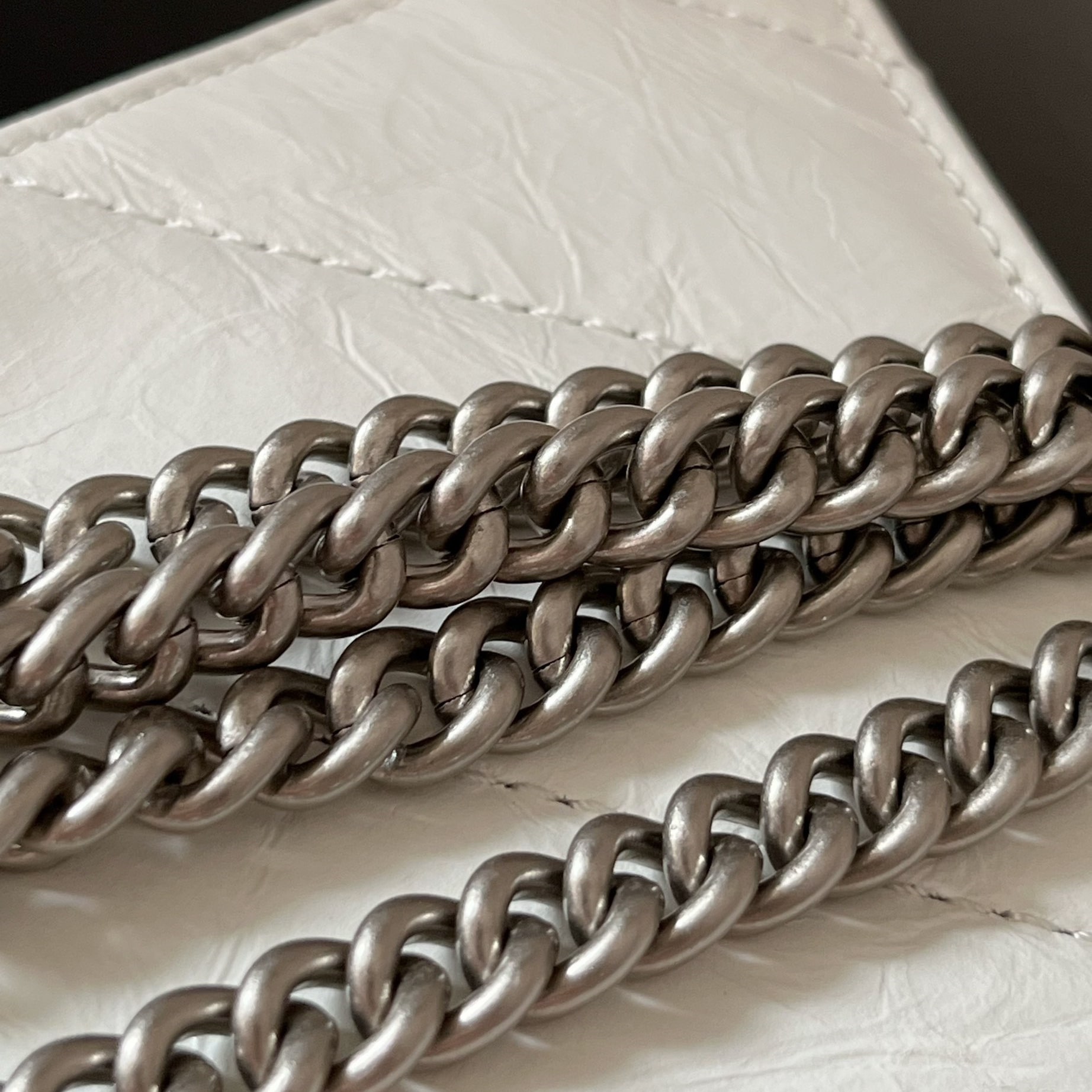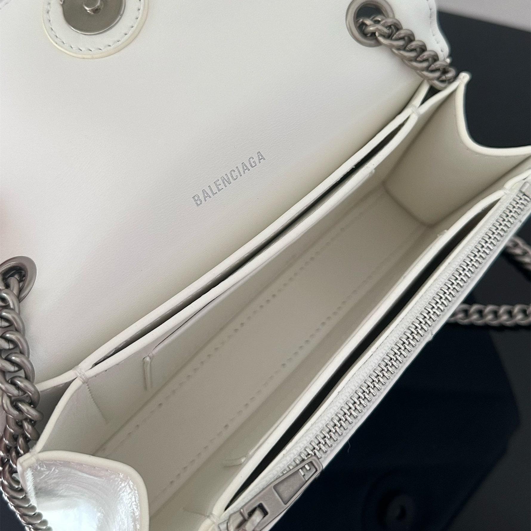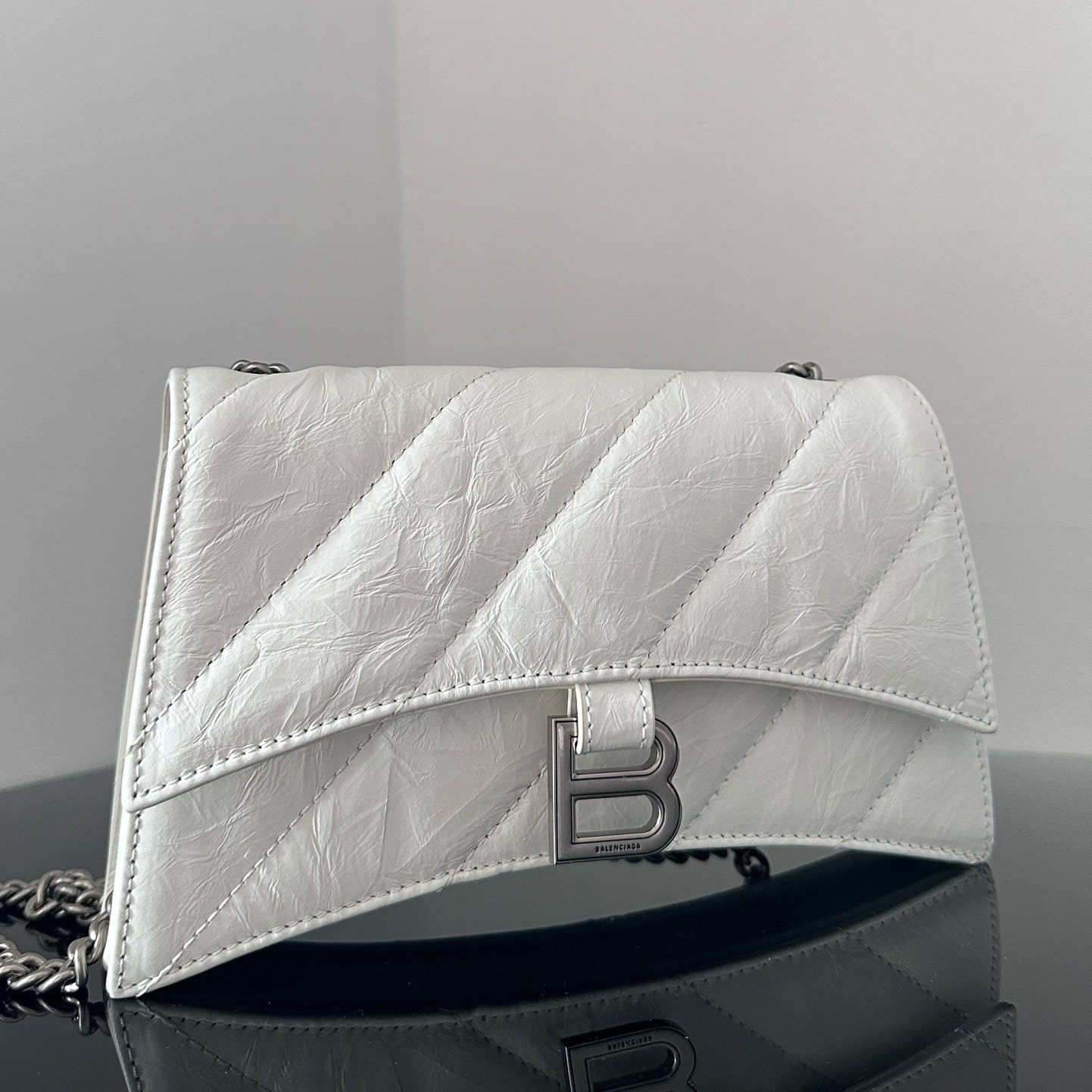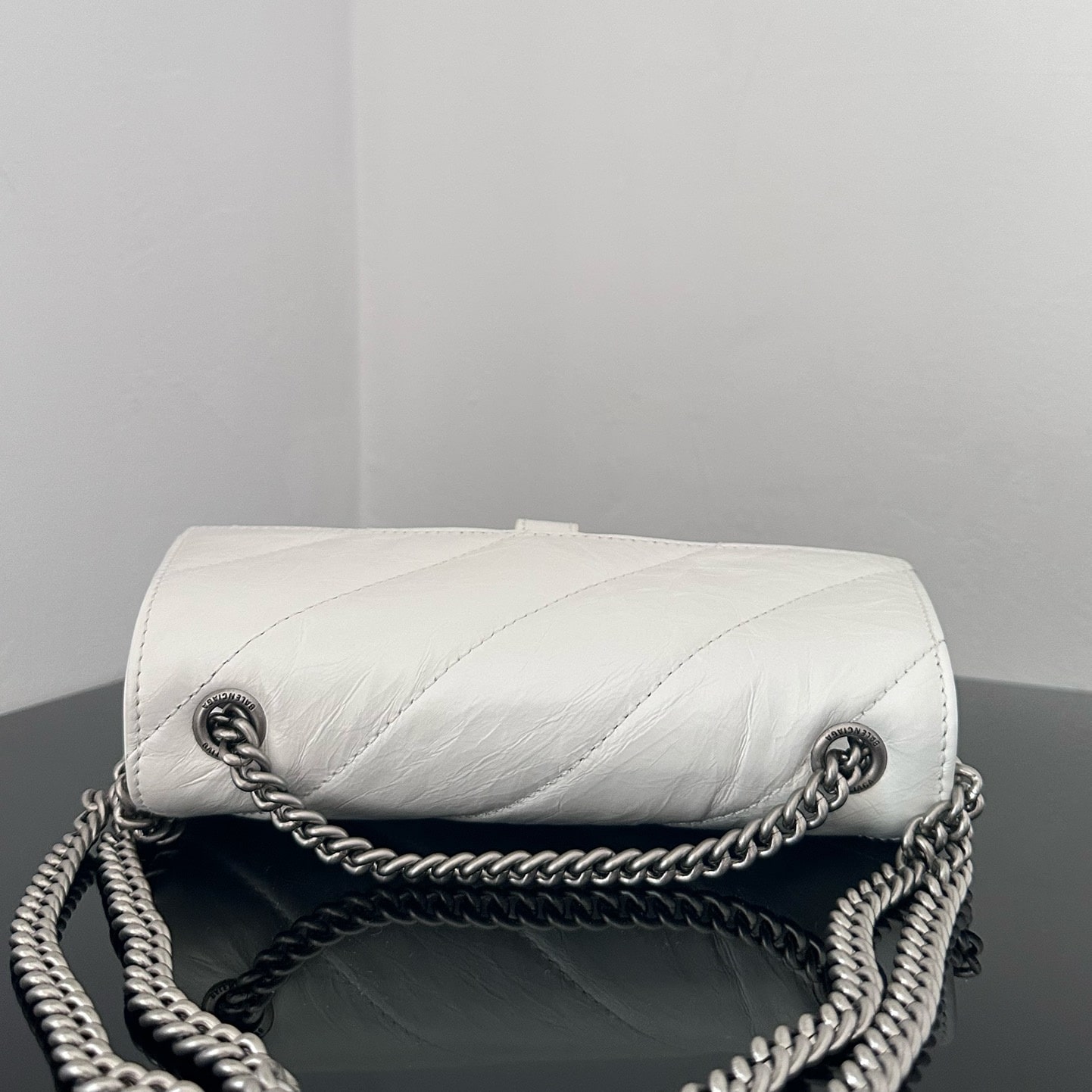 高仿包包巴黎世家Crush系列沙漏包全新推出小牛皮材質打造的白色手袋,一款以衍縫線結構組成的外觀設計,超小號的尺寸非常mini可愛,對於小巧的女性身材非常符合日常穿搭,而白色具有一種高級感.