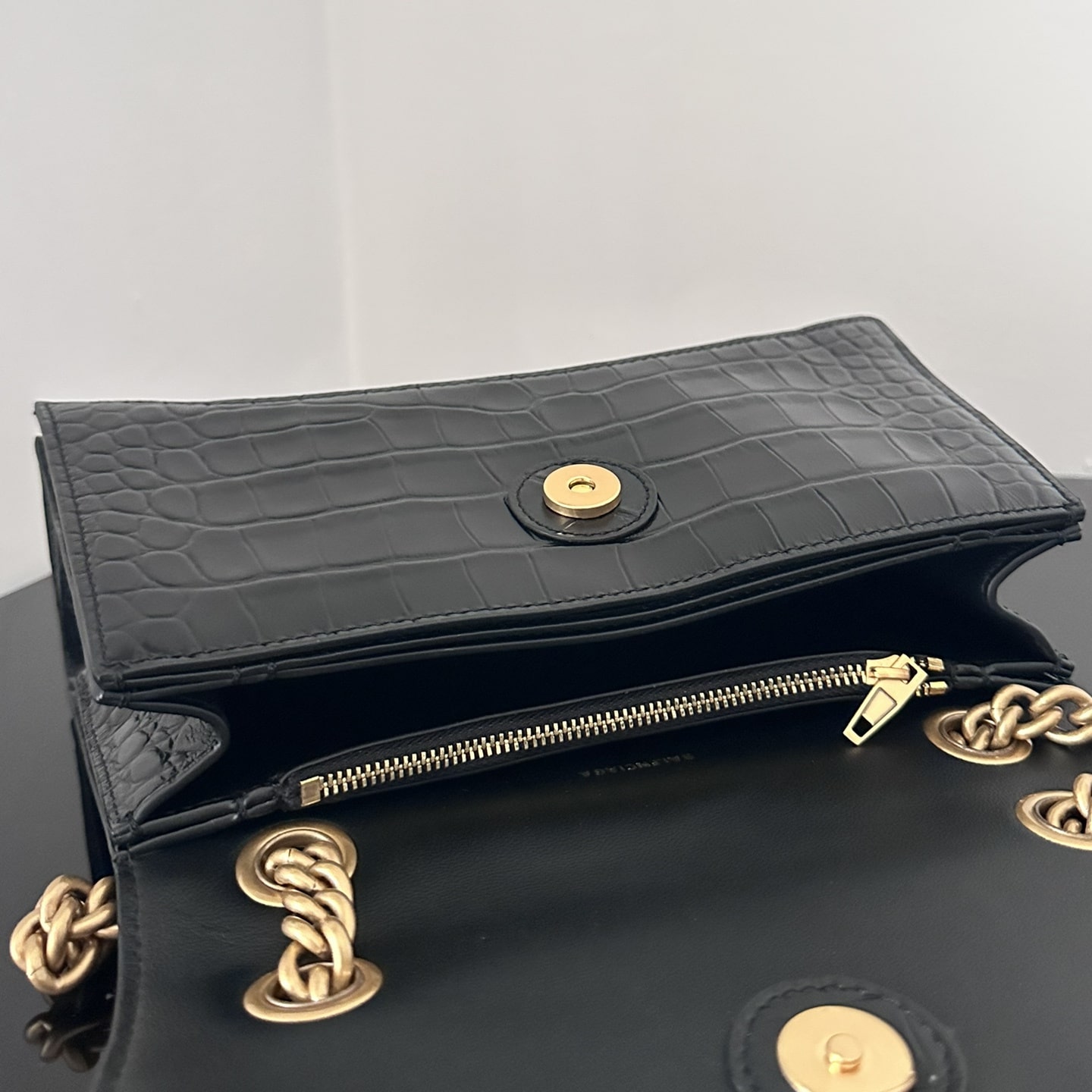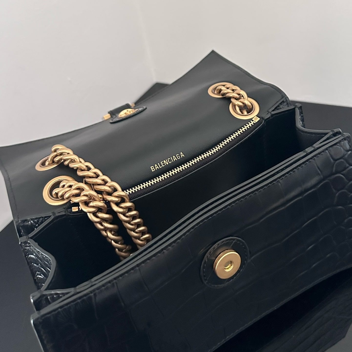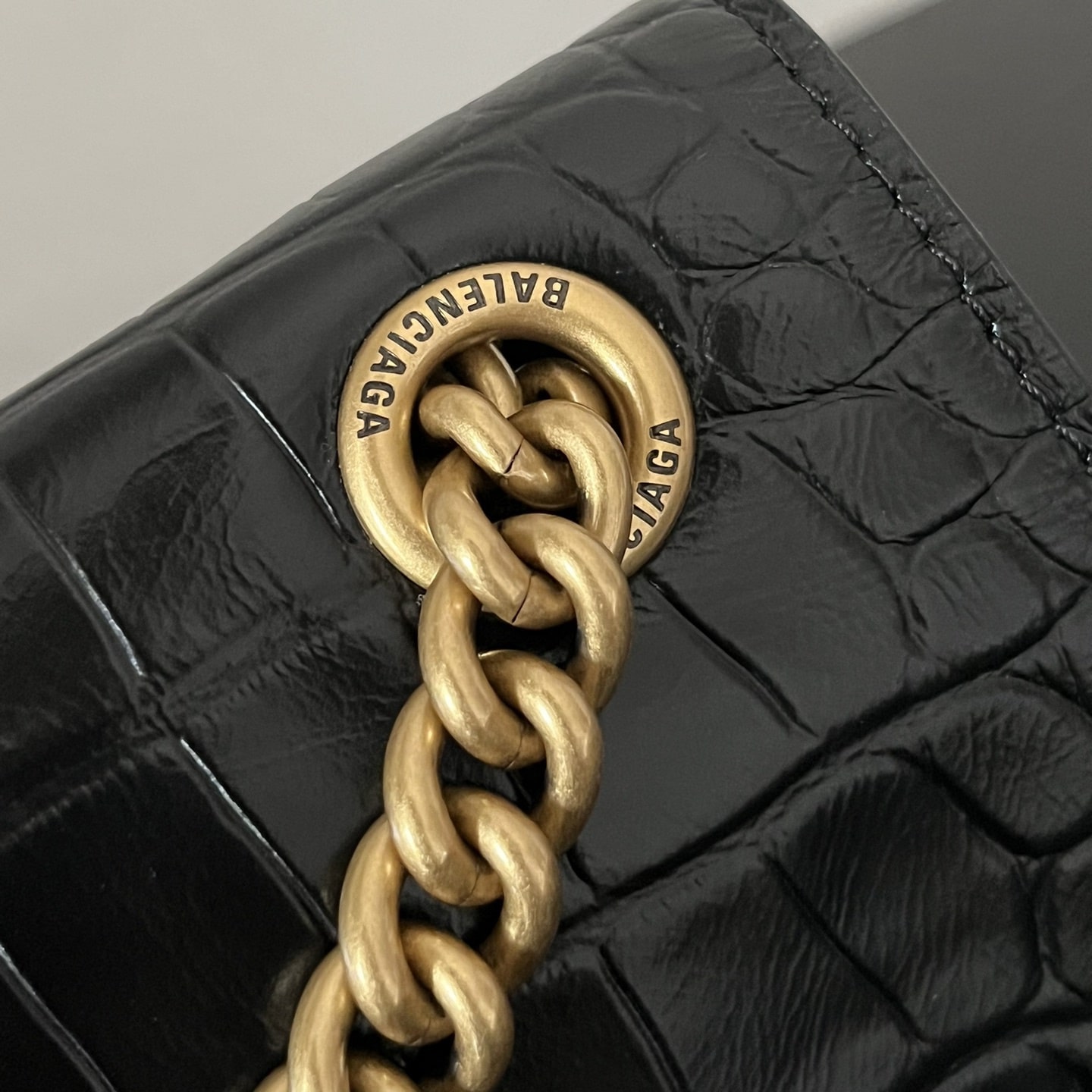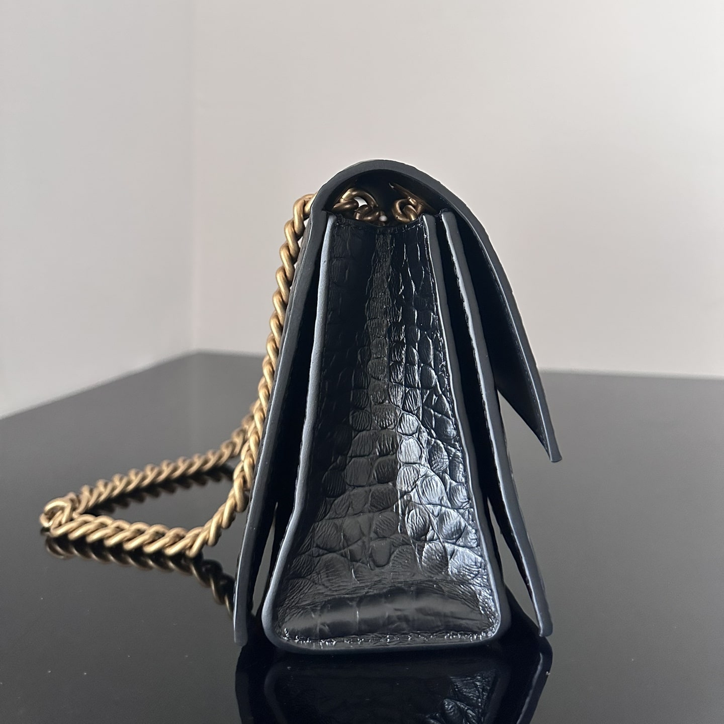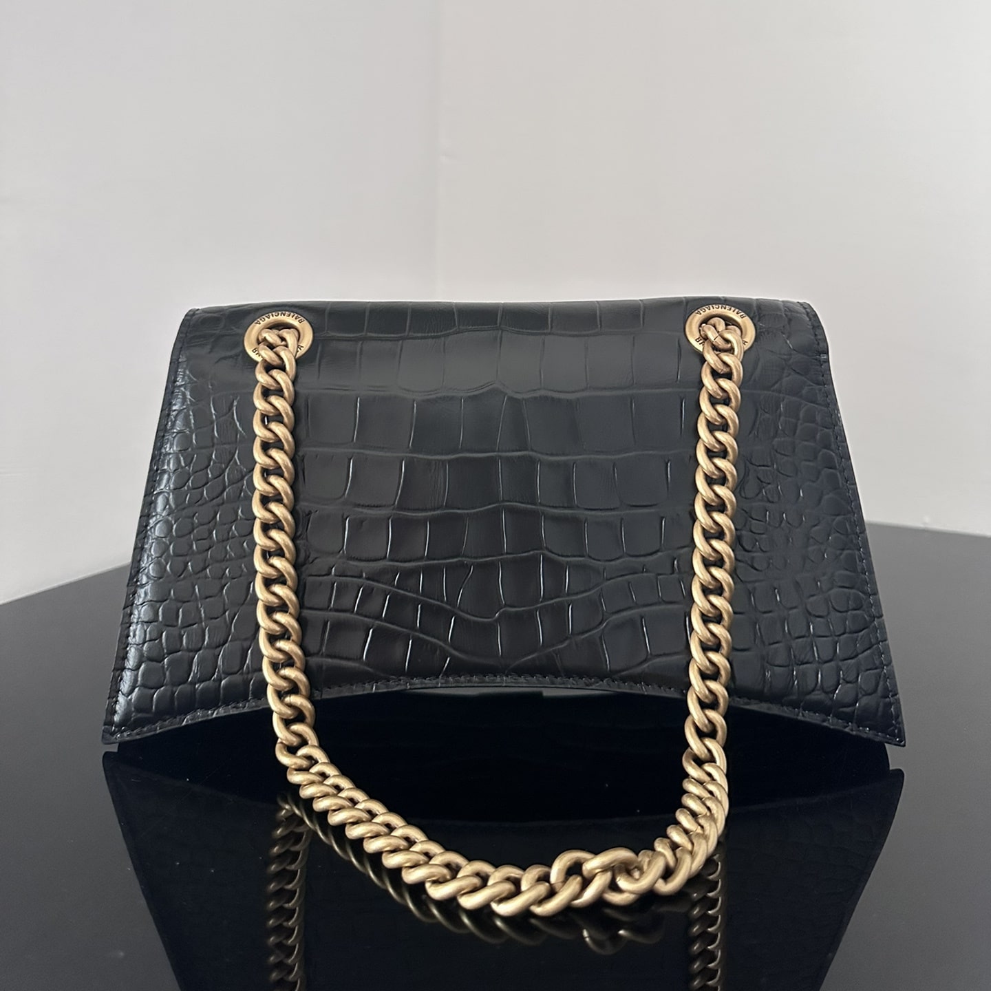 這一隻高仿Balenciaga手袋效仿了此前推出的沙漏包結構,作為Crush系列中最常見的包款,重新使用小牛壓印鱷魚皮紋路構造而成,無手柄的沙漏包依舊能夠保留經典的風格,非常適合性感女士既百搭又有高級感.