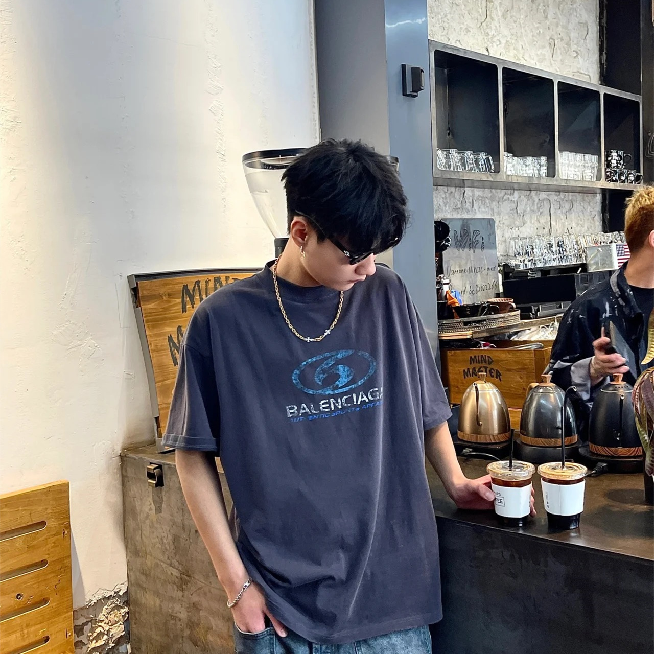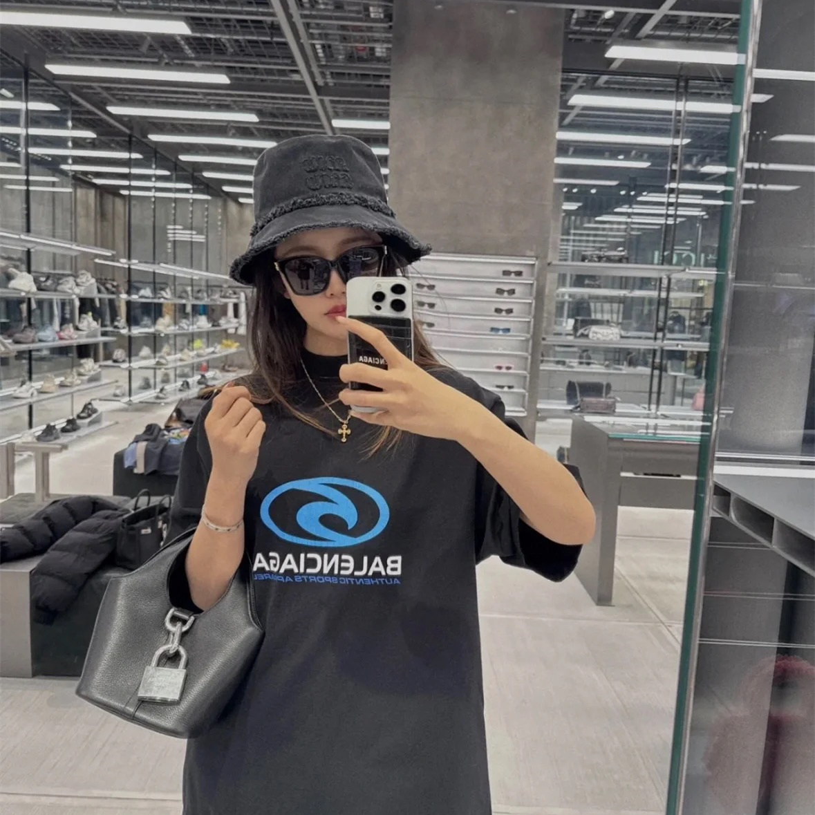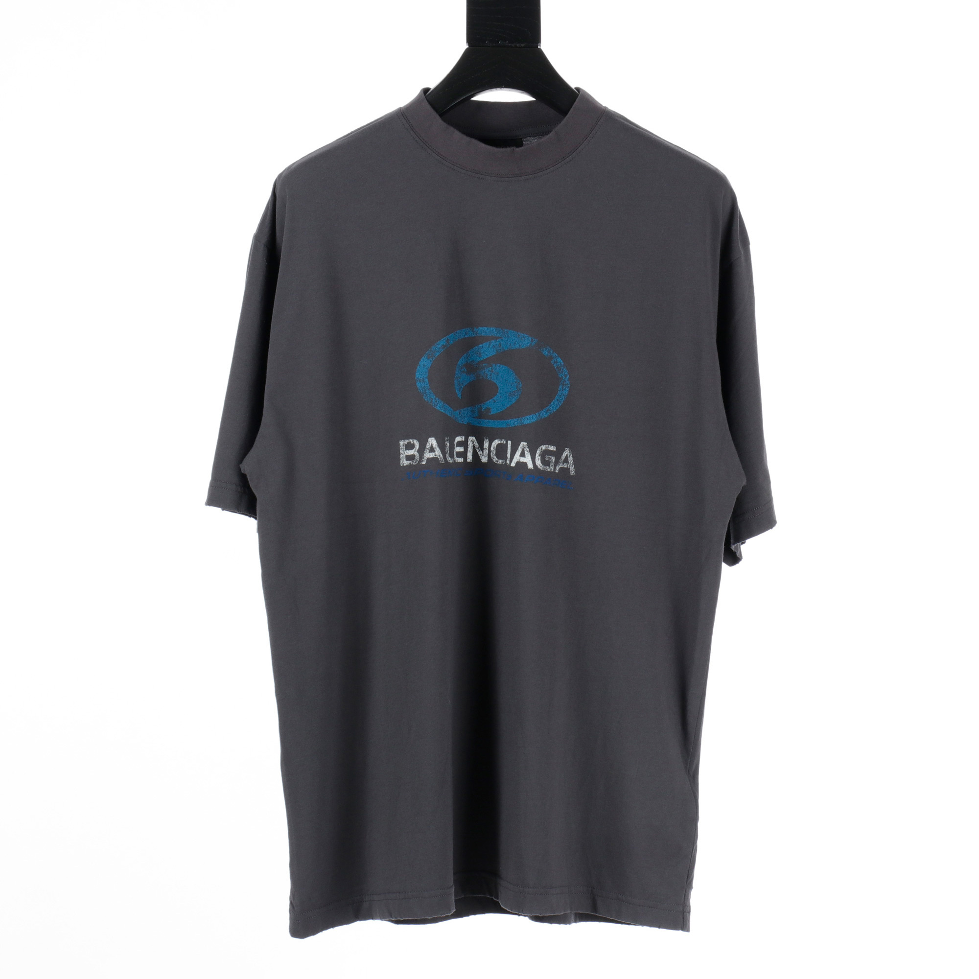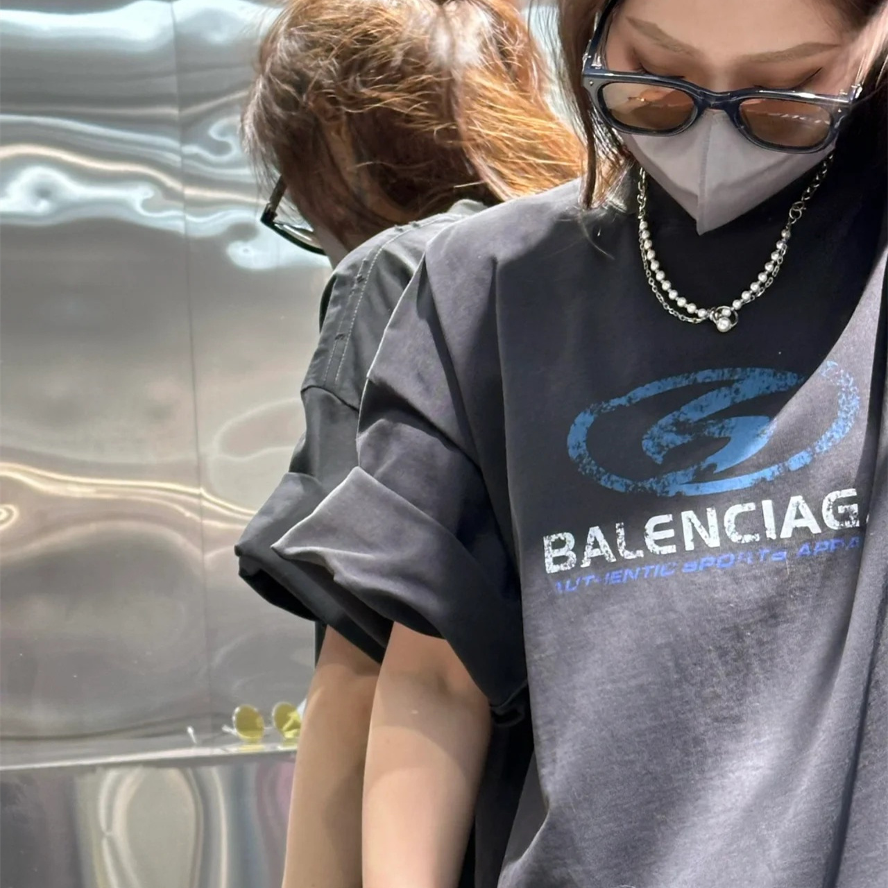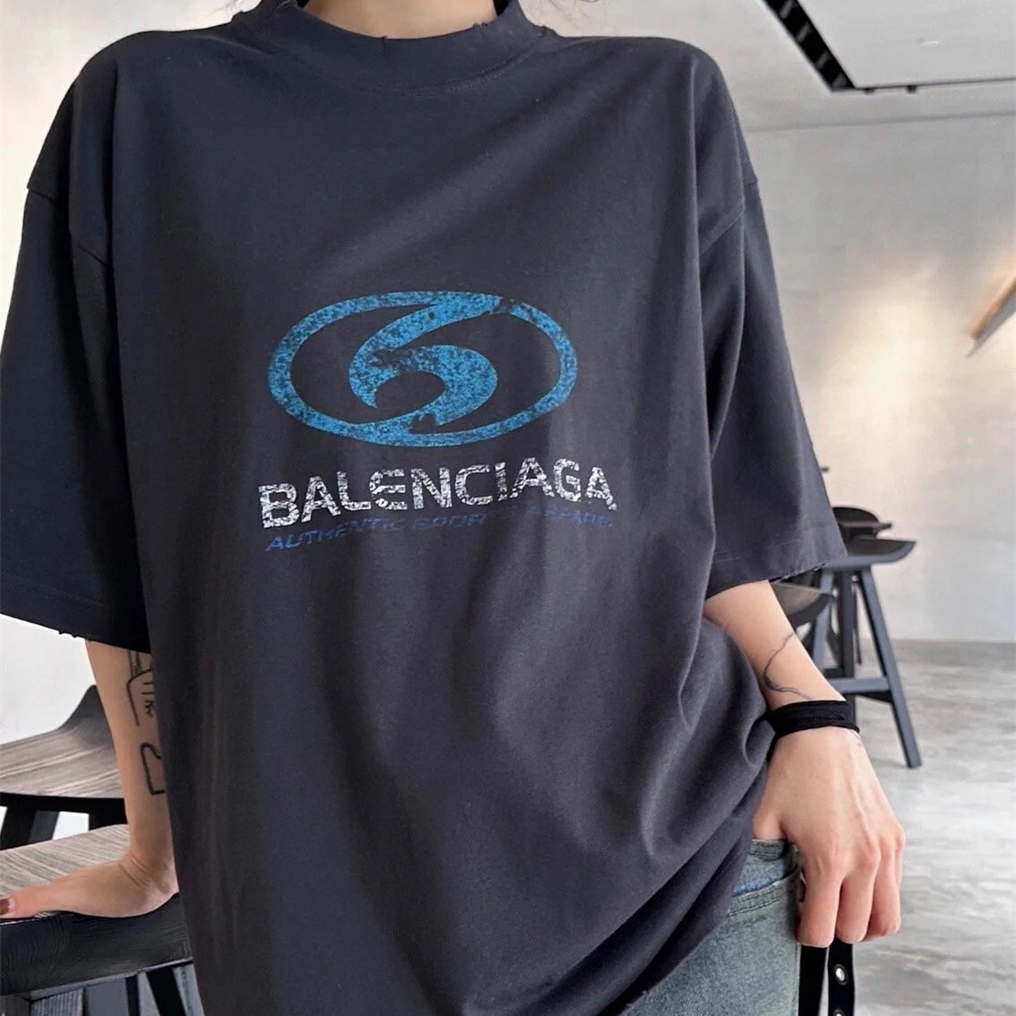 Balenciaga巴黎世家24新款藍色‬LOGO直印⁠裂‬花短袖T恤