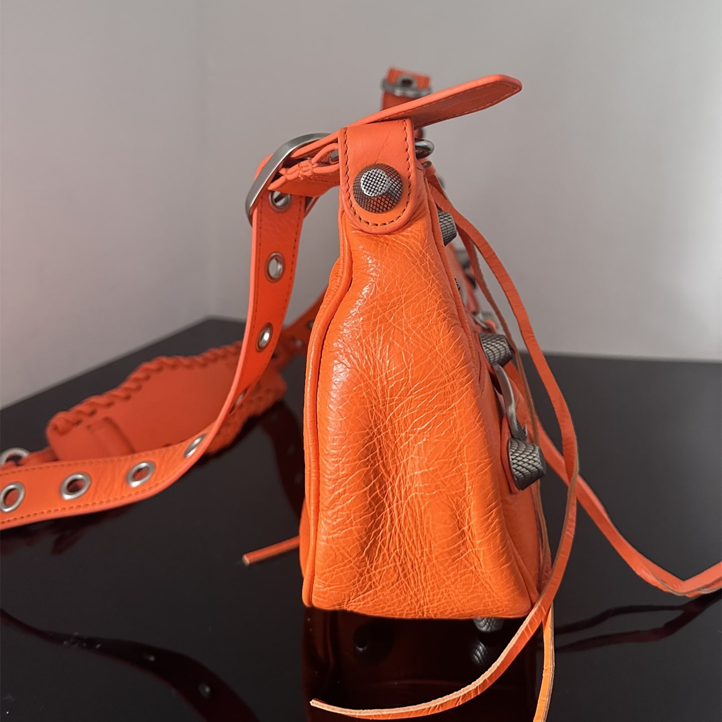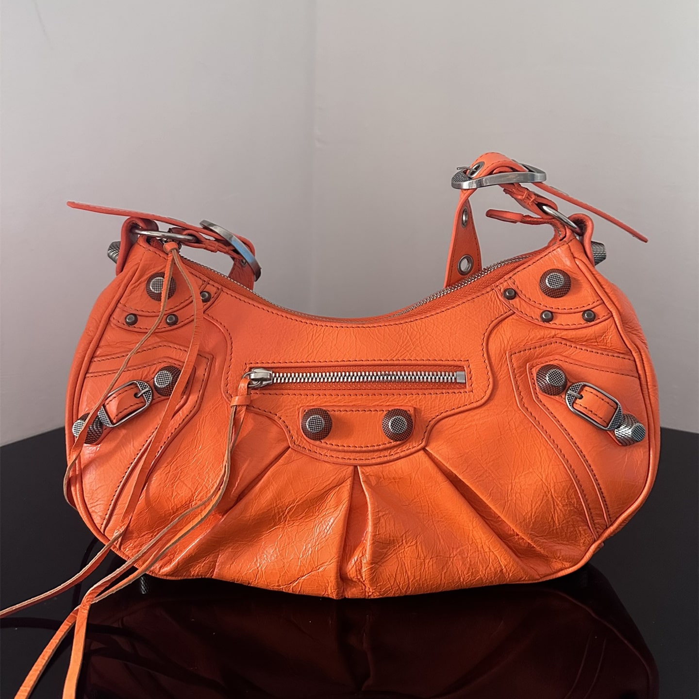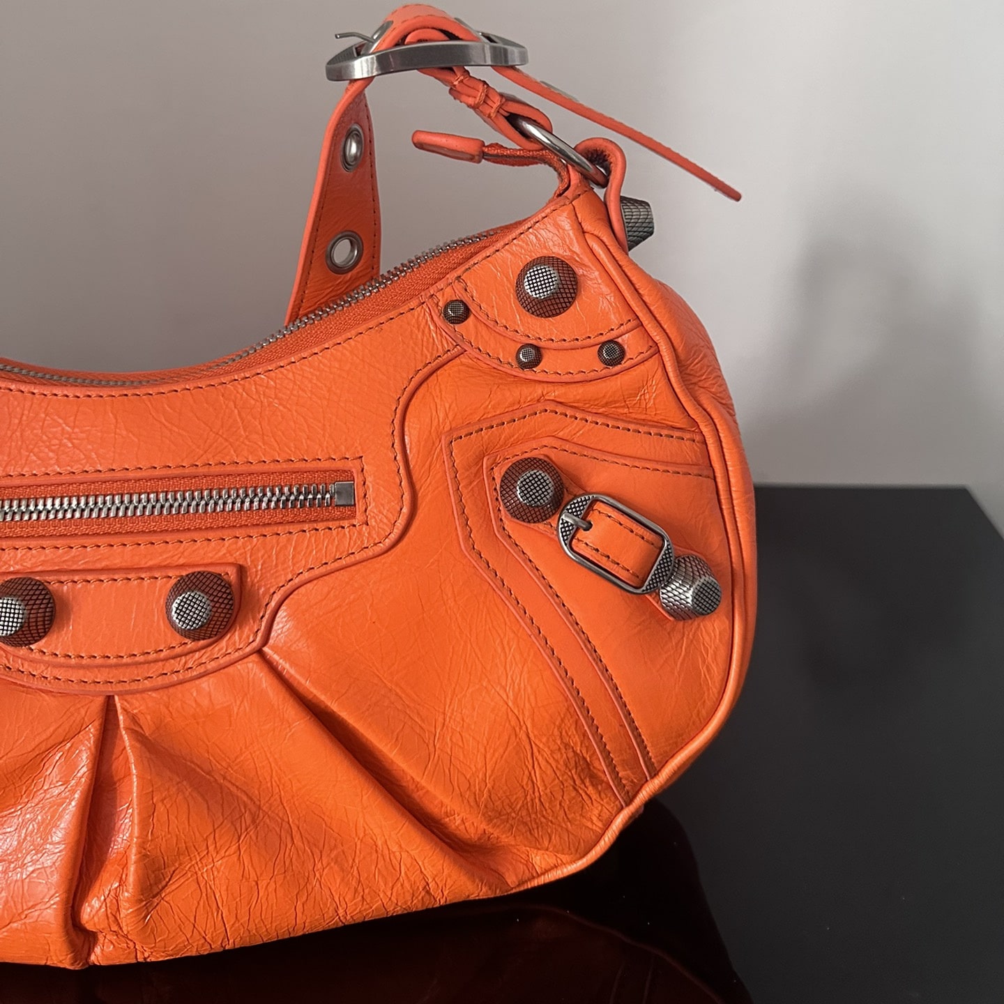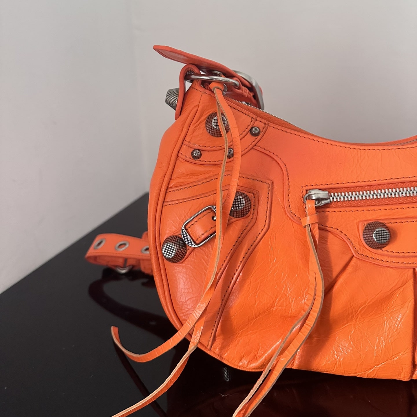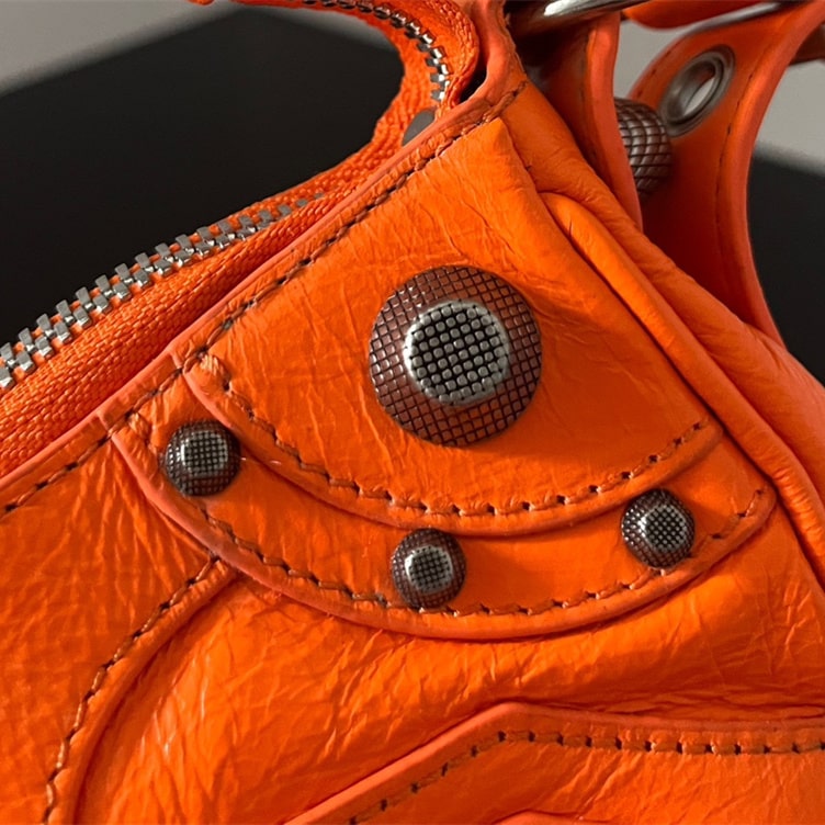 高仿奢侈品A貨包包Balenciaga全新推出LeCagole系列手袋包款,橙色的皮質具有一種非常亮眼的視覺感,但並非符合每一位女士的審美,風格類型偏向機車風格,作為甜辣妹風格的首選一直都屬於熱門包款.