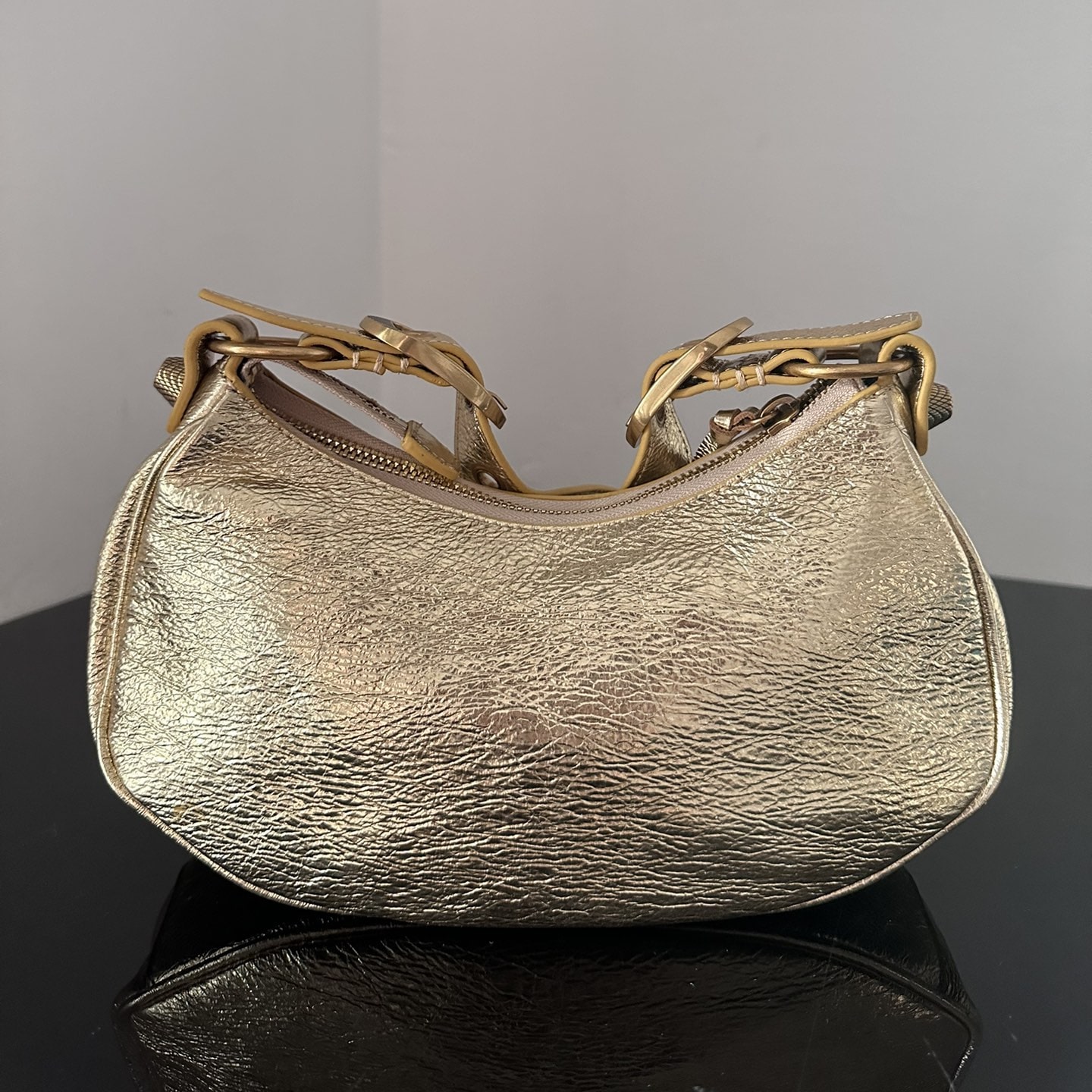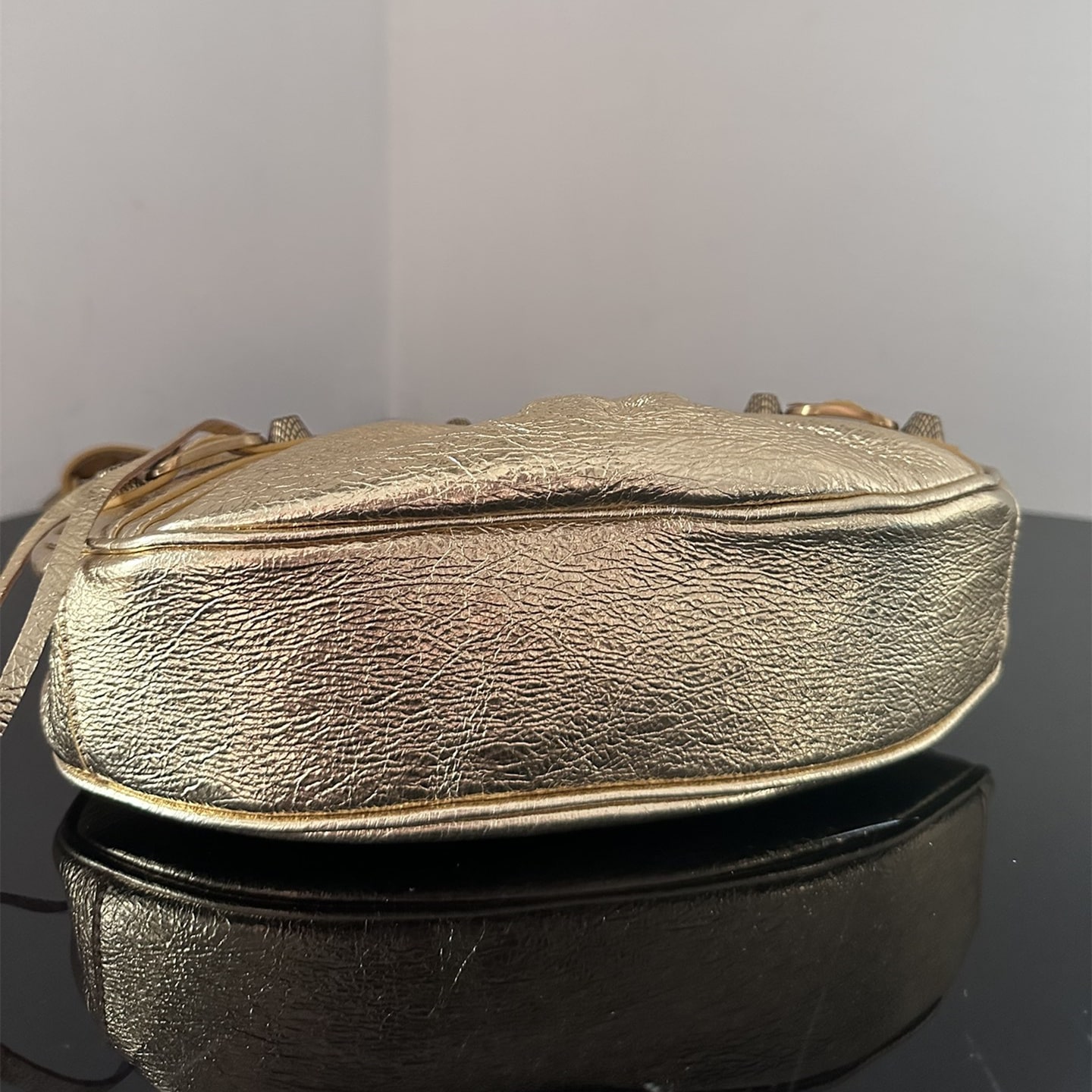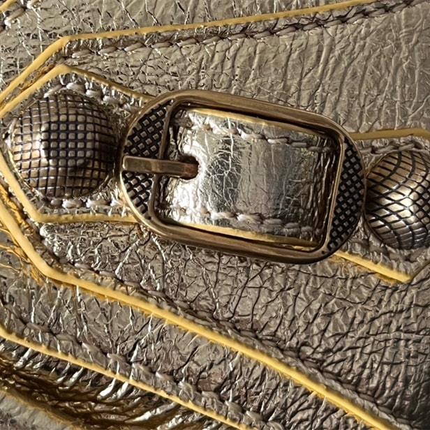 用於腋下單肩包使用,對於包袋的品質外觀經過金屬屬性處理,實際上是使用到褶皺小羊皮材質覆蓋整個包身結構,觸摸的手感比較絲滑沒有任何一點粗糙劣質感.對比市面上眾多版本是百分百使用到真皮革打造.