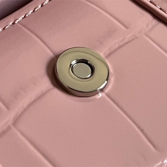 粉色皮質耐人尋味是眾多女性偏愛的選項,配備了小手柄與鏈條肩帶,可單肩或是胸前背戴.皮革部分是沿用到進口小牛皮材質,絲滑的紋路構造出壓印後的鱷魚皮紋理,清晰有感完全沒有粗糙的劣質表現.