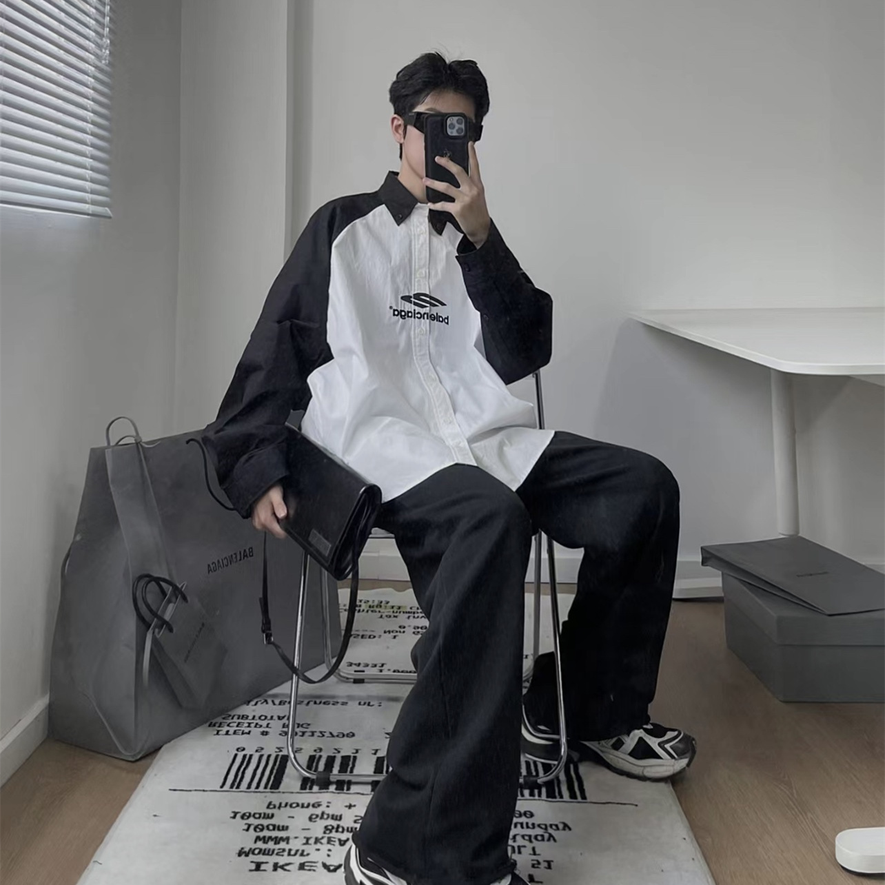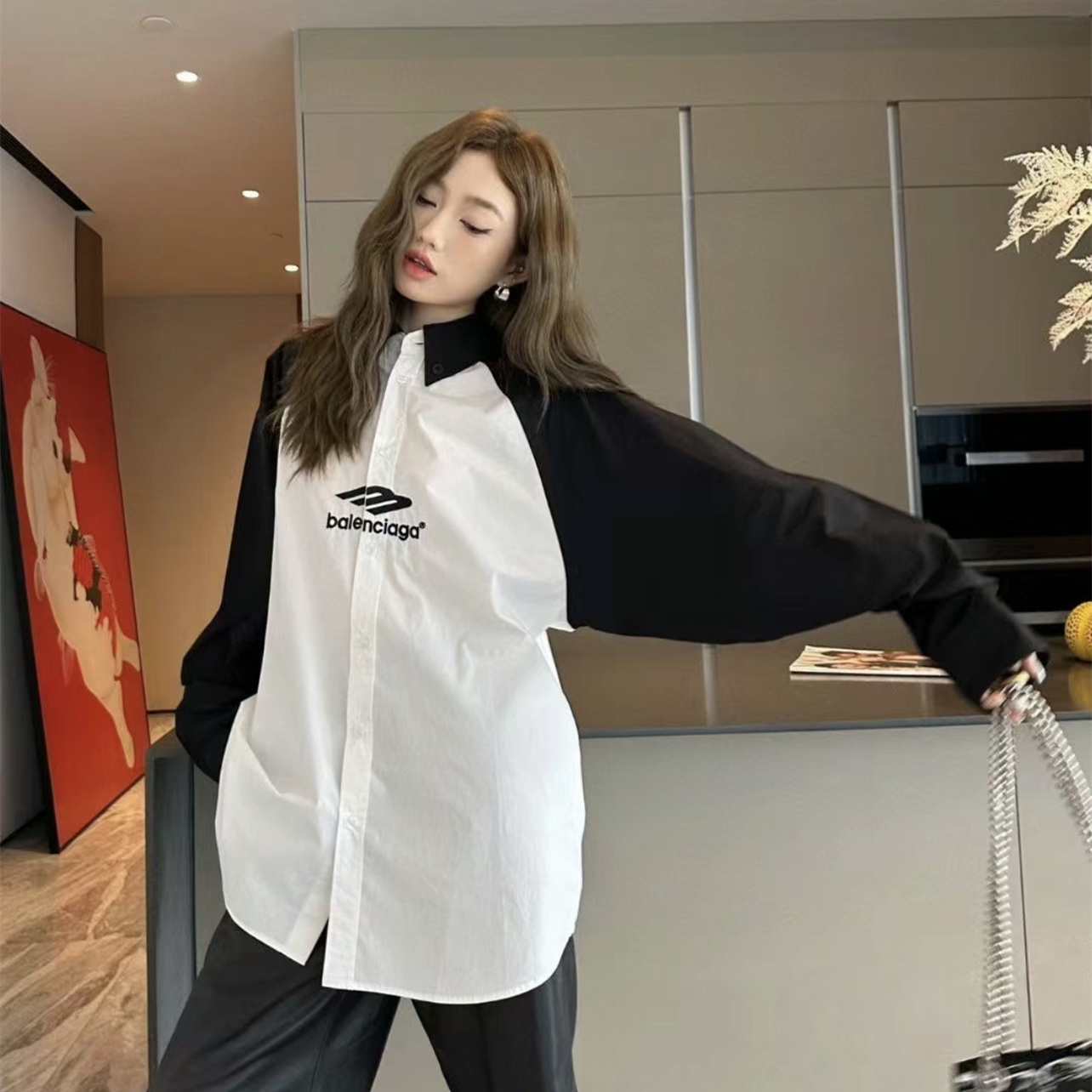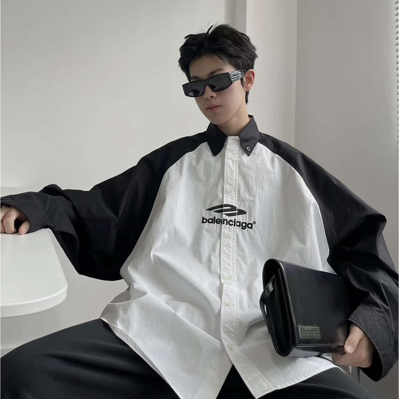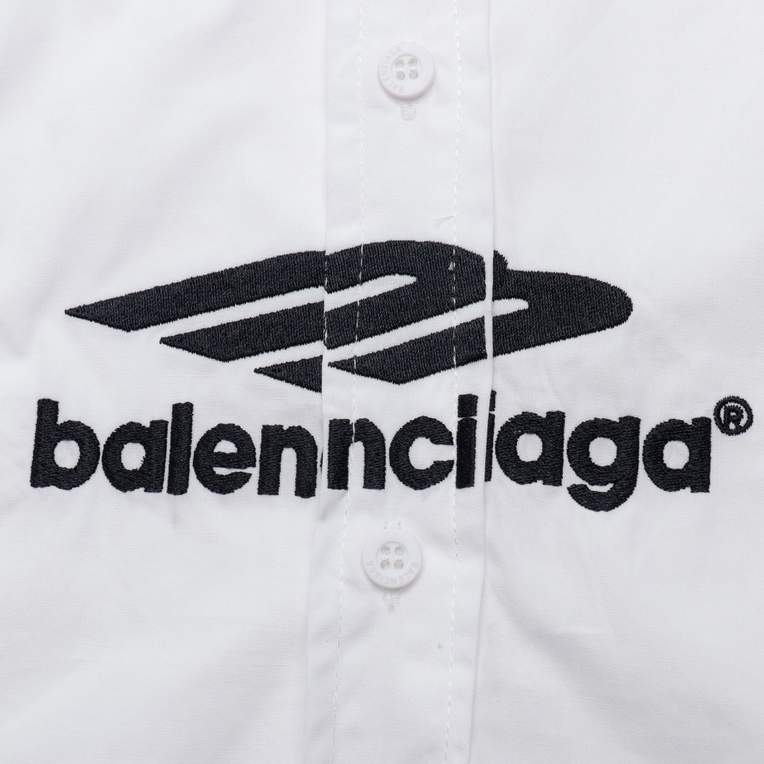 BALENCIAGA/巴黎世家黑白拼接熊貓3B刺繡長袖襯衫