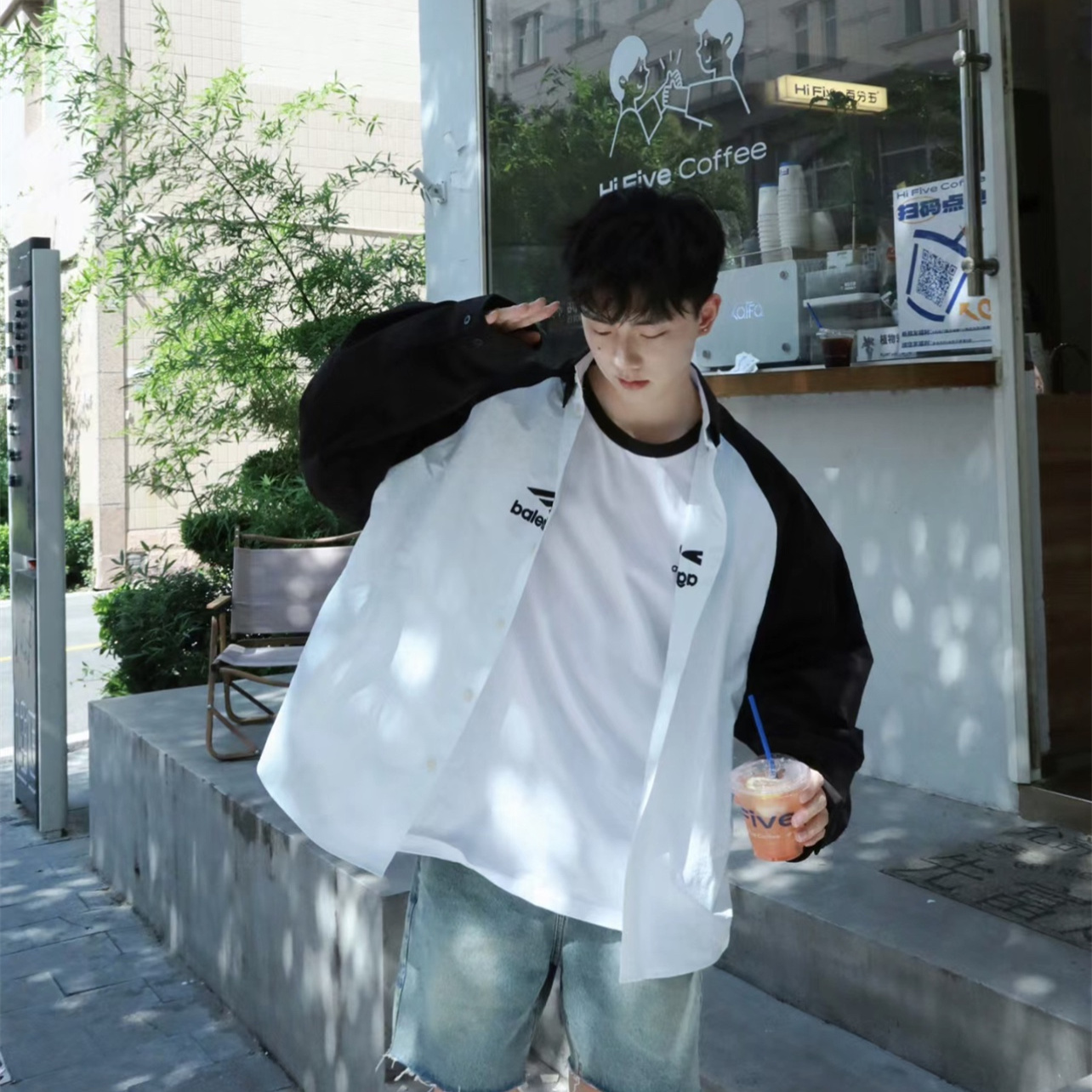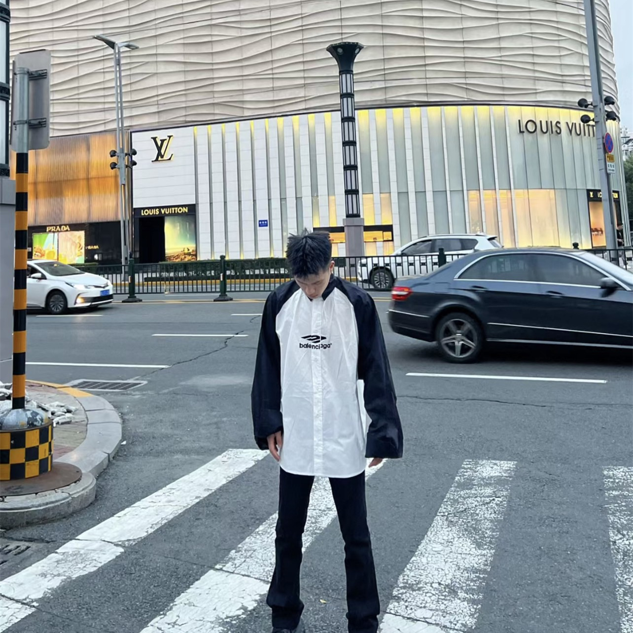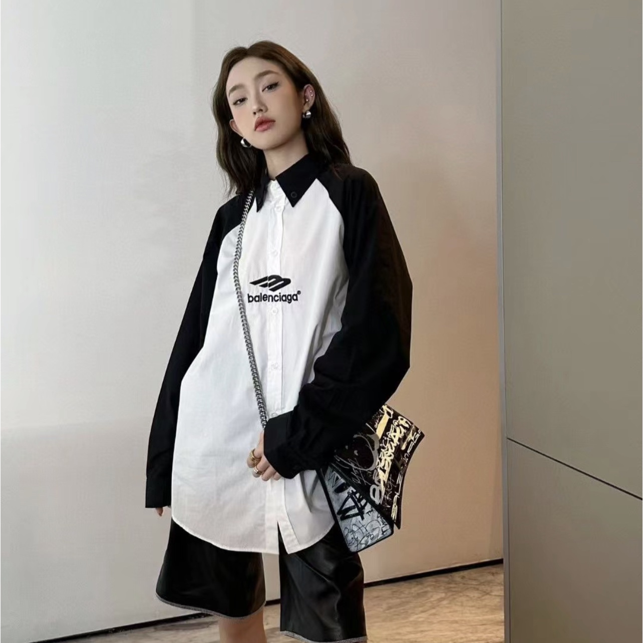 BALENCIAGA/巴黎世家黑白拼接熊貓3B刺繡長袖襯衫