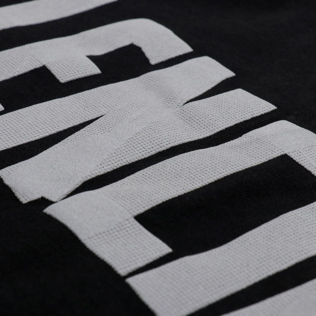 復古純棉質面料採用32S精棉雙紗平紋300克;搭配32S+70D拉架氨綸雙紗羅紋350g,復古平紋面料通常採用高質量的材料制成,具有優良的質地和手感,格子版先印普通黑再印兩次3%發泡,實塊闆印一次加30%發泡,全底闆印兩次加50%光油,及其繁瑣,印花呈現細格子紋路的重疊感,發泡字母膠漿印花工藝,根據原版細節調整後採用極細的紗網材質制作菲林網闆,採用進口環保發泡膠漿加入滲透工藝,經過對印刷網版進行技術處理,加了牢固度同時從而使有圖案的地方漿料能夠透過到織物上,滲透性強且面料紋路清晰可見,膠漿是一種黏稠的介質,可以被塑形併在紡織品上形成持久的凸起效果。