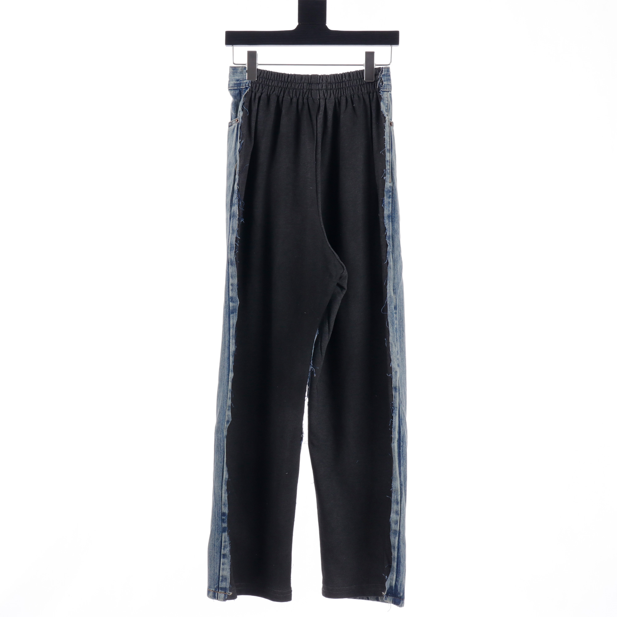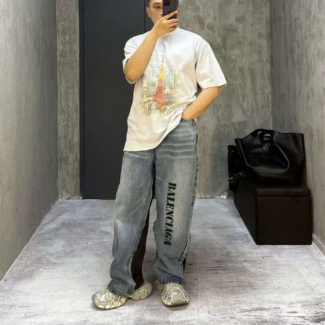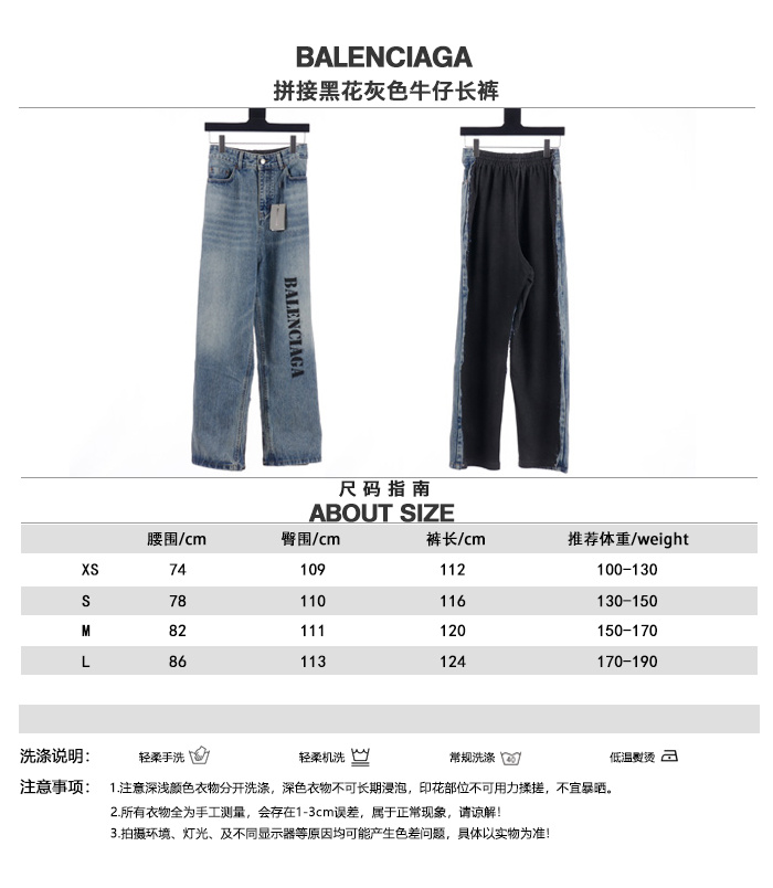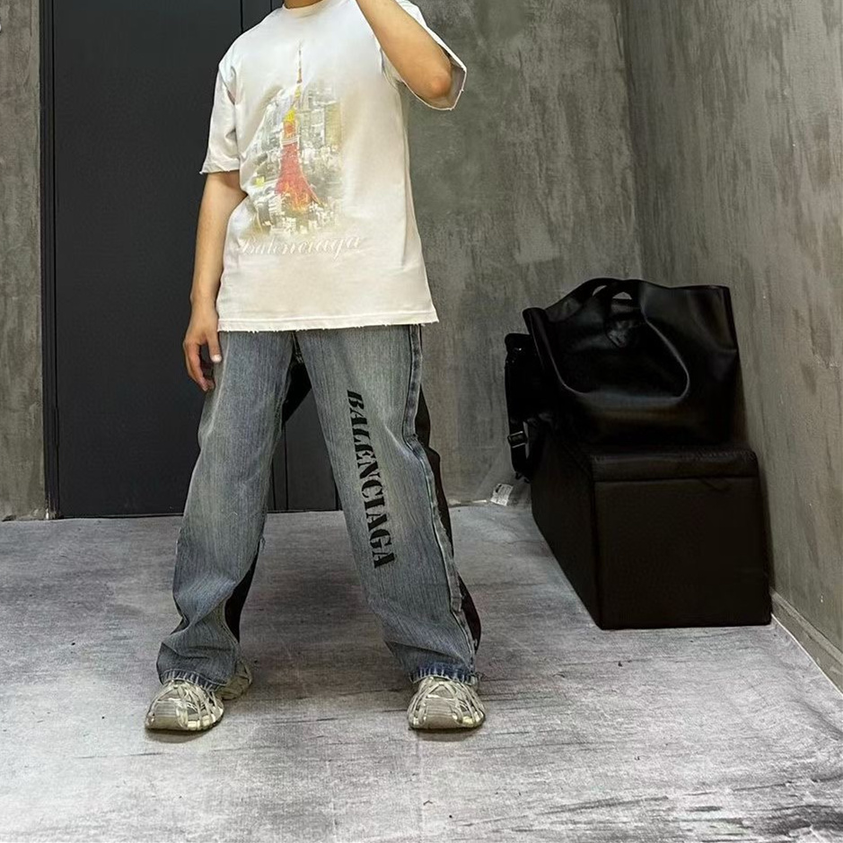 Balenciaga巴黎世家BLCG 拼接黑花灰色牛仔長褲