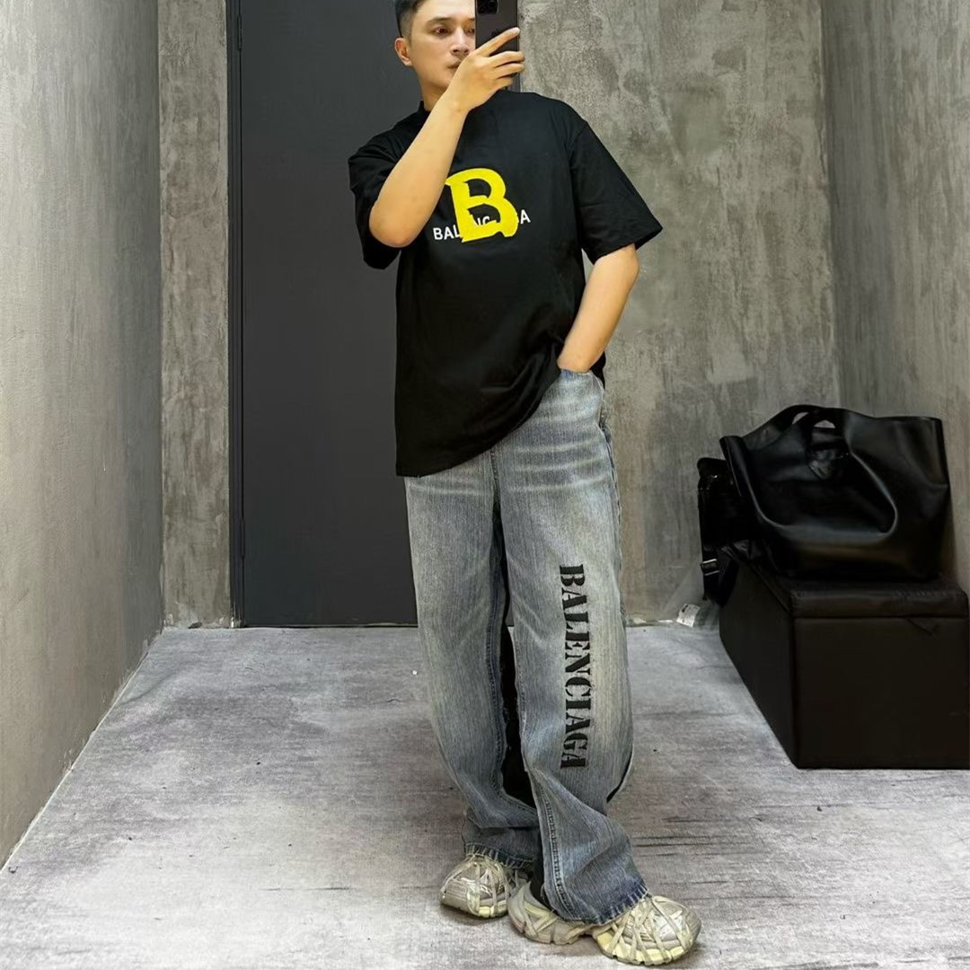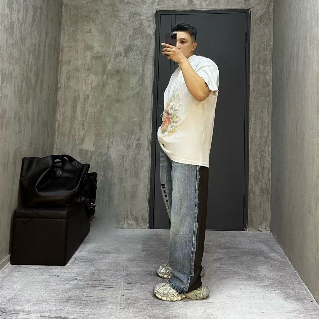 頂級版本Balenciaga巴黎世家牛仔面料拼接純棉毛圈黑花灰色衛衣面料.水洗懷舊溜須.手感柔軟.寬鬆版本.百搭套裝.牛仔褲.