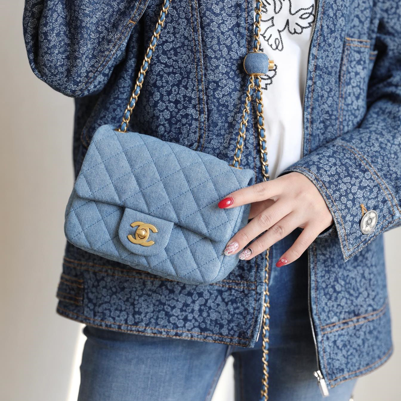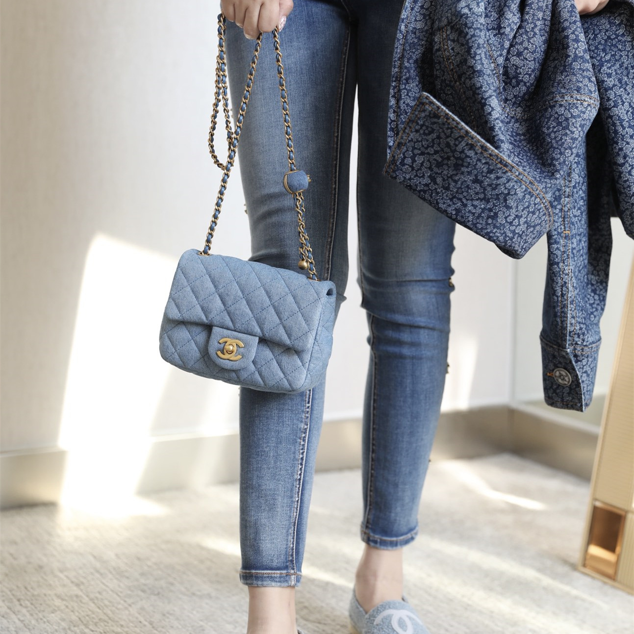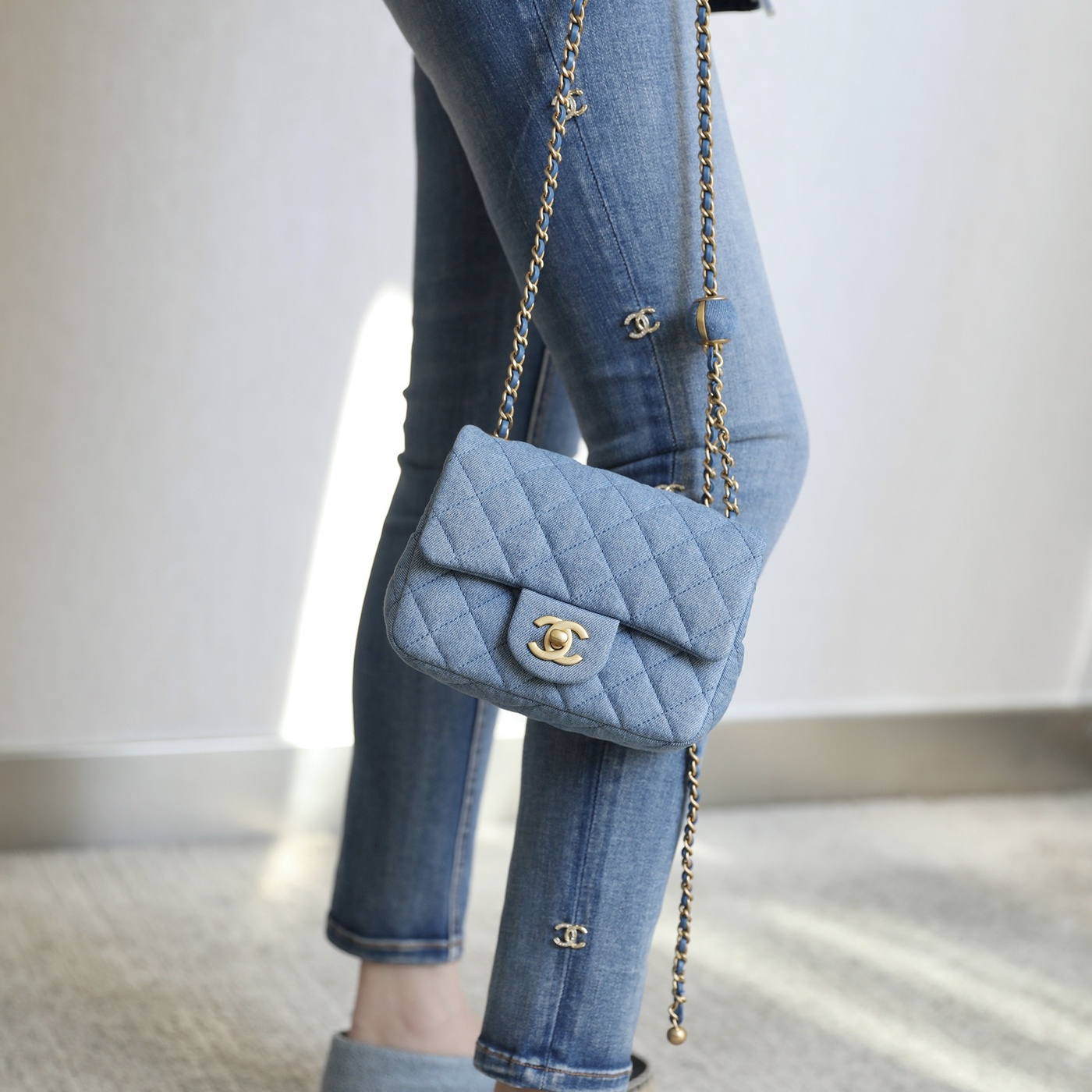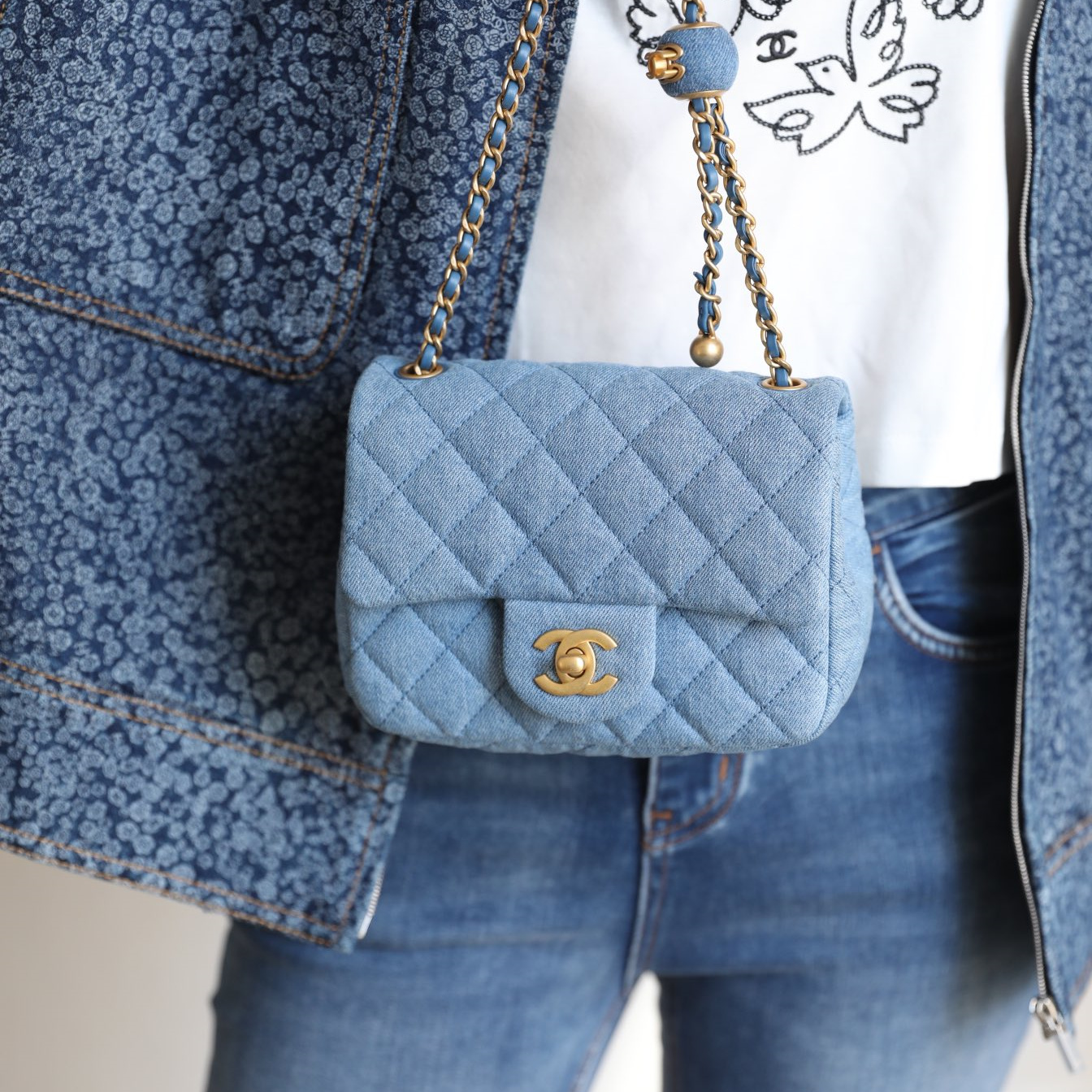 高仿Chanel高品質Denim牛仔金球包,原版開發專屬打造市面上獨家高端復刻,以傳統的口蓋包作為基礎設計,在材質上使用到水洗丹寧牛仔面料覆蓋包身.整個包型結構厚實感與質感同步在線.在手感上按壓包面外觀,立體感十足,邊角封邊無瑕疵,雙層純手法縫製而成可比對專櫃正品.