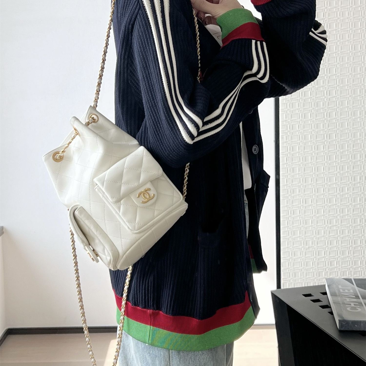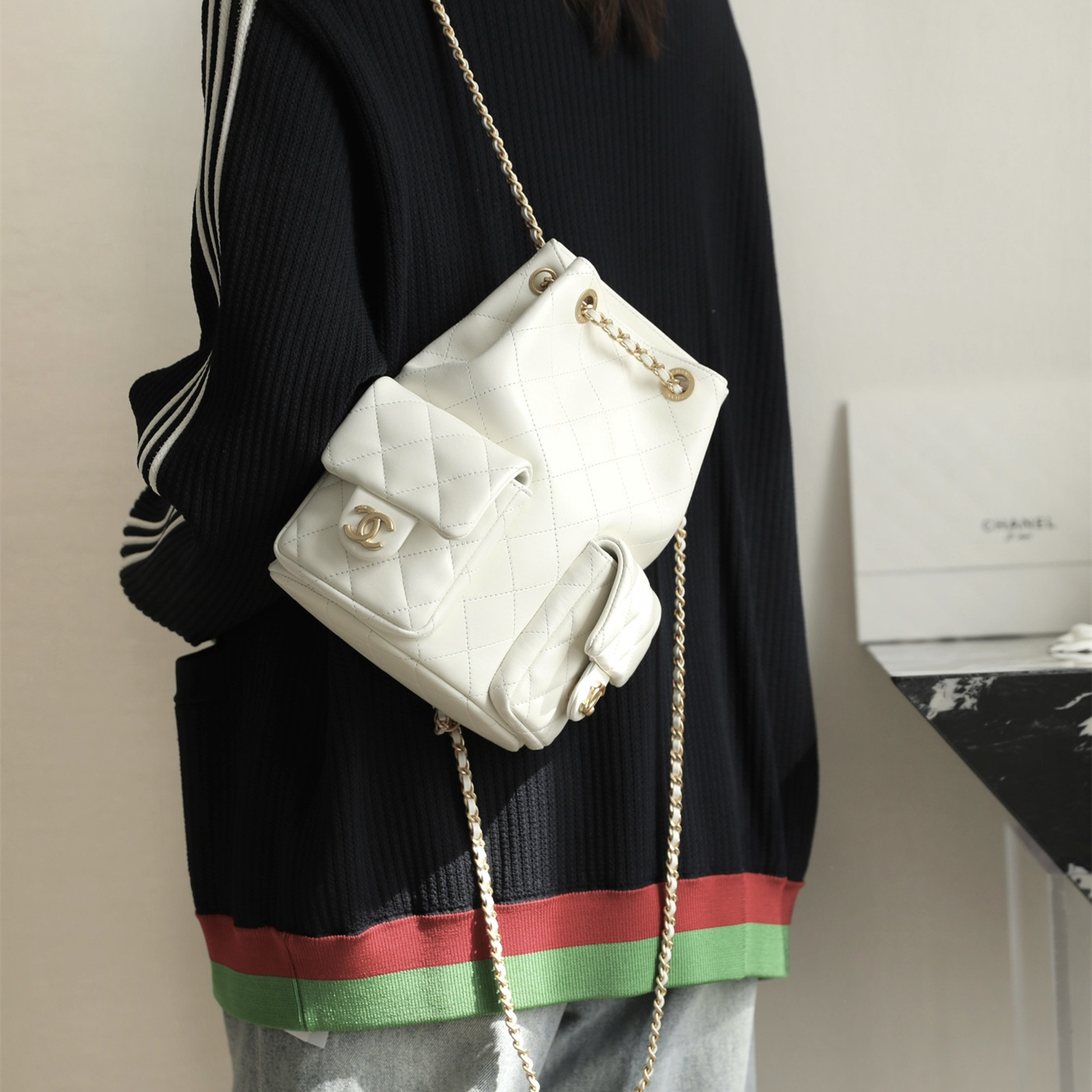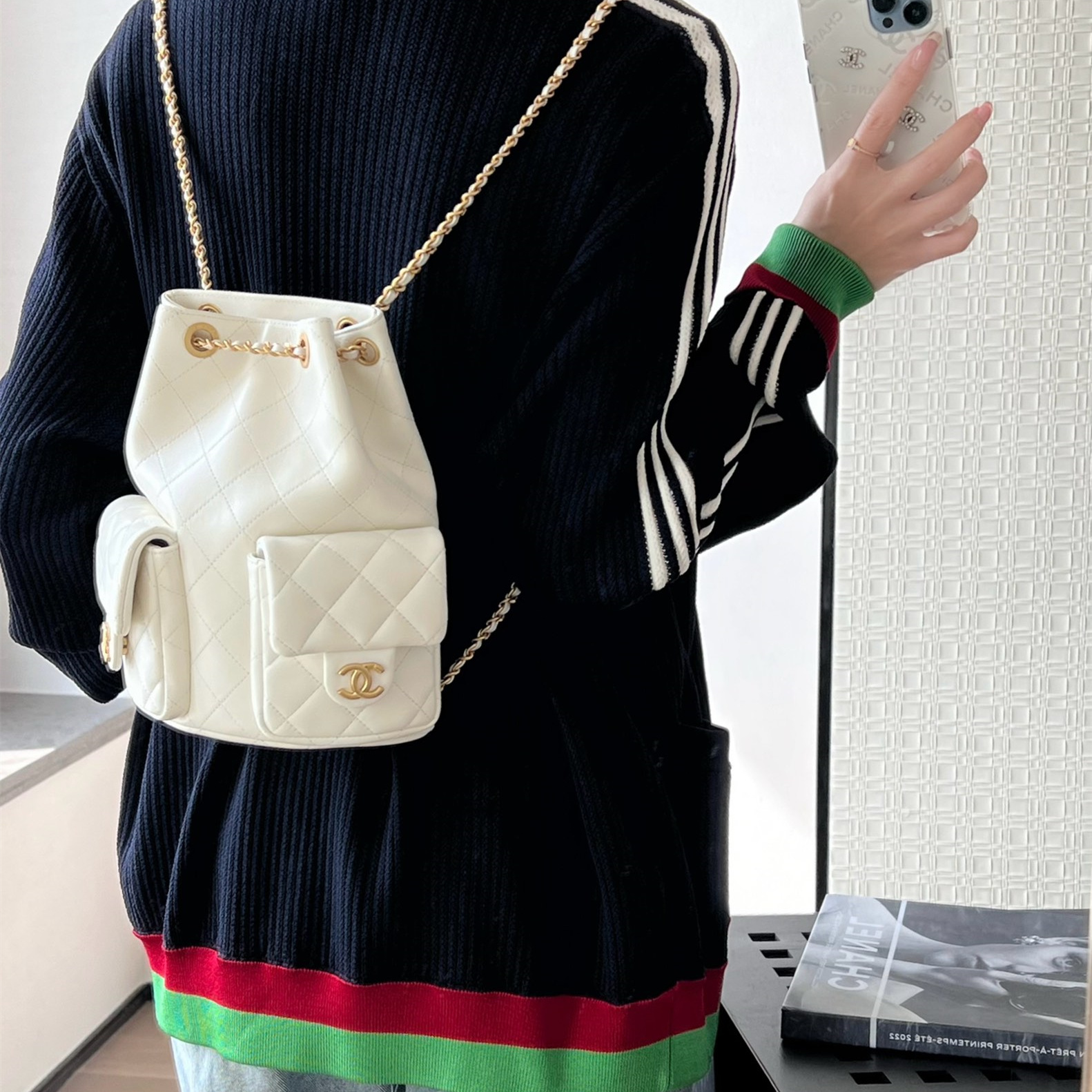 高仿Chanel*25C系列AS5305小羊皮雙肩袋白色免檢版