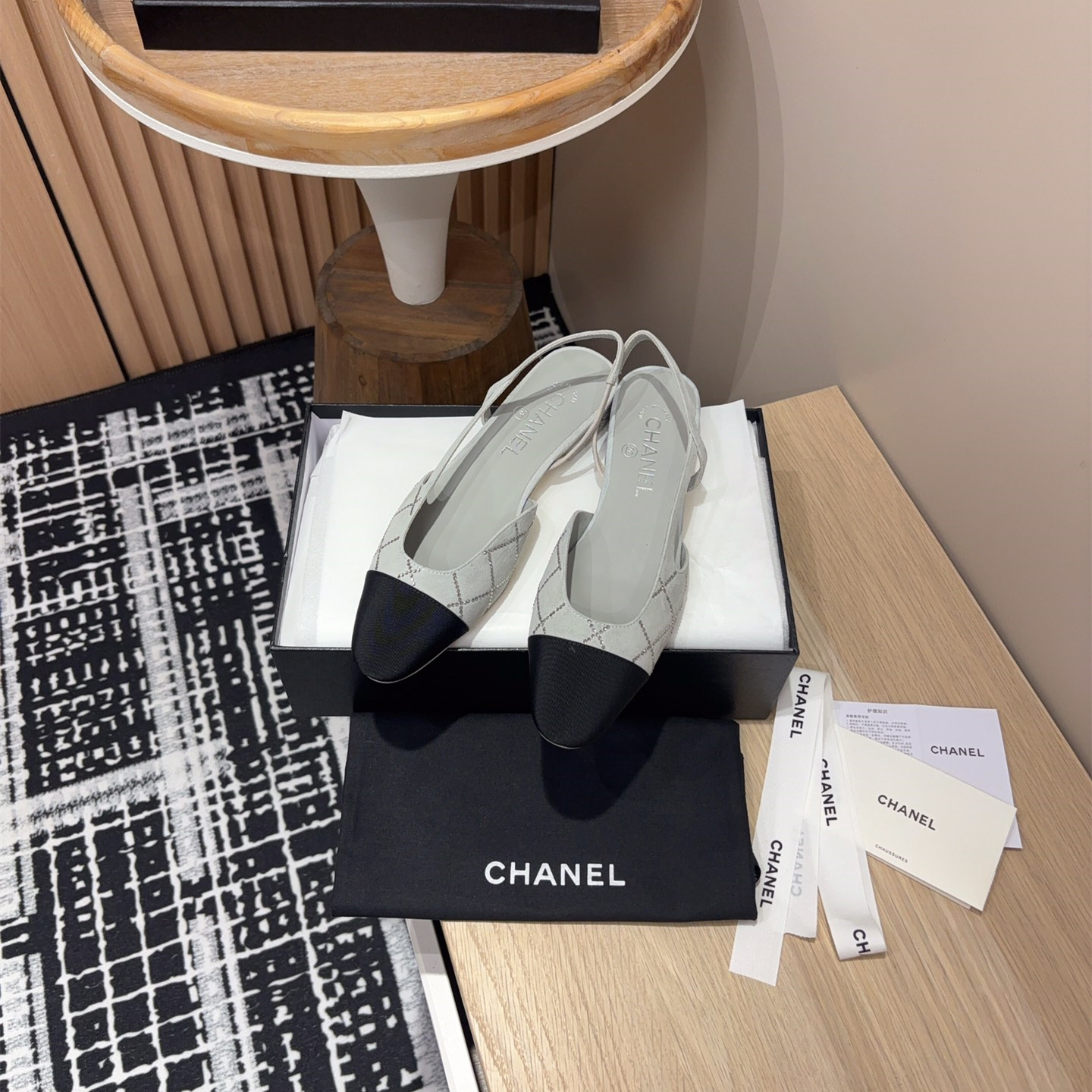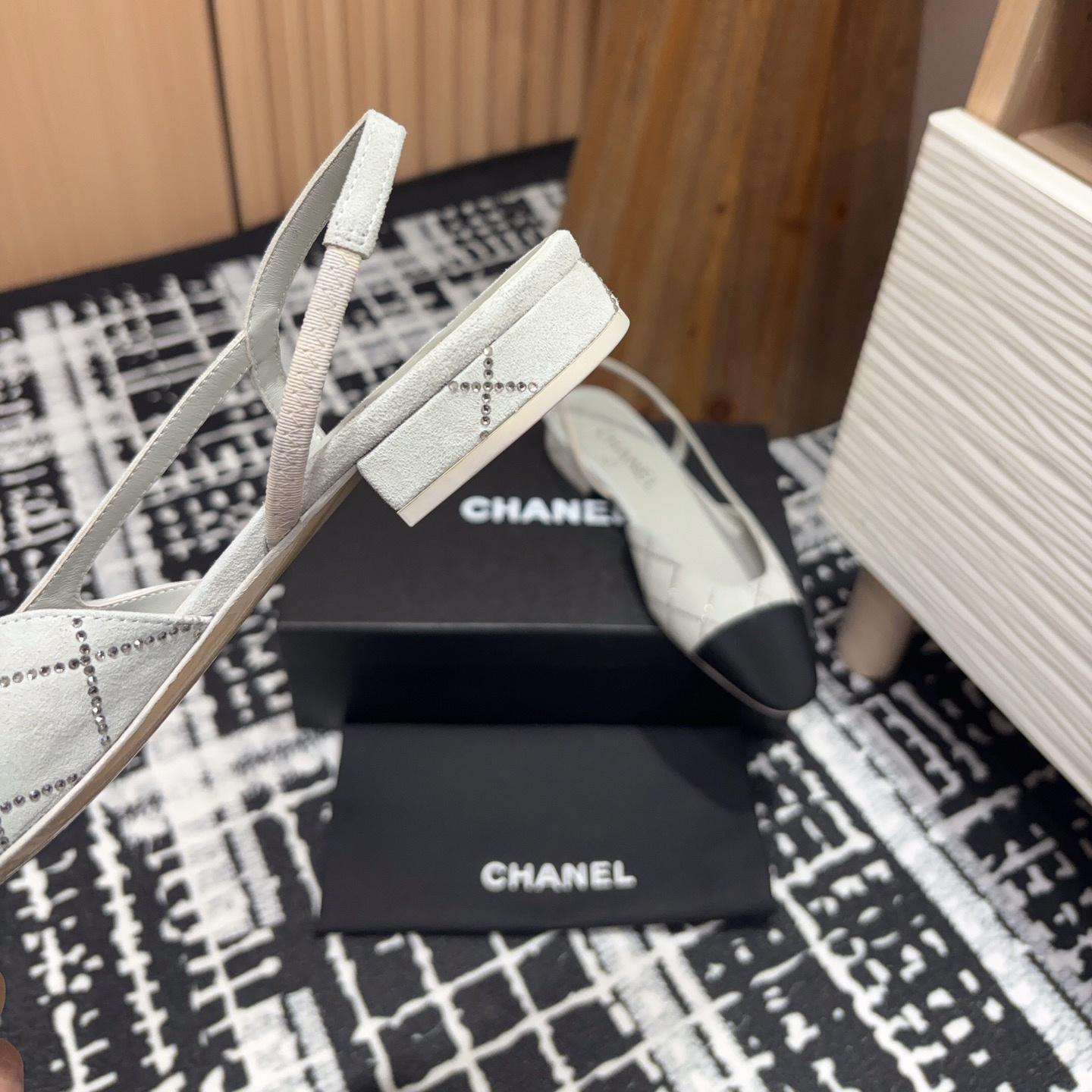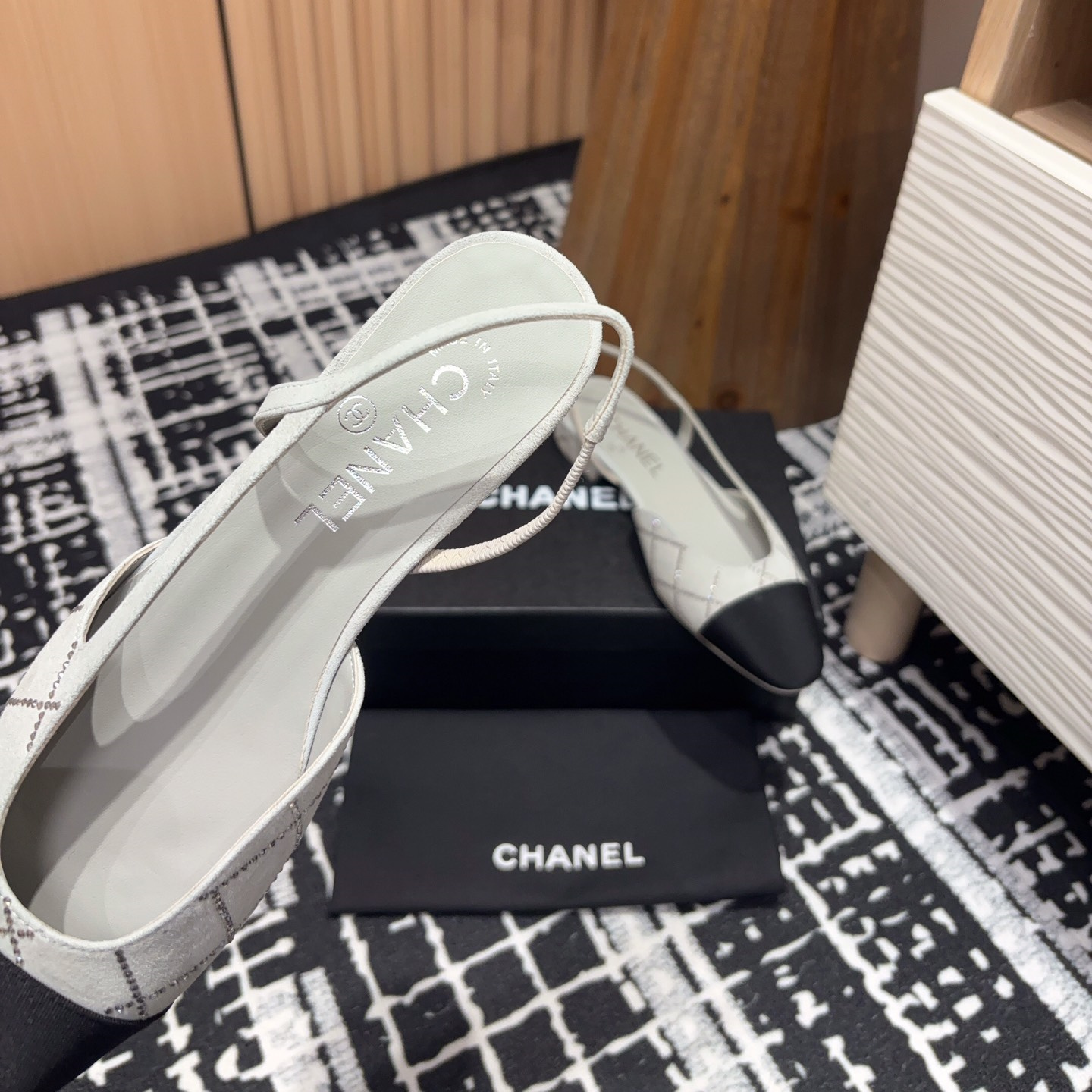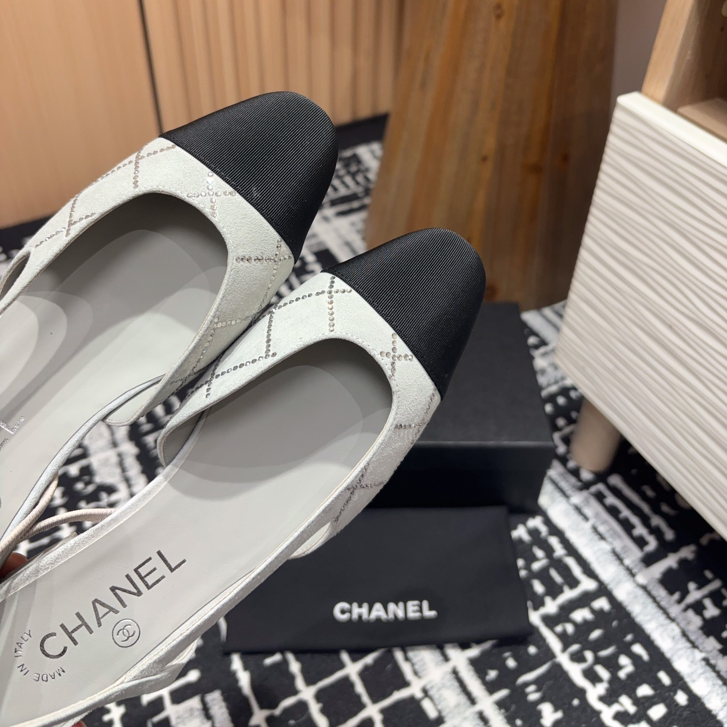 新款高仿Chanel小香燙鉆後空Sling-back涼鞋平底/粗跟.Sling-back於1957年問世,之後two-tone設計成為chane*經典之作!最新羊猄燙鉆鞋面超完美的細節