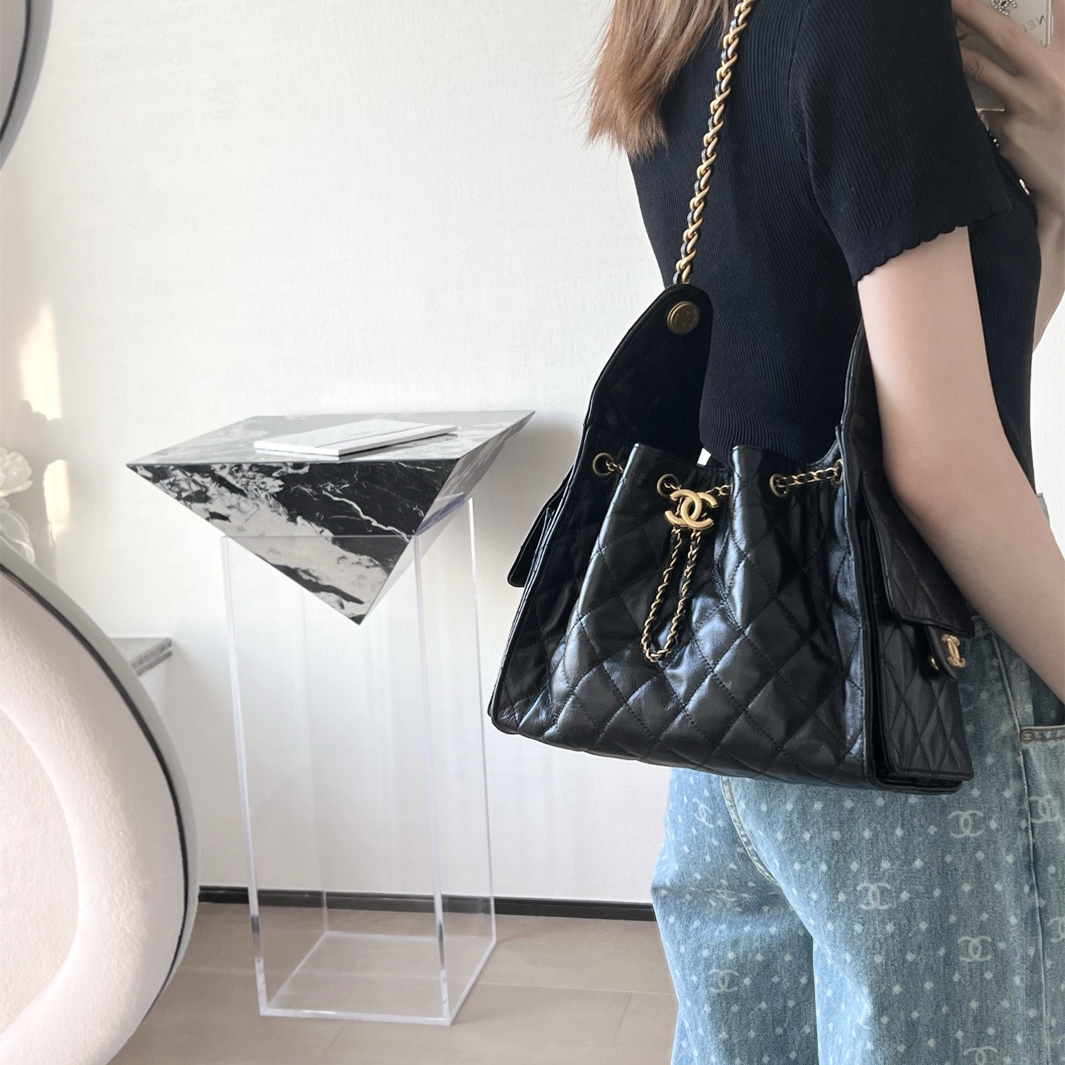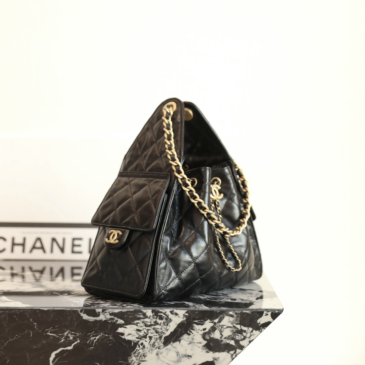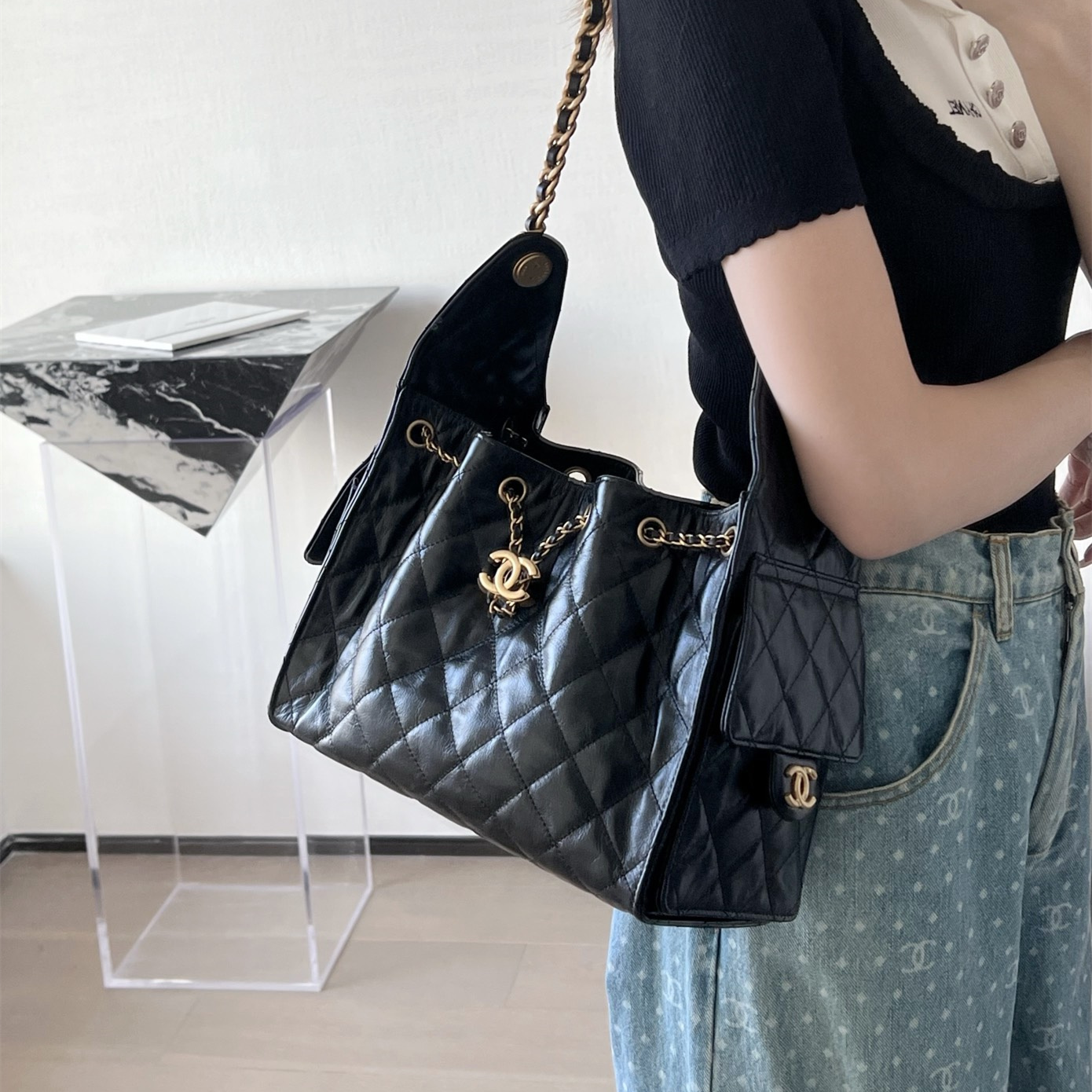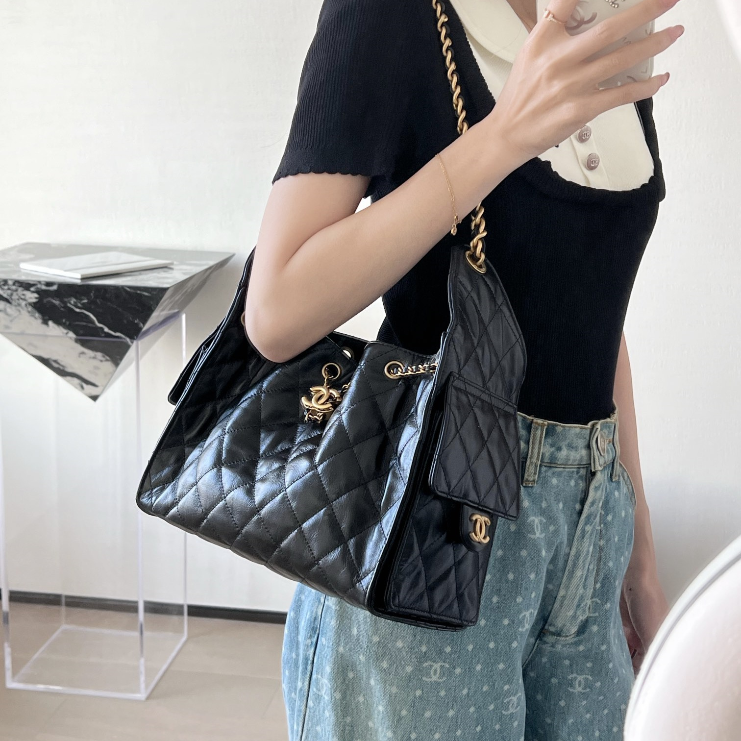 高仿Chanel*25P系列AS5293亮面牛皮單肩購物袋小號黑色免檢版
