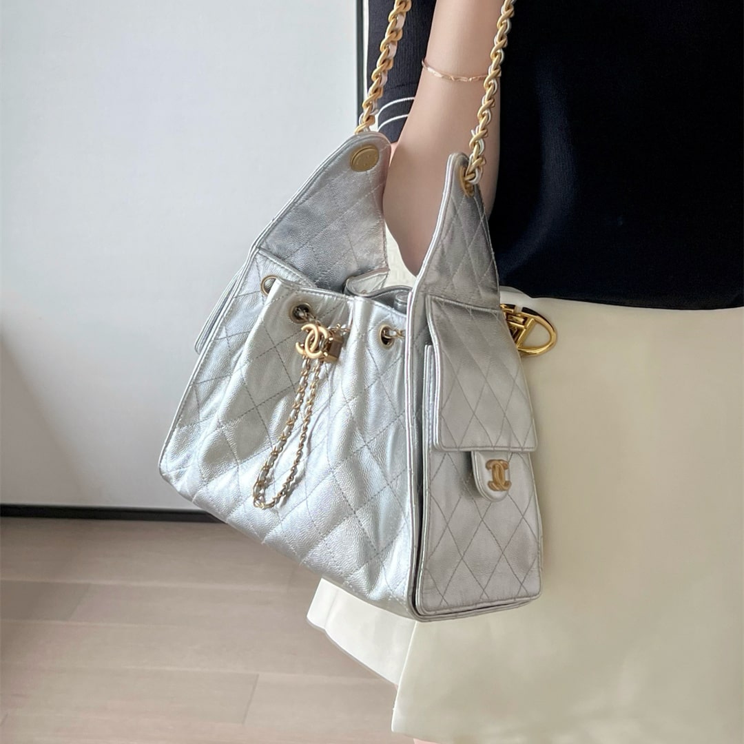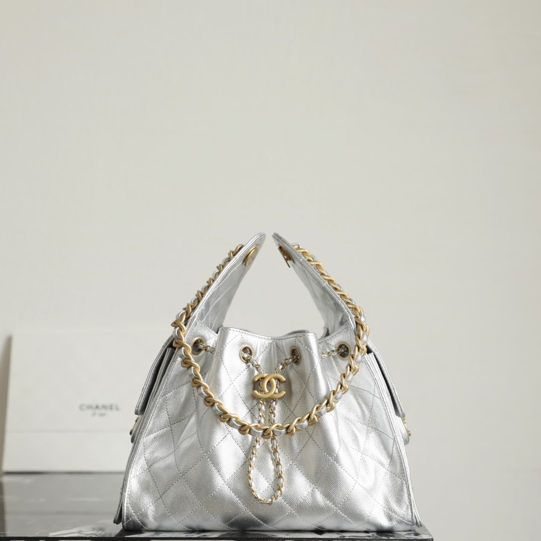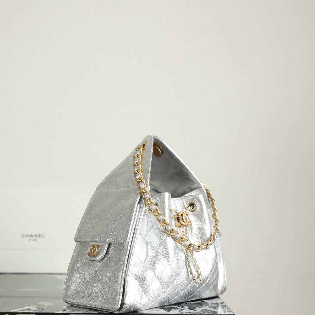 全新到貨高仿Chanel 25S系列嬉皮 小號購物袋,媽咪包,流浪包金屬銀色漆皮,秀場熱門 ,設計獨特,相當霸氣的風格超大容量輕松裝下日常所需!逛街,旅行都是超高值好夥伴.