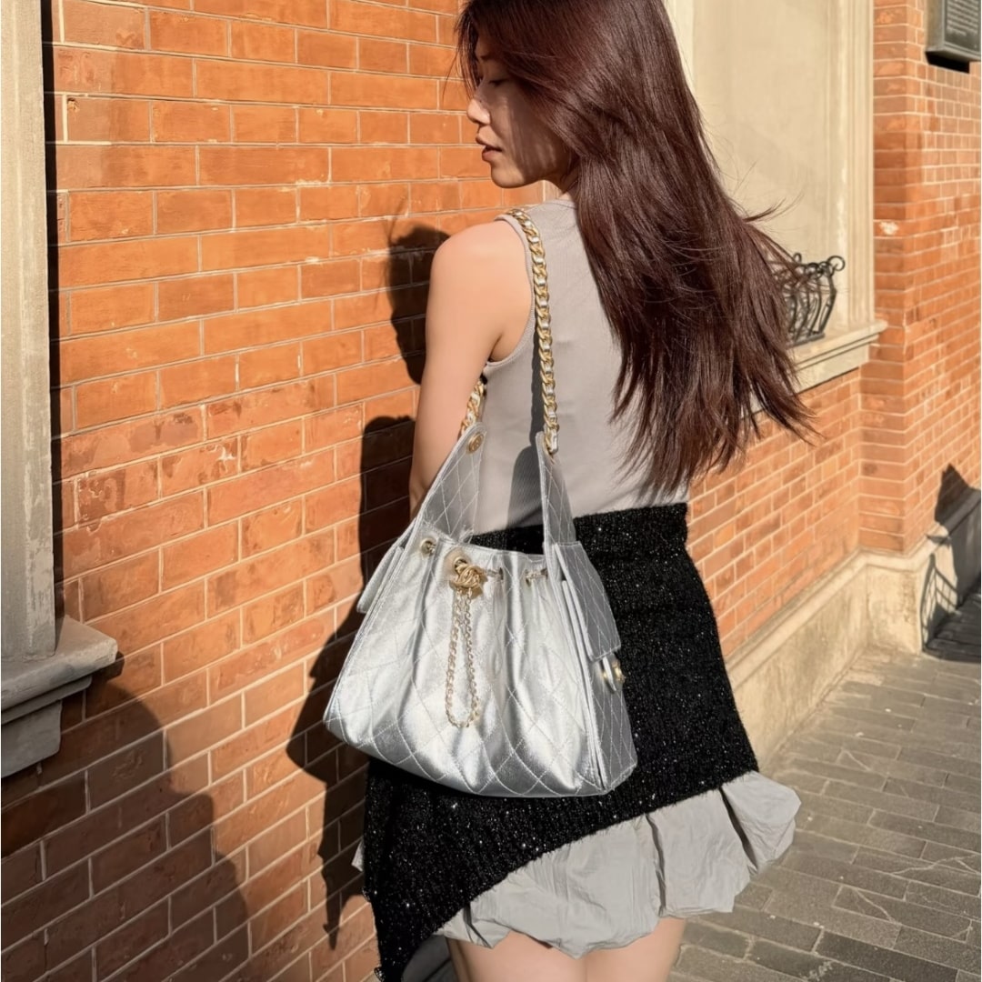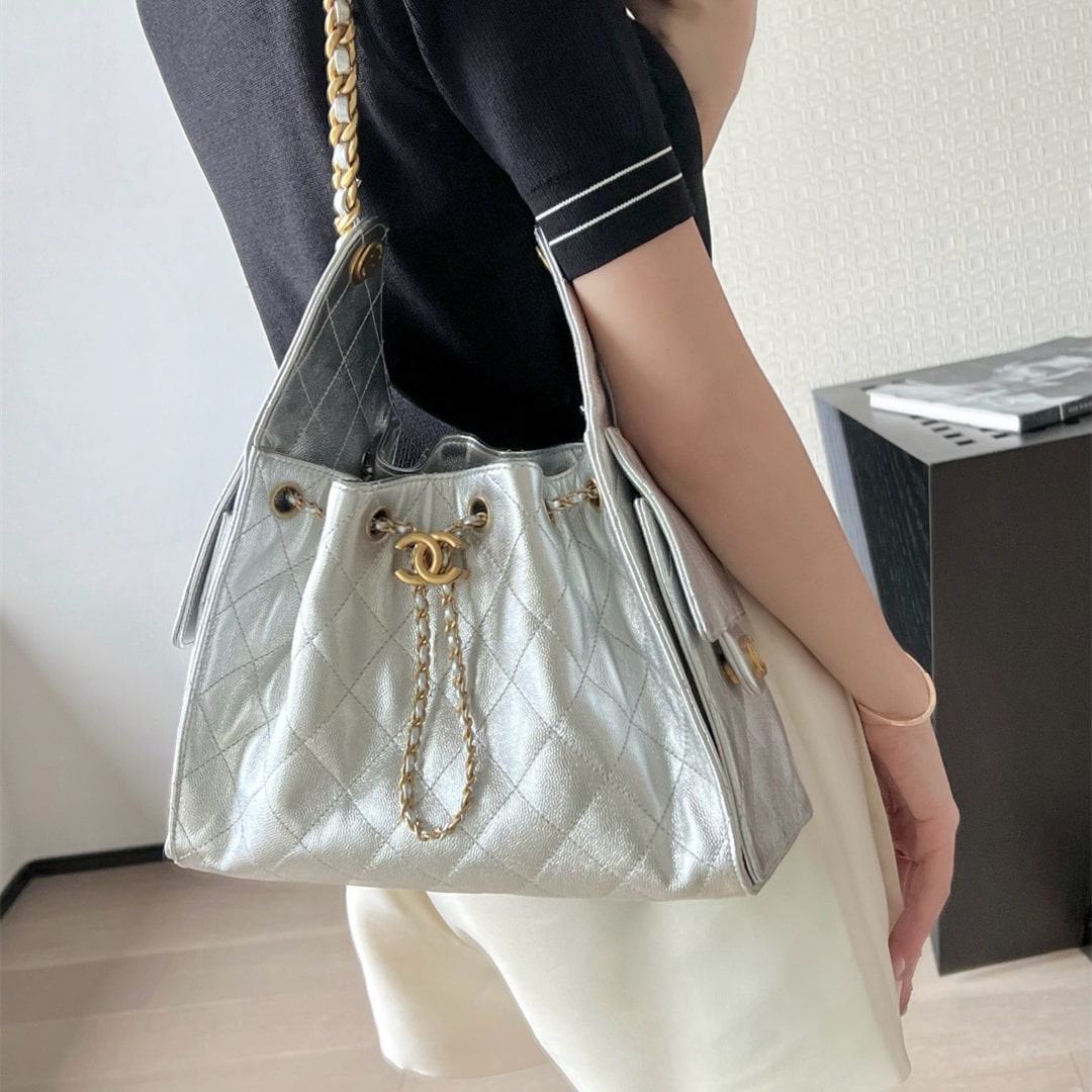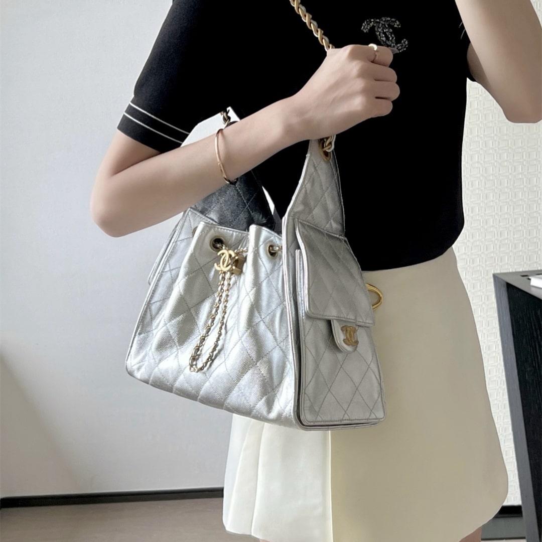 全新到貨高仿Chanel 25S系列嬉皮 小號購物袋,媽咪包,流浪包金屬銀色漆皮,秀場熱門 ,設計獨特,相當霸氣的風格超大容量輕松裝下日常所需!逛街,旅行都是超高值好夥伴.