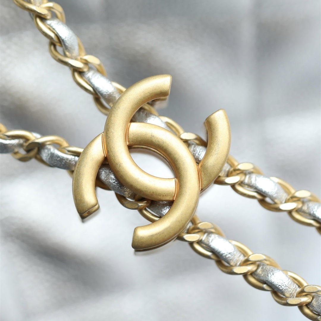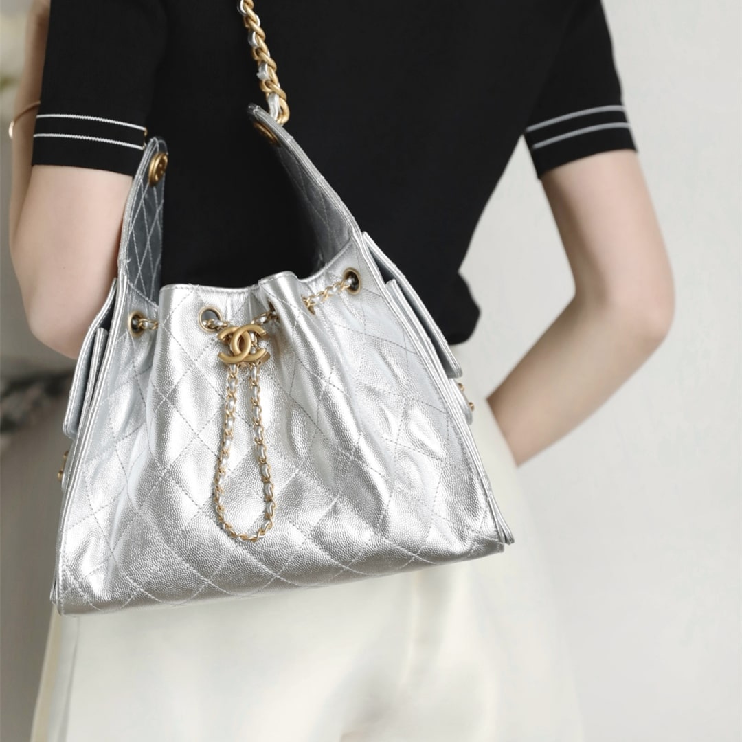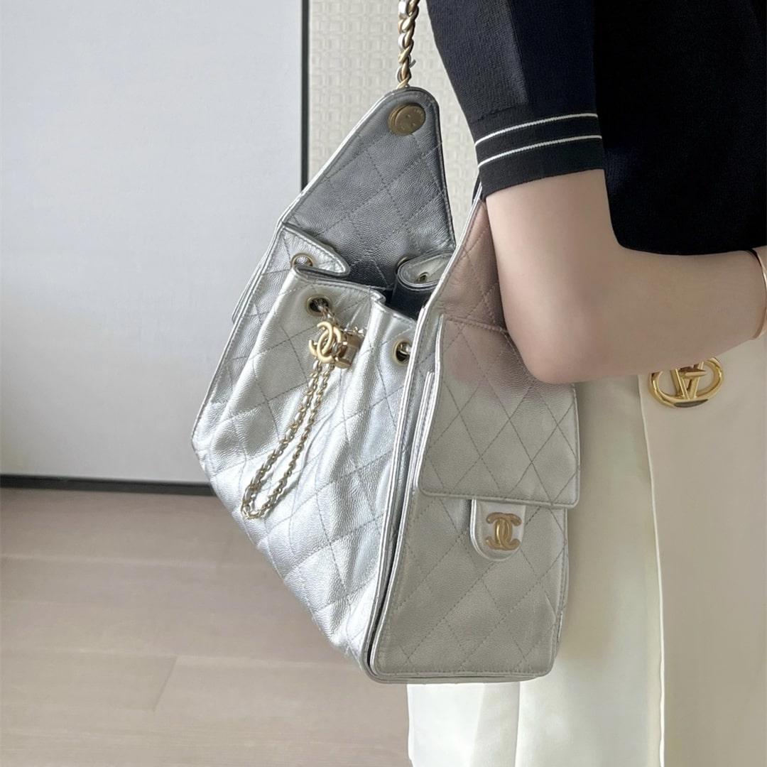 高仿Chanel*25S系列AS5293金屬牛皮流浪包銀色小號免檢版
