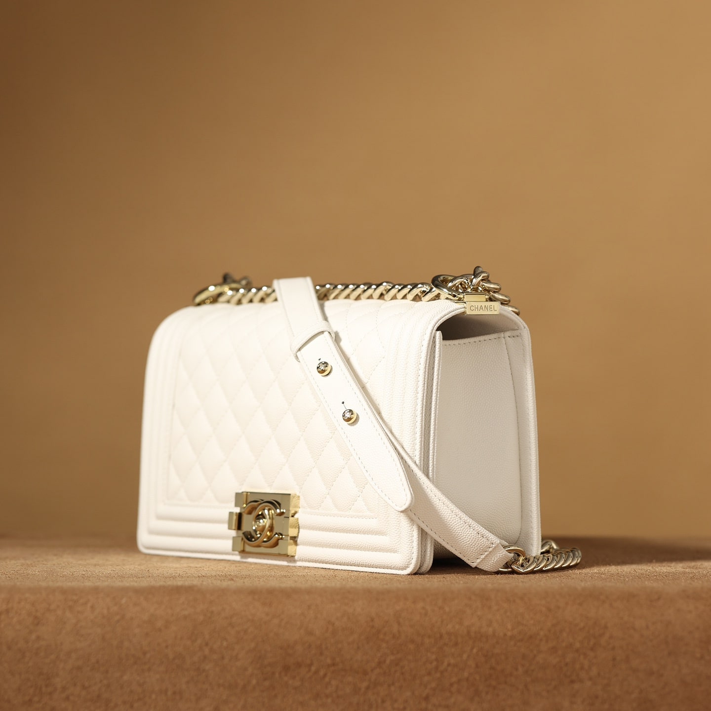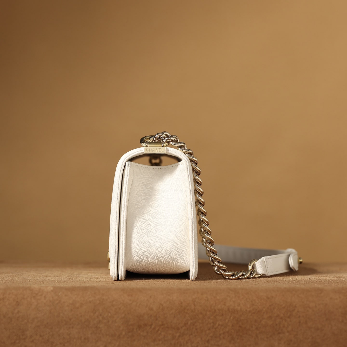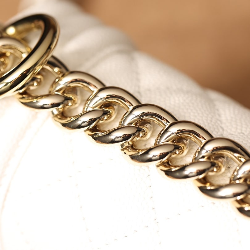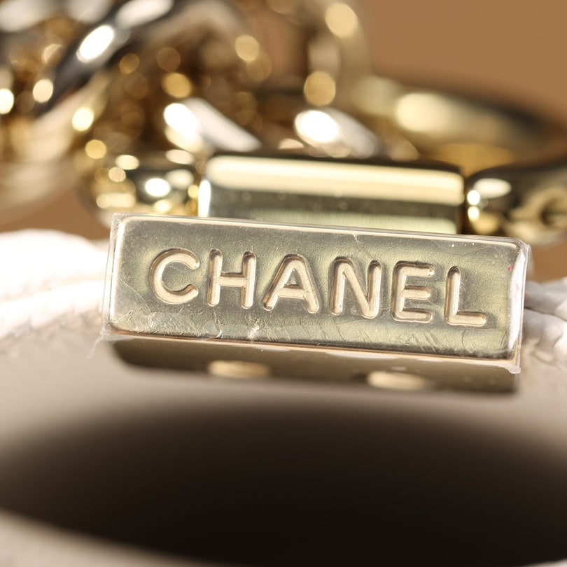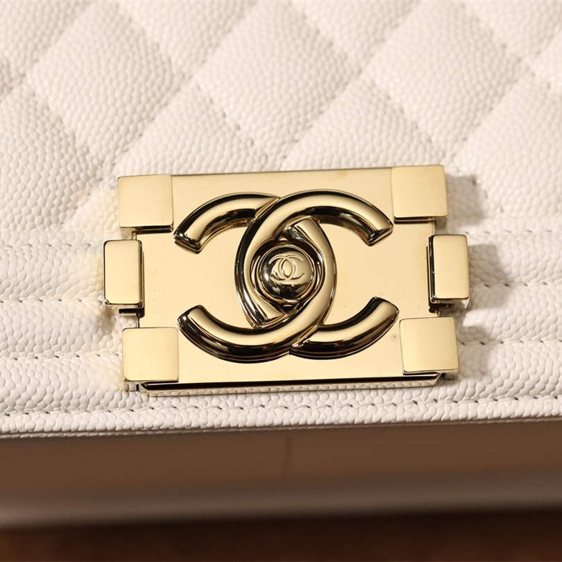 高仿Chanel香奈兒LeBoy小號白色顆粒壓花小牛皮,金屬口蓋五金是淺金色.獨家歐洲渠道貨首發100%進口原廠材料組裝的正品尾單貨源獨家進口原廠皮牛皮,米粒感飽滿,手感非常好,原廠的純銅五金+純鋼五金非常有份量.
