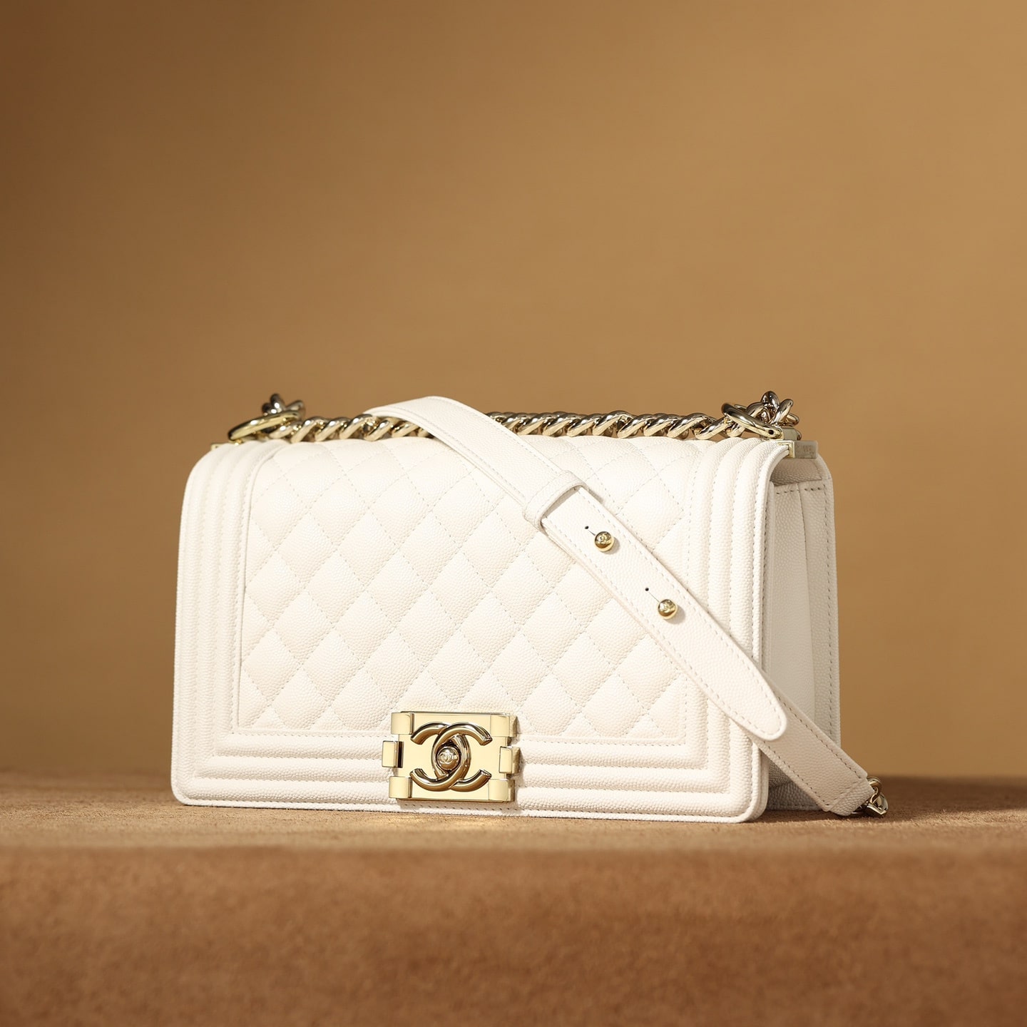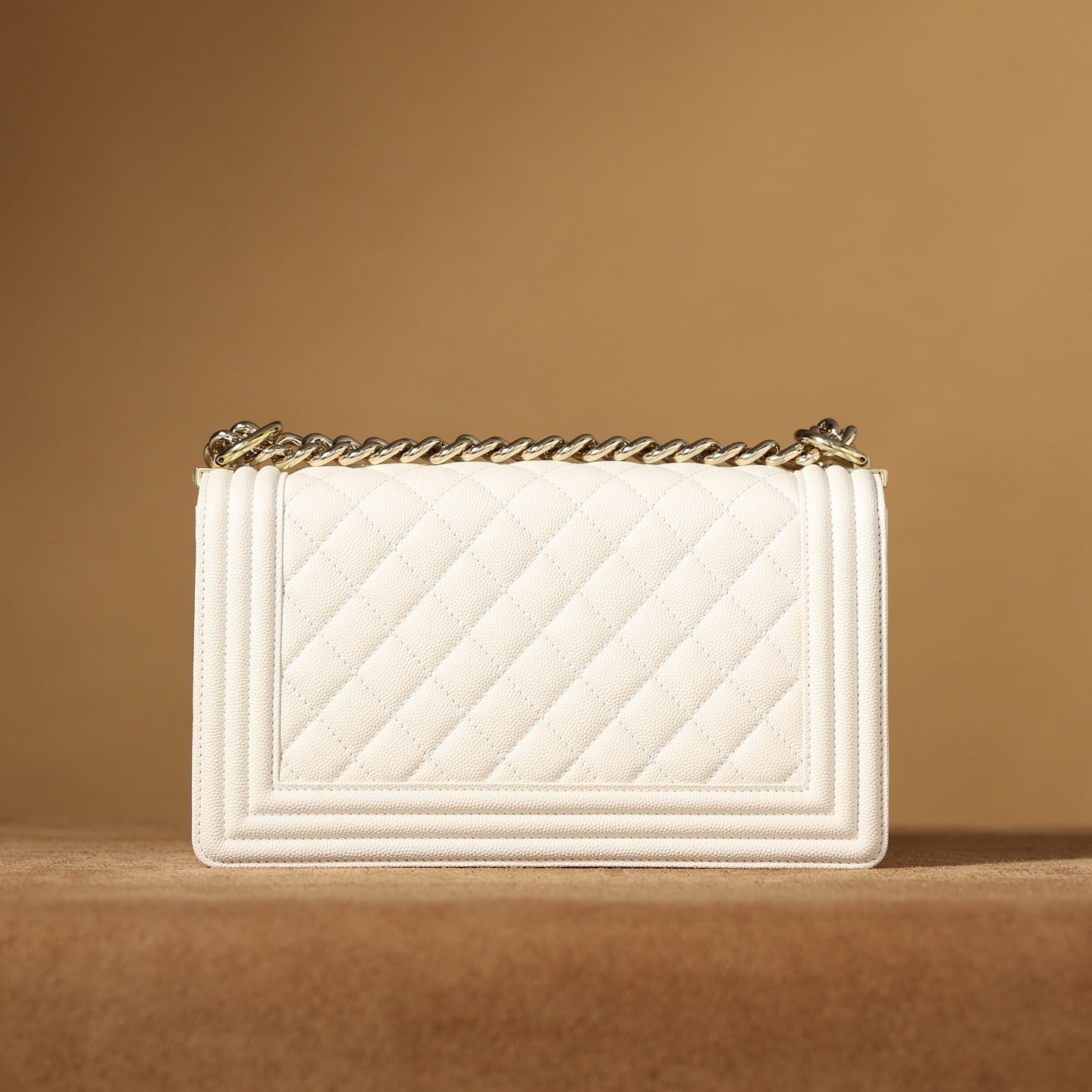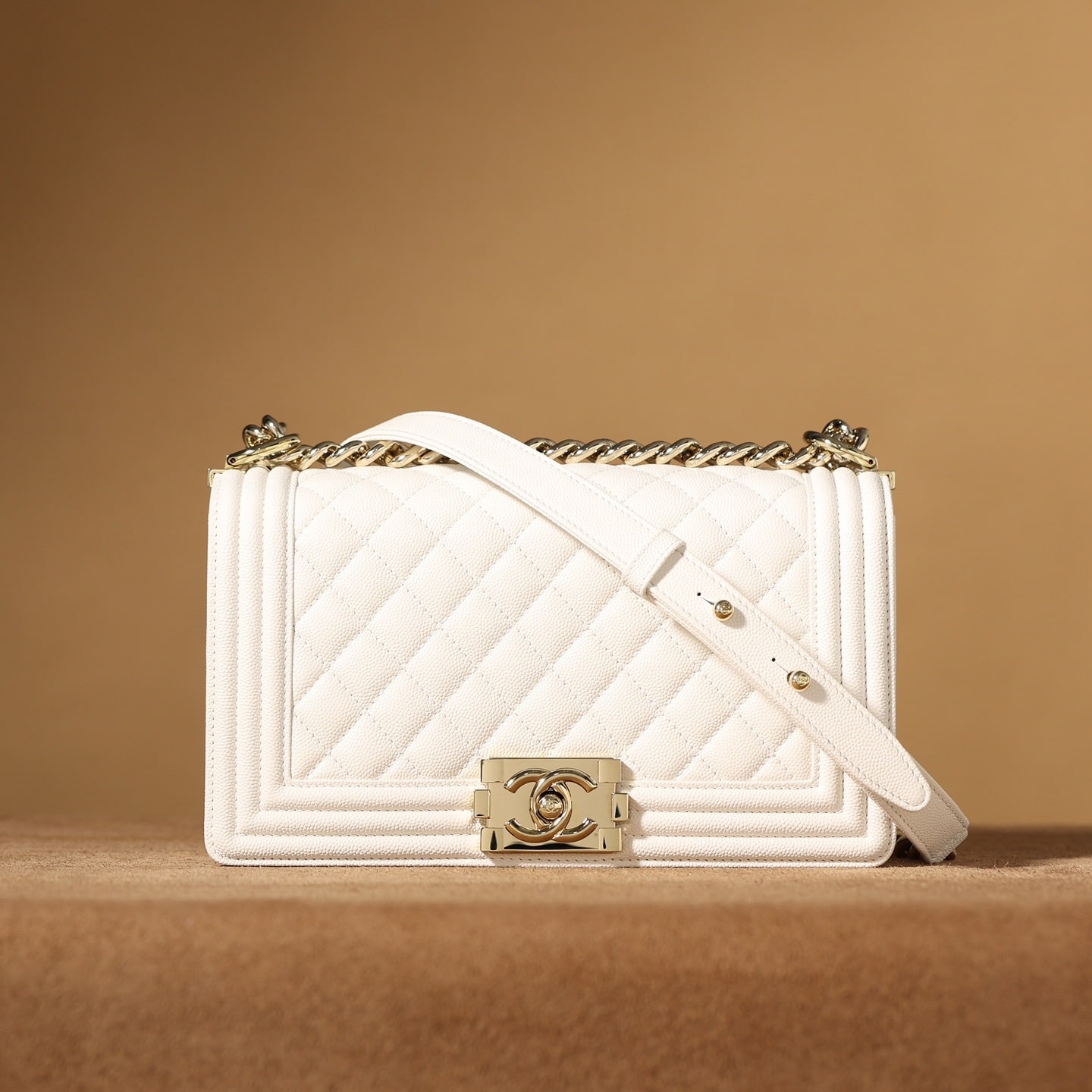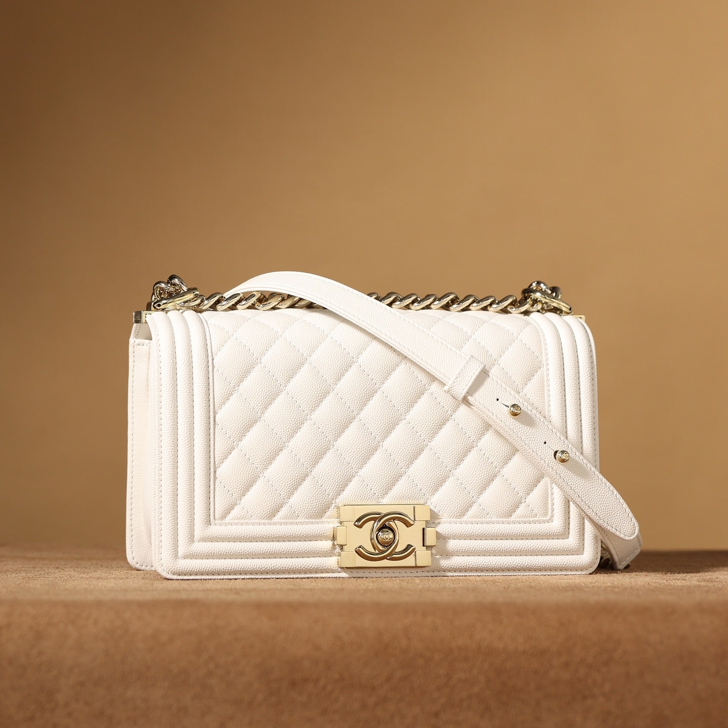 高仿Chanel香奈兒LeBoy小號白色顆粒壓花小牛皮,金屬口蓋五金是淺金色.獨家歐洲渠道貨首發100%進口原廠材料組裝的正品尾單貨源獨家進口原廠皮牛皮,米粒感飽滿,手感非常好,原廠的純銅五金+純鋼五金非常有份量.