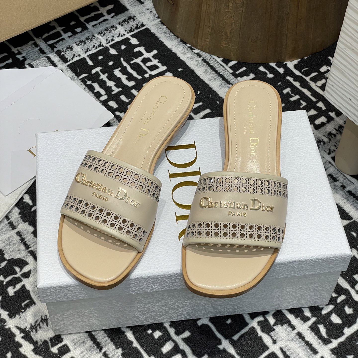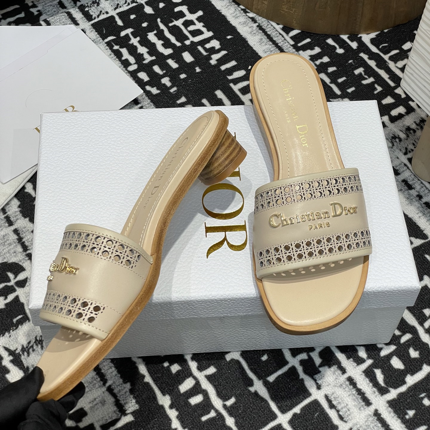 這款D-Lane涼拖彰顯經典風格,黑色牛皮革鞋面,展示鏤空藤格紋圖案,飾以金色飾面金屬 Christian Dior Paris 標誌,彰顯時尚氣質.加墊皮革內底打造舒適的穿著體驗,簡約的設計便於穿脫,打造休閑的造型.