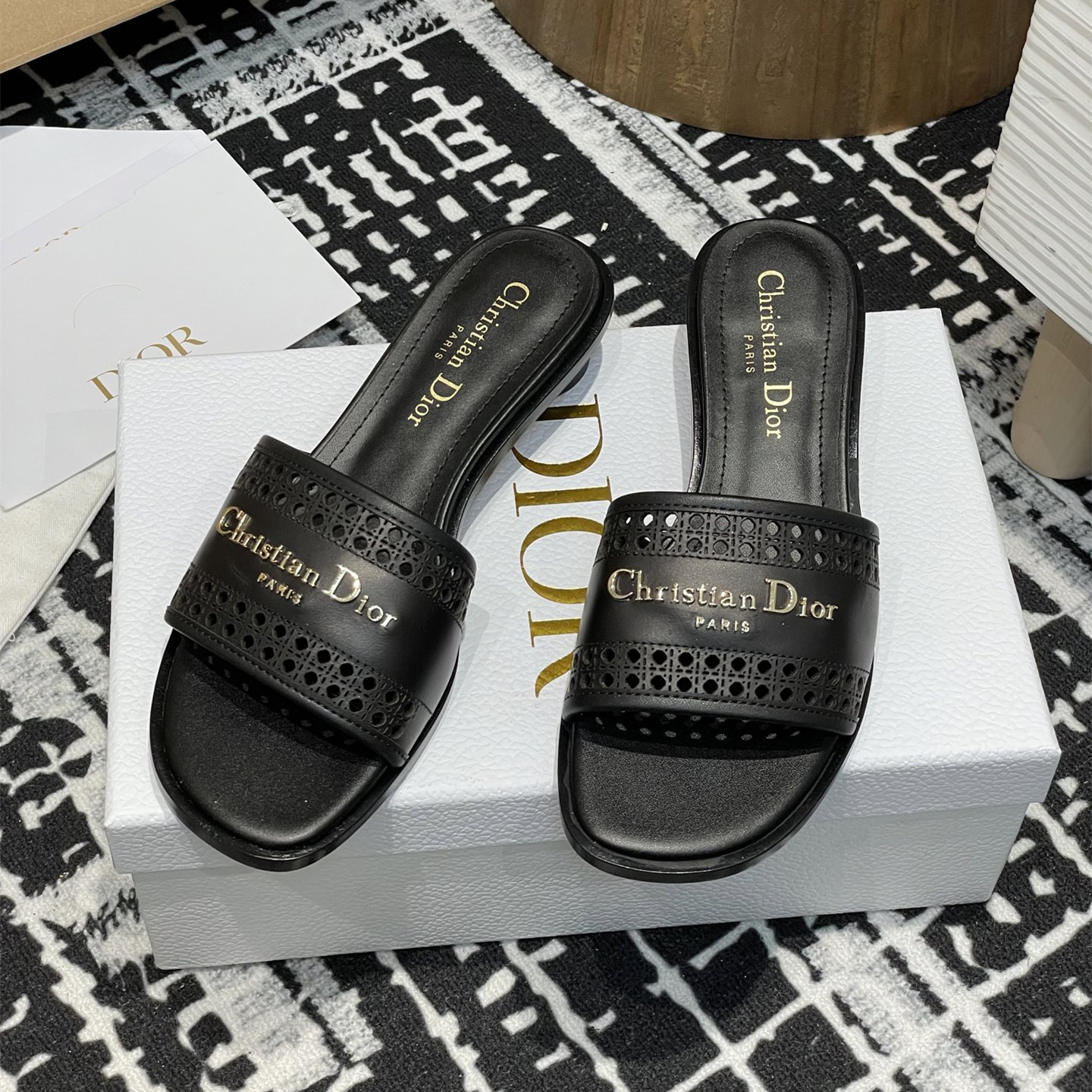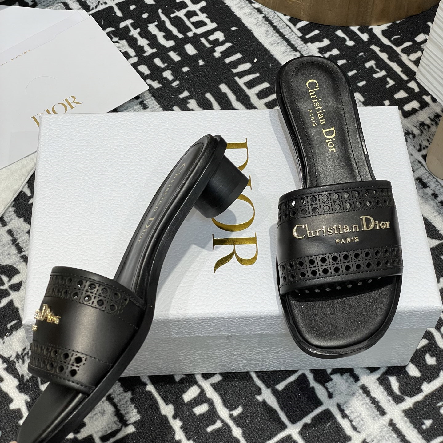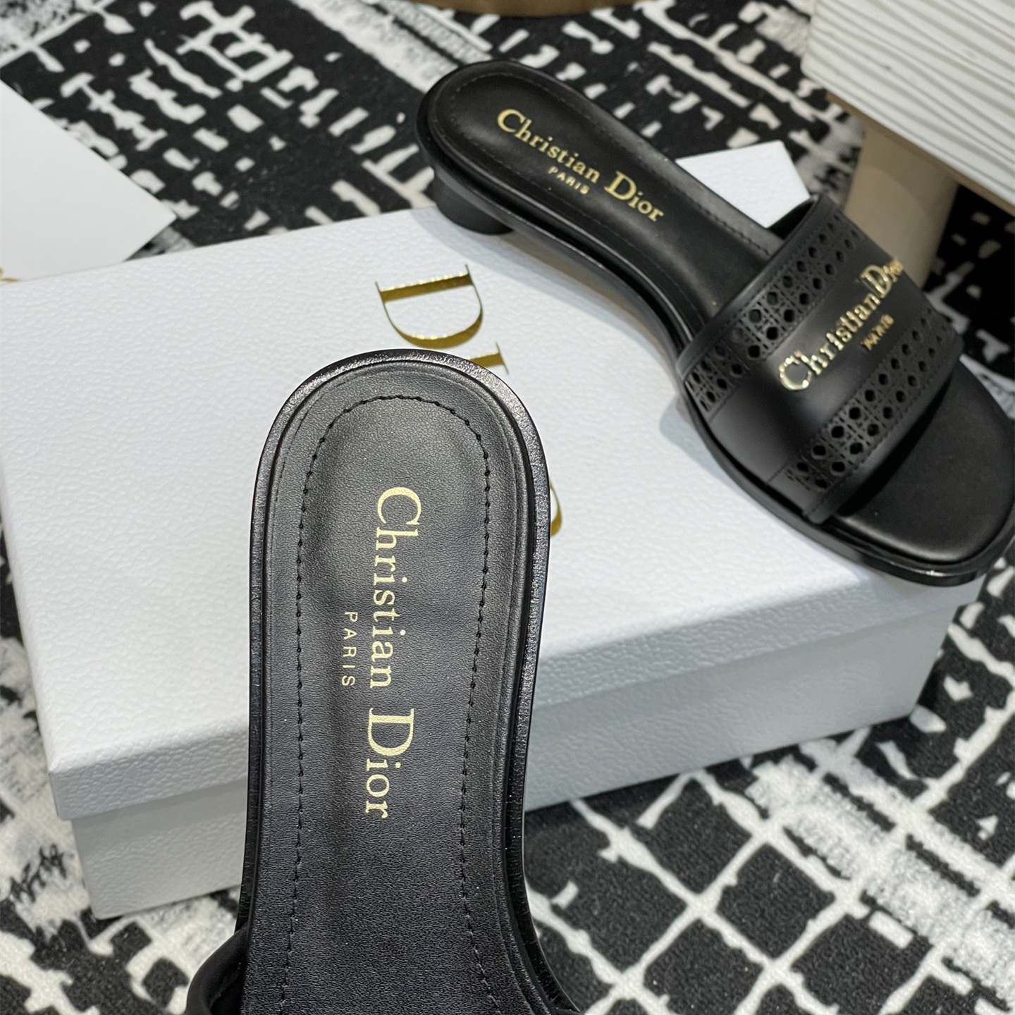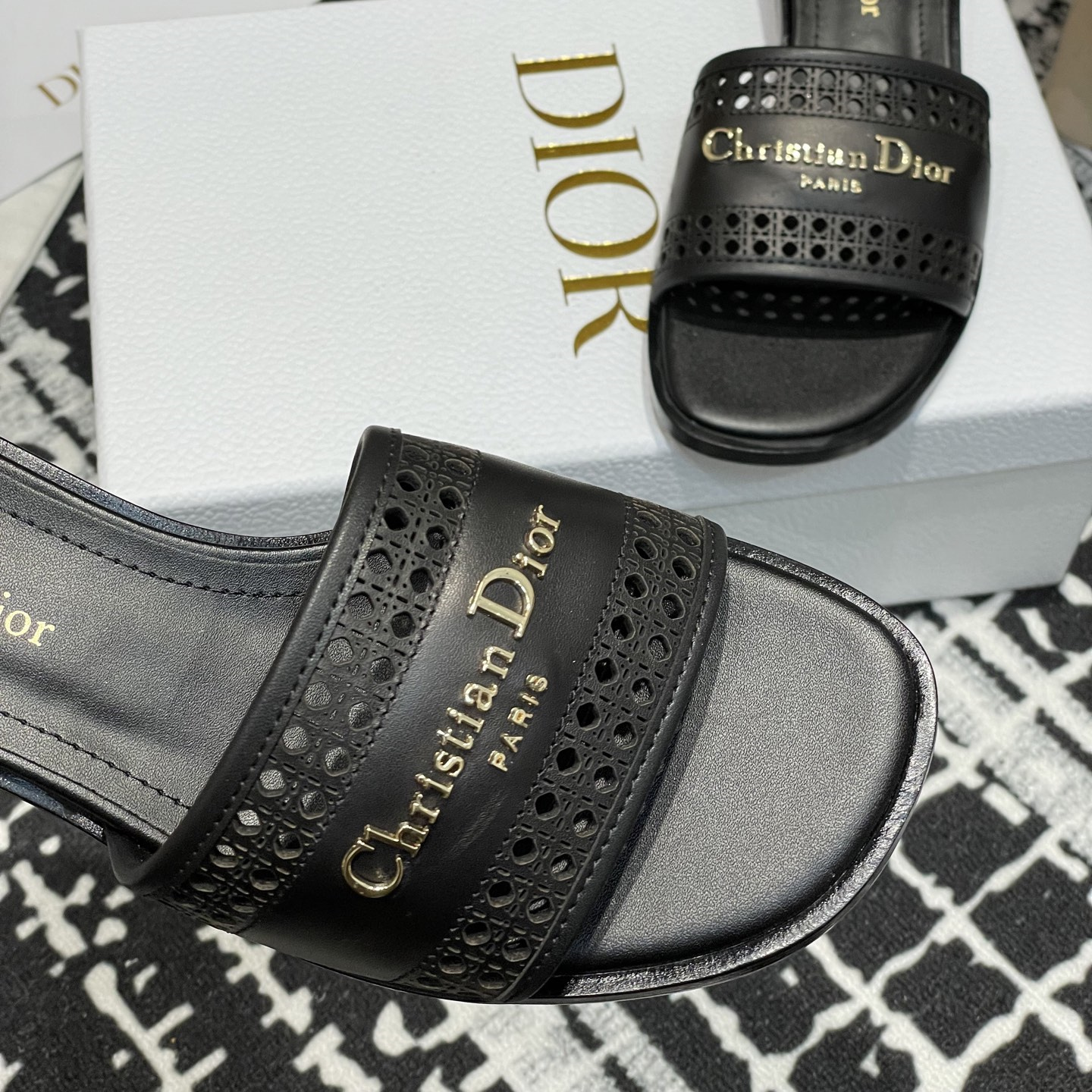 這款D-Lane涼拖彰顯經典風格,黑色牛皮革鞋面,展示鏤空藤格紋圖案,飾以金色飾面金屬 Christian Dior Paris 標誌,彰顯時尚氣質.加墊皮革內底打造舒適的穿著體驗,簡約的設計便於穿脫,打造休閑的造型.