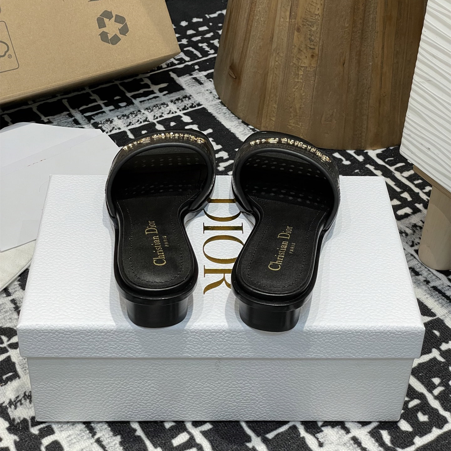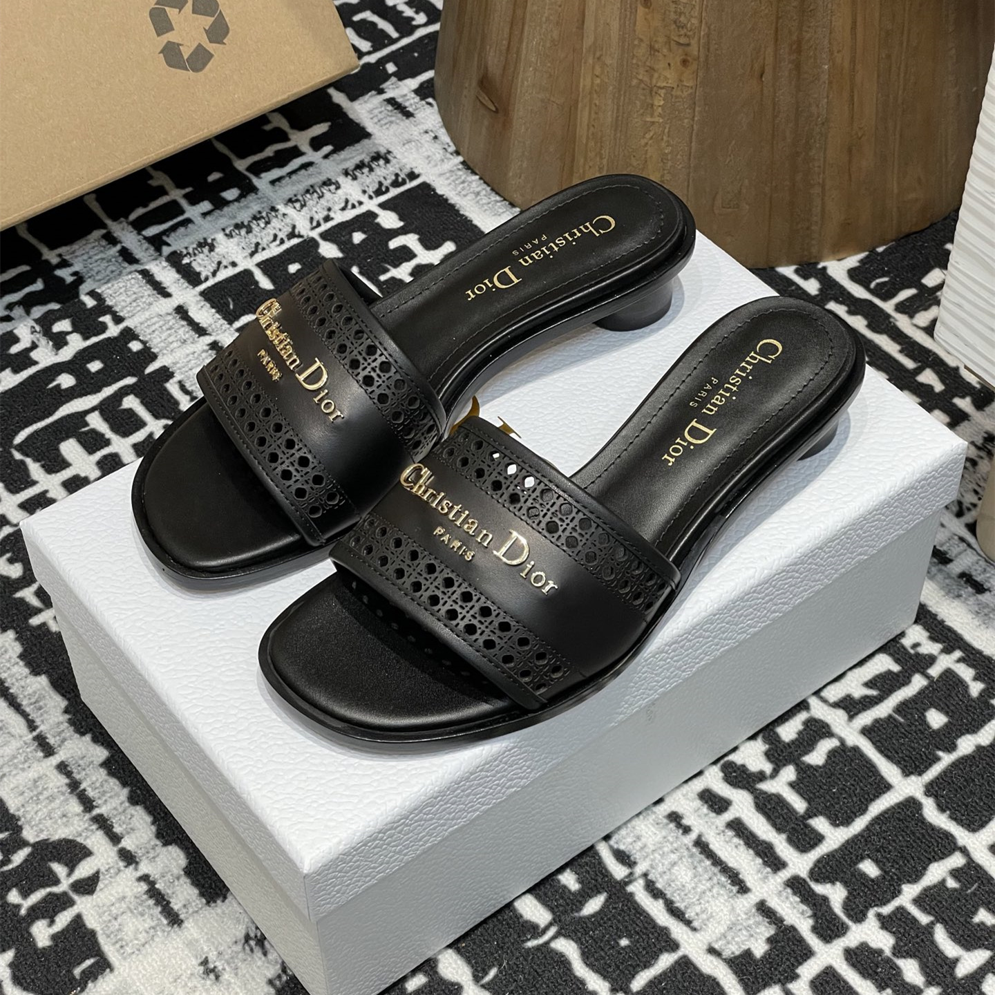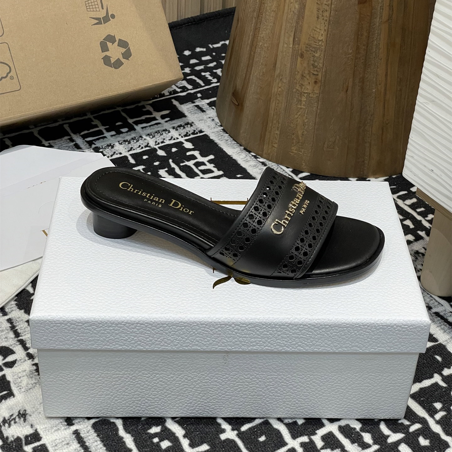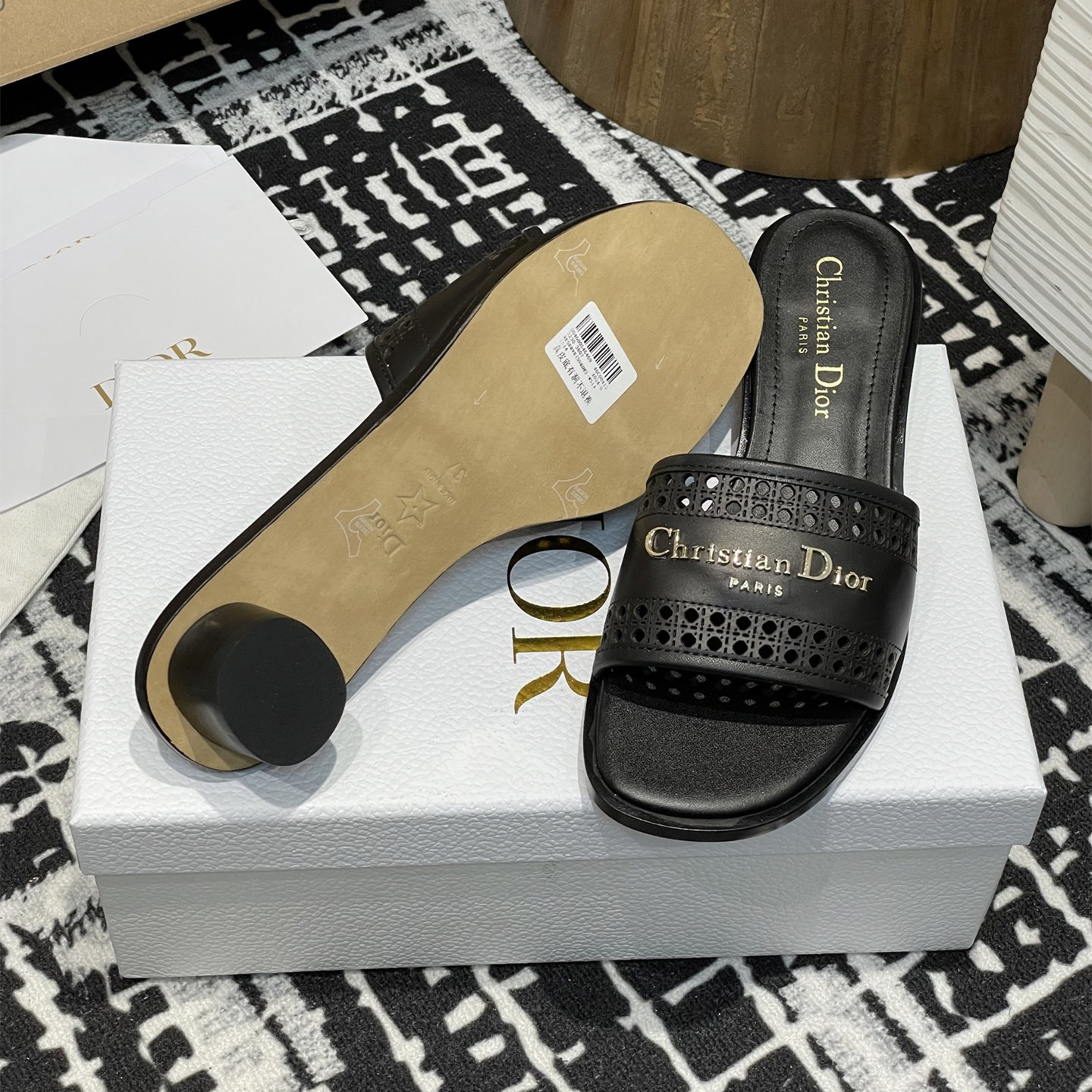 這款D-Lane涼拖彰顯經典風格,黑色牛皮革鞋面,展示鏤空藤格紋圖案,飾以金色飾面金屬 Christian Dior Paris 標誌,彰顯時尚氣質.加墊皮革內底打造舒適的穿著體驗,簡約的設計便於穿脫,打造休閑的造型.