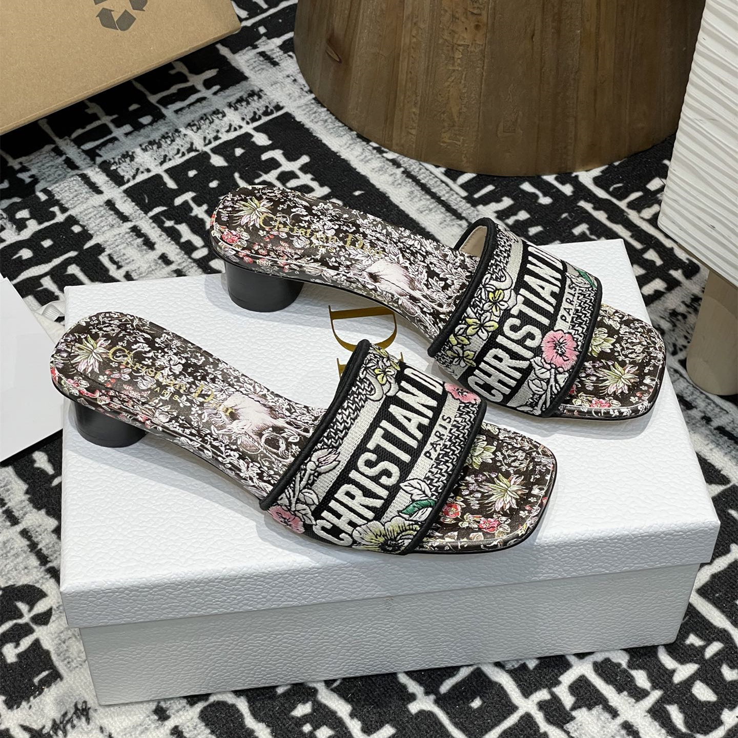 Paris標誌刺繡,富有辨識度,方形鞋頭更添時尚魅力.搭配3.5厘米圓柱形鞋跟更顯精致,為各式造型增添時尚氣息,可與該系列的其他Papillon茹伊印花單品搭配,打造配套造型.鞋面飾以Christian Dior