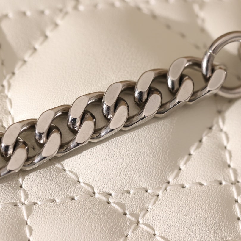 配備了克拆卸鏈條肩帶,不僅可以根據場合匹配不一樣的背戴方式,手拎的背法也是非常潮流.精選進口小羊皮打造17cm體積,大面積覆蓋整個包裹,杜絕使用市面上劣質版本的人造皮革,包邊縫線純手工製作,無任何線頭外露,與內縫線兼修.