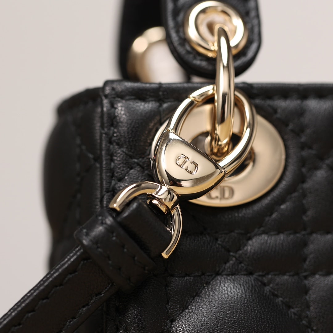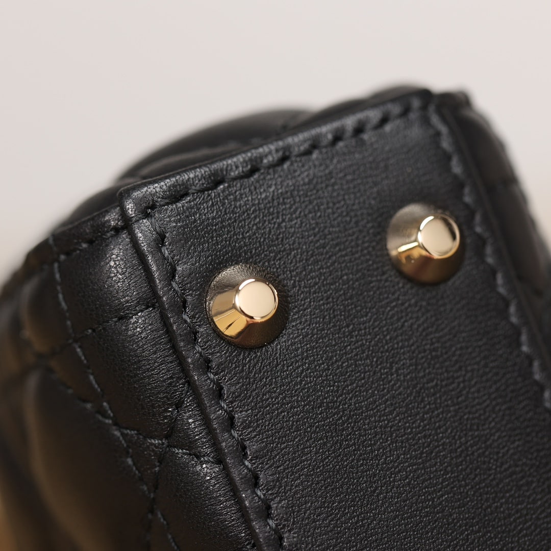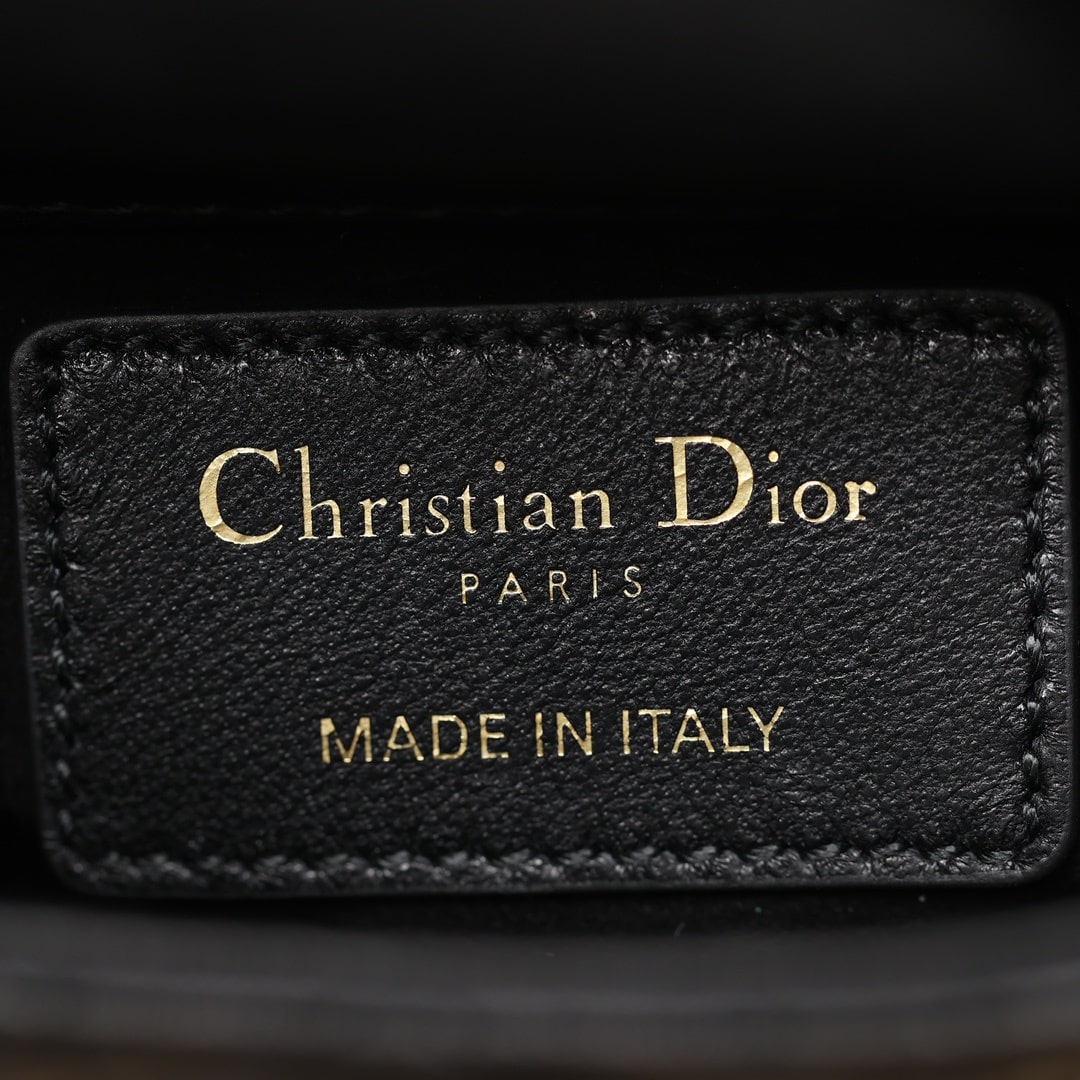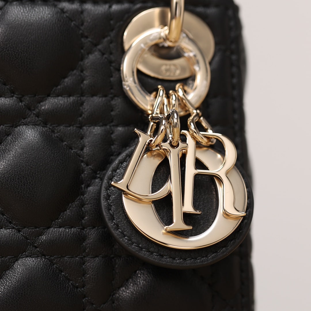 採用純進口黑色小羊皮材質打造,為精美的輪廓帶來一絲的圓潤角度,整個包型結構外觀是以藤格紋衍縫線作為主要設計,完美的9宮格,與黑色形成了高級美感.配備的淡金扣具,D.I.O.R字體精度打磨,部分環扣刻度相關CD與Dior字面,清晰工整無誤差.