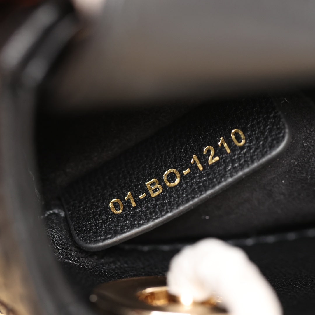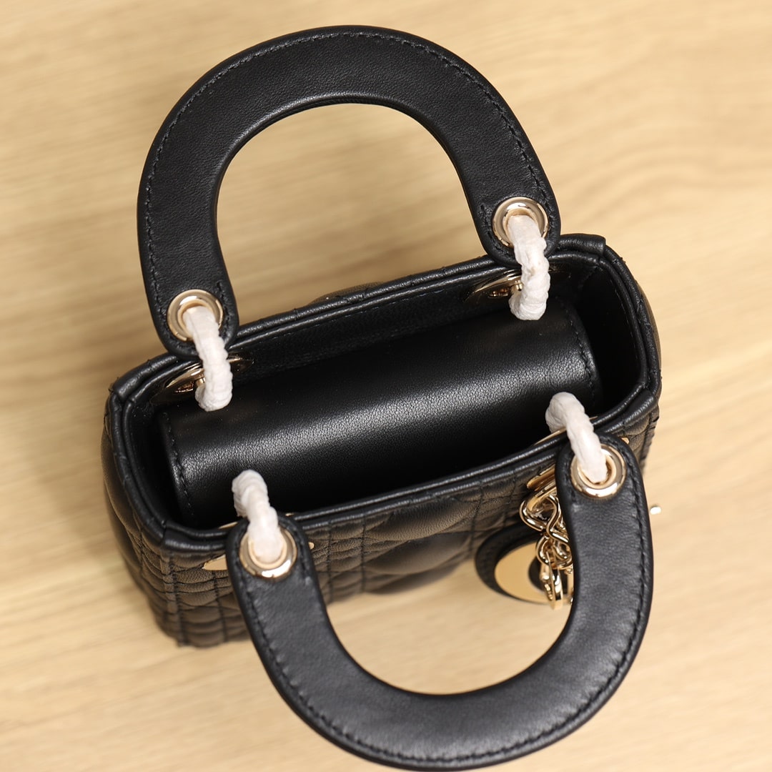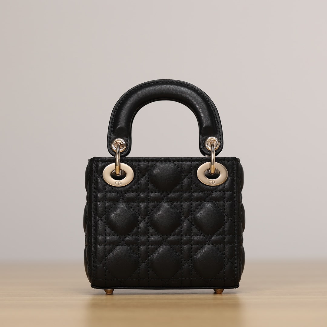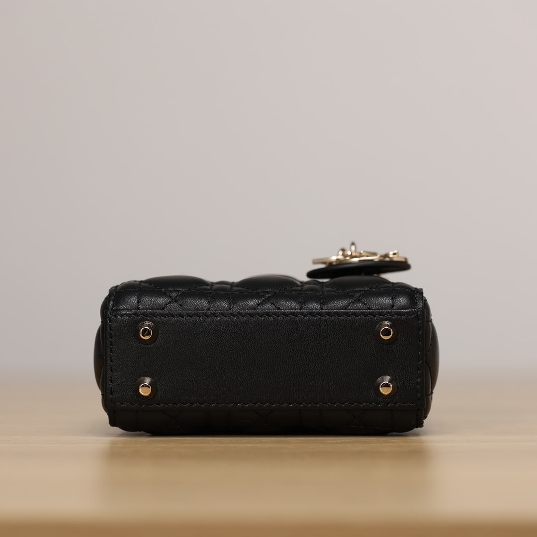 採用純進口黑色小羊皮材質打造,為精美的輪廓帶來一絲的圓潤角度,整個包型結構外觀是以藤格紋衍縫線作為主要設計,完美的9宮格,與黑色形成了高級美感.配備的淡金扣具,D.I.O.R字體精度打磨,部分環扣刻度相關CD與Dior字面,清晰工整無誤差.