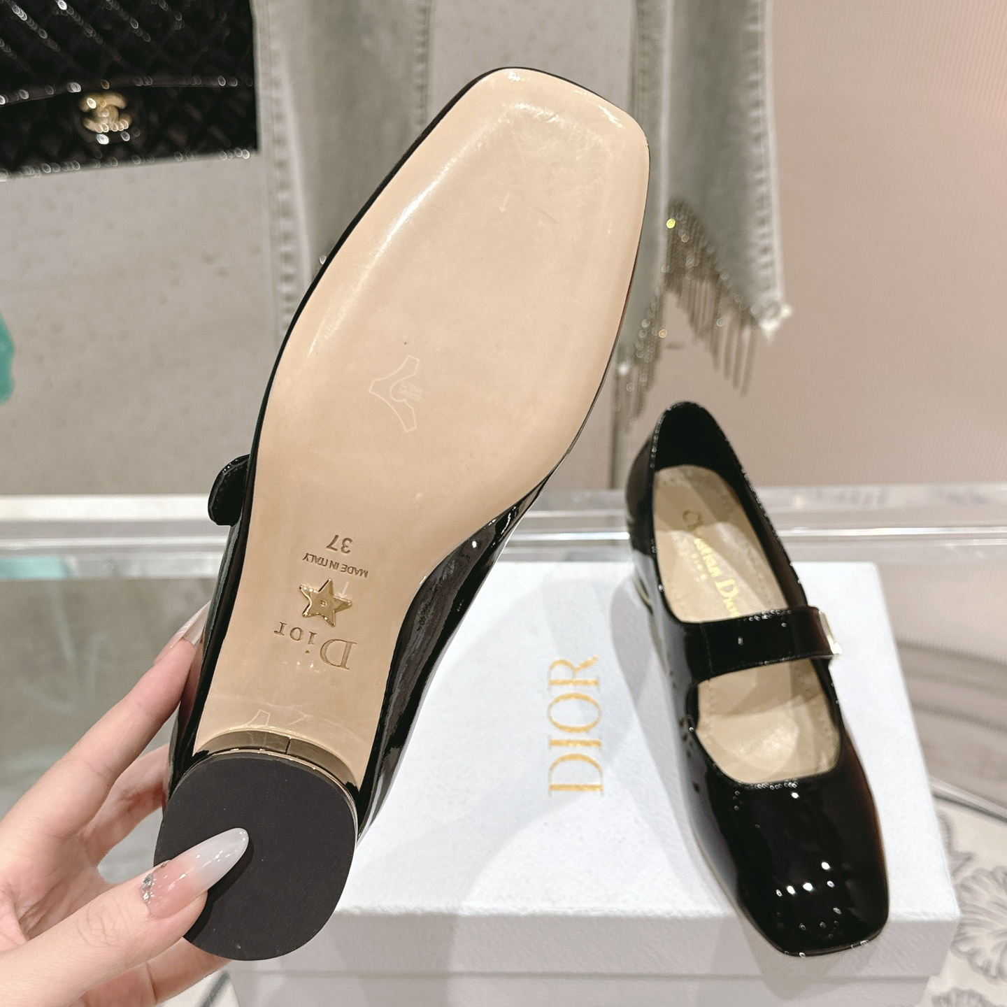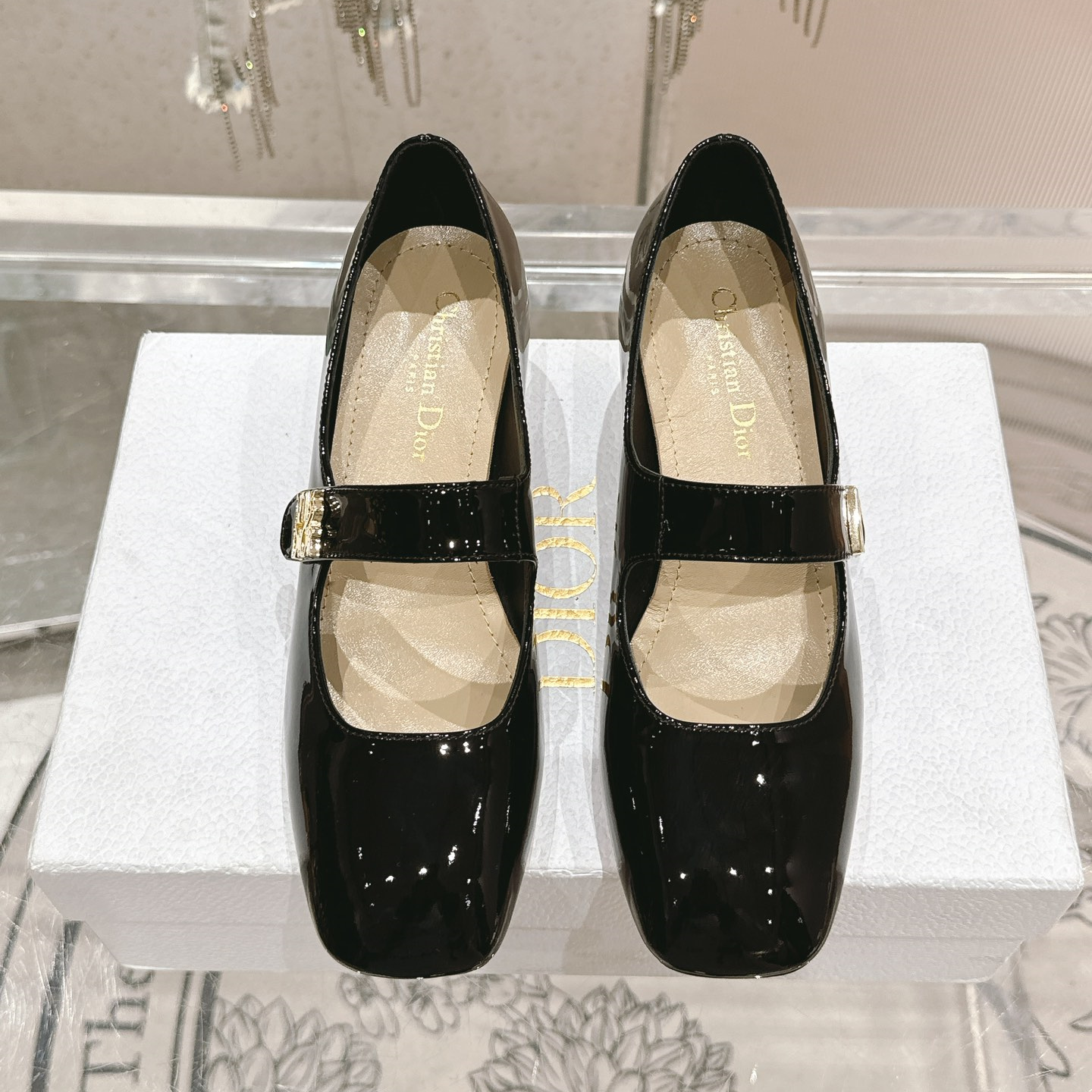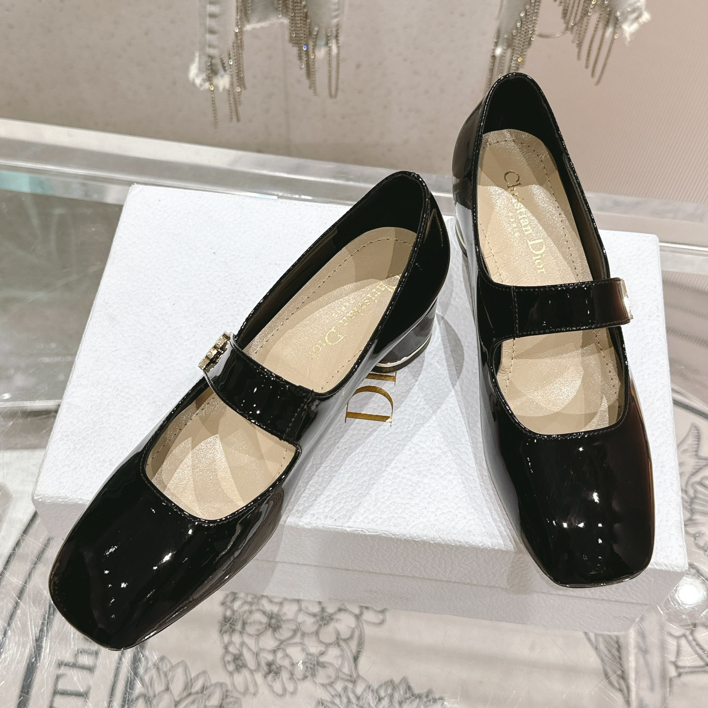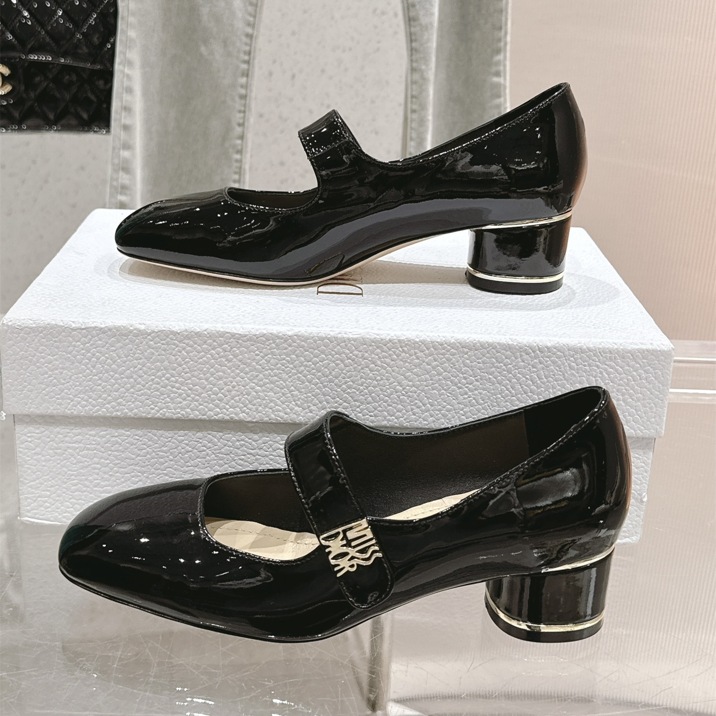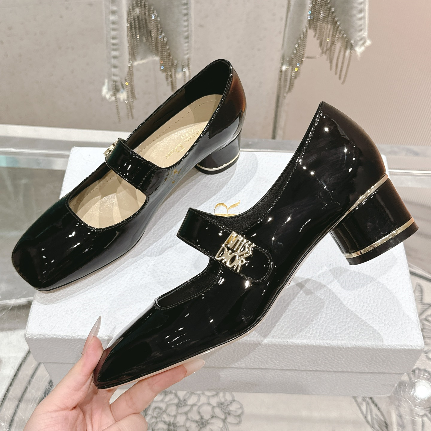 高仿Dior*Miss系列KDC268方頭粗跟單鞋4CM黑色漆皮免檢版