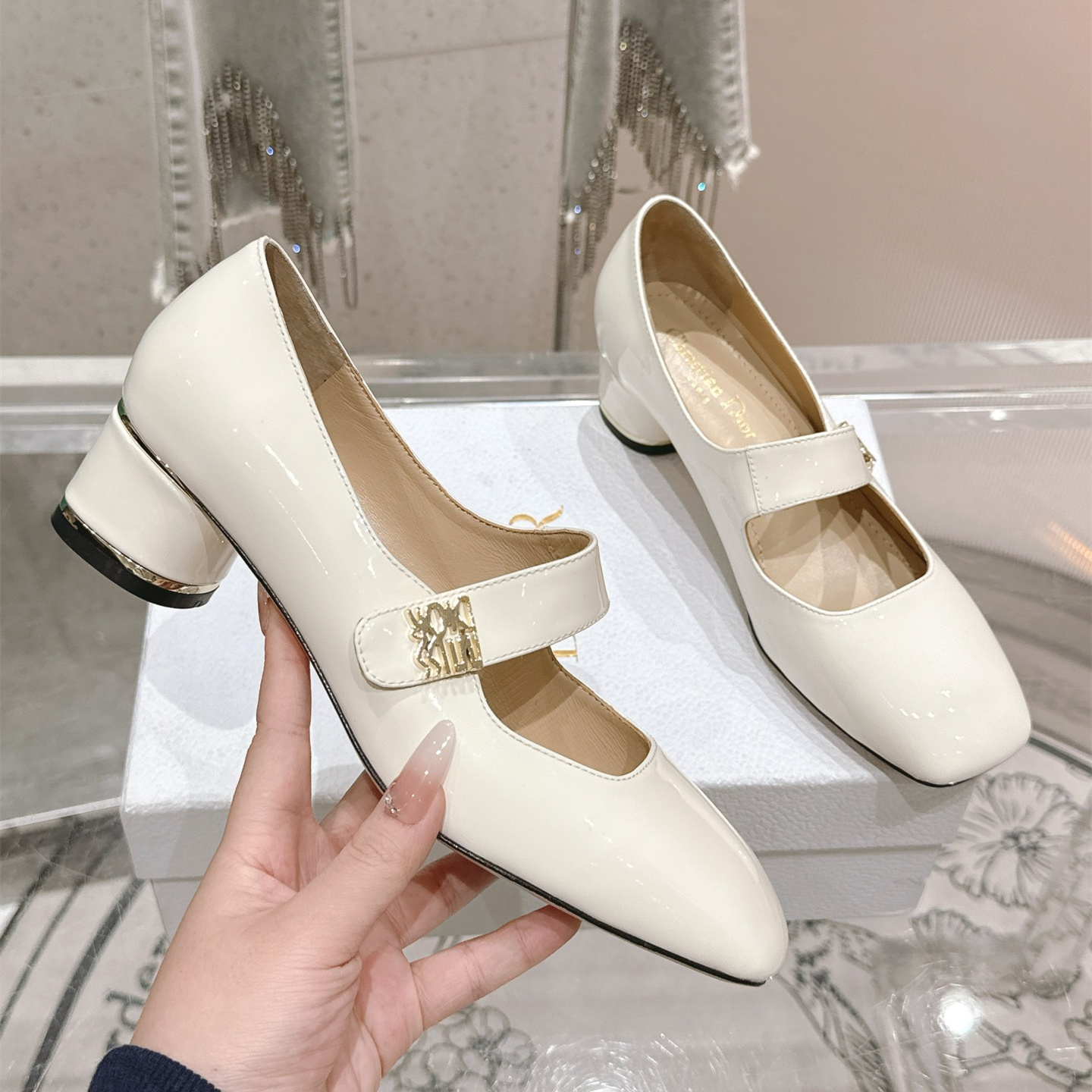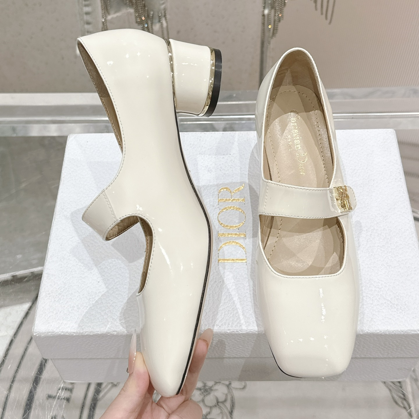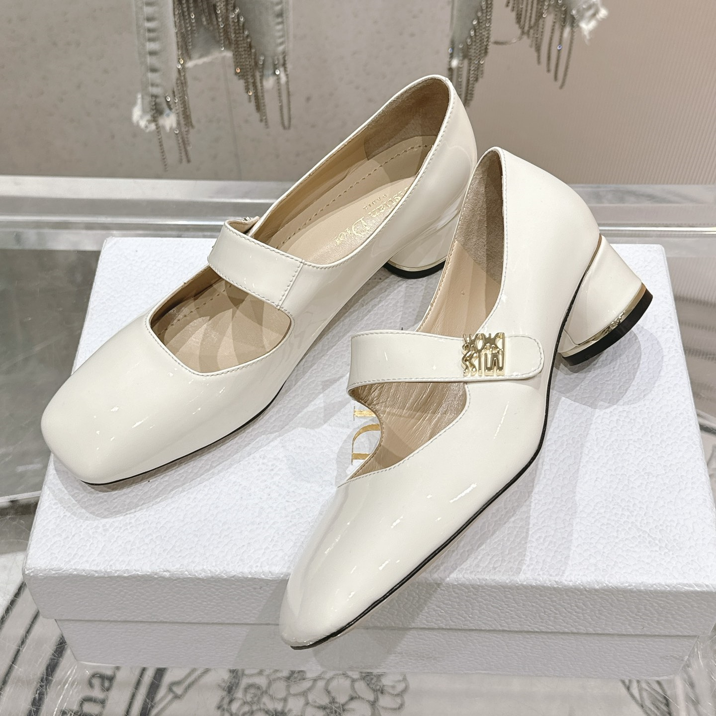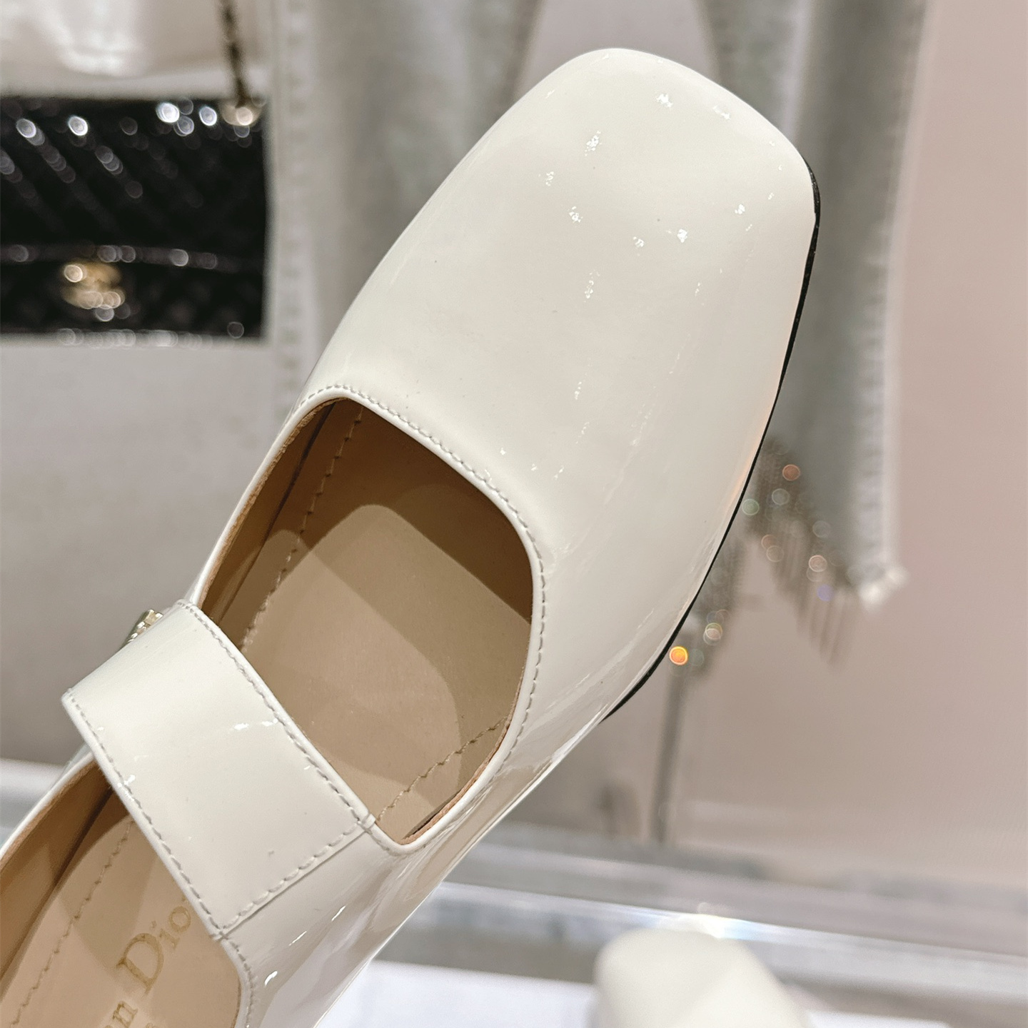 高仿Dior*Miss系列KDC269方頭粗跟單鞋4CM白色漆皮免檢版