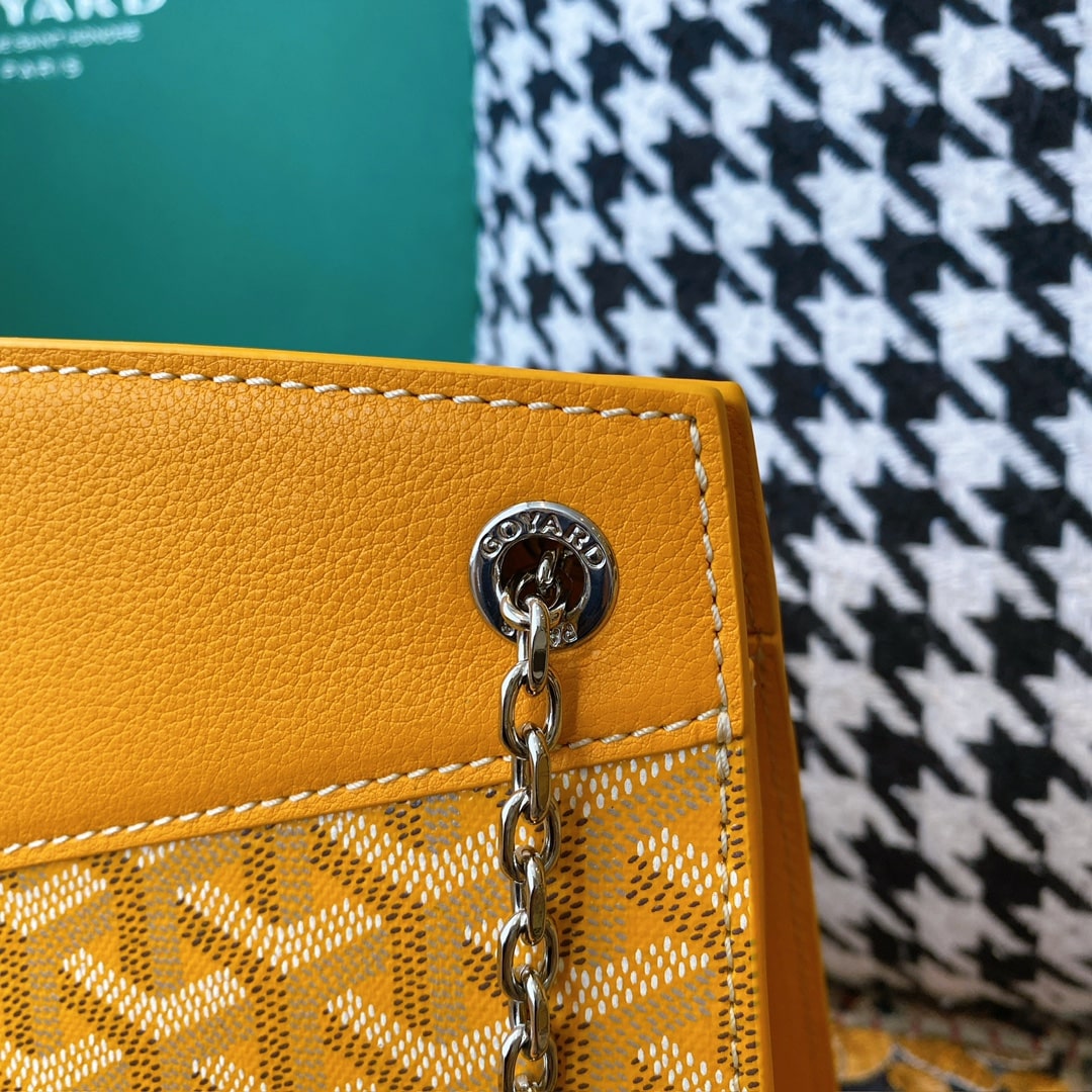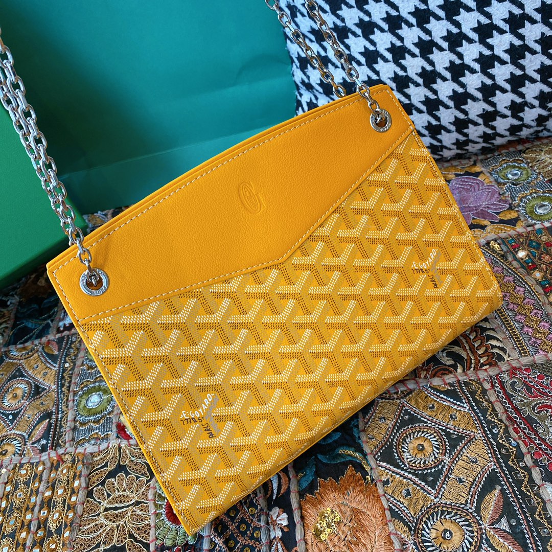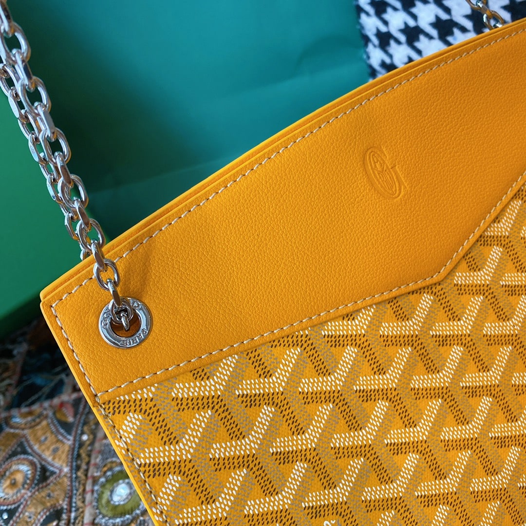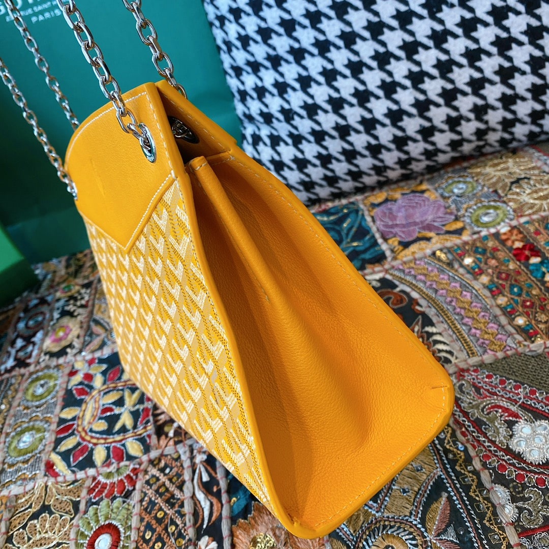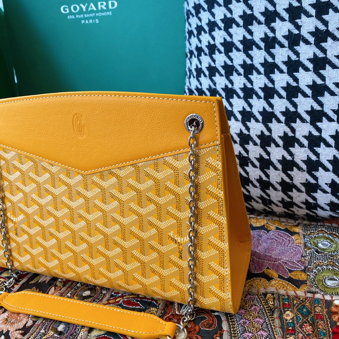 精仿戈雅包包香港網站全新推出2024年Rouette系列手提包款,全新的復古設計搭配新穎的黃配色,一股渲染的視覺感完美呈現.作為Goyard包包中單肩包的代表作,大容量空間可實現放置各類單品,如:化妝品,移動電源,錢夾,配備雙層夾層可利用空間非常便捷.