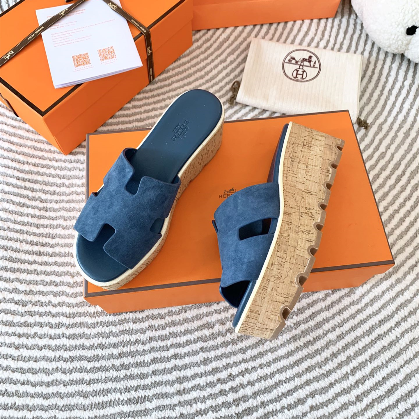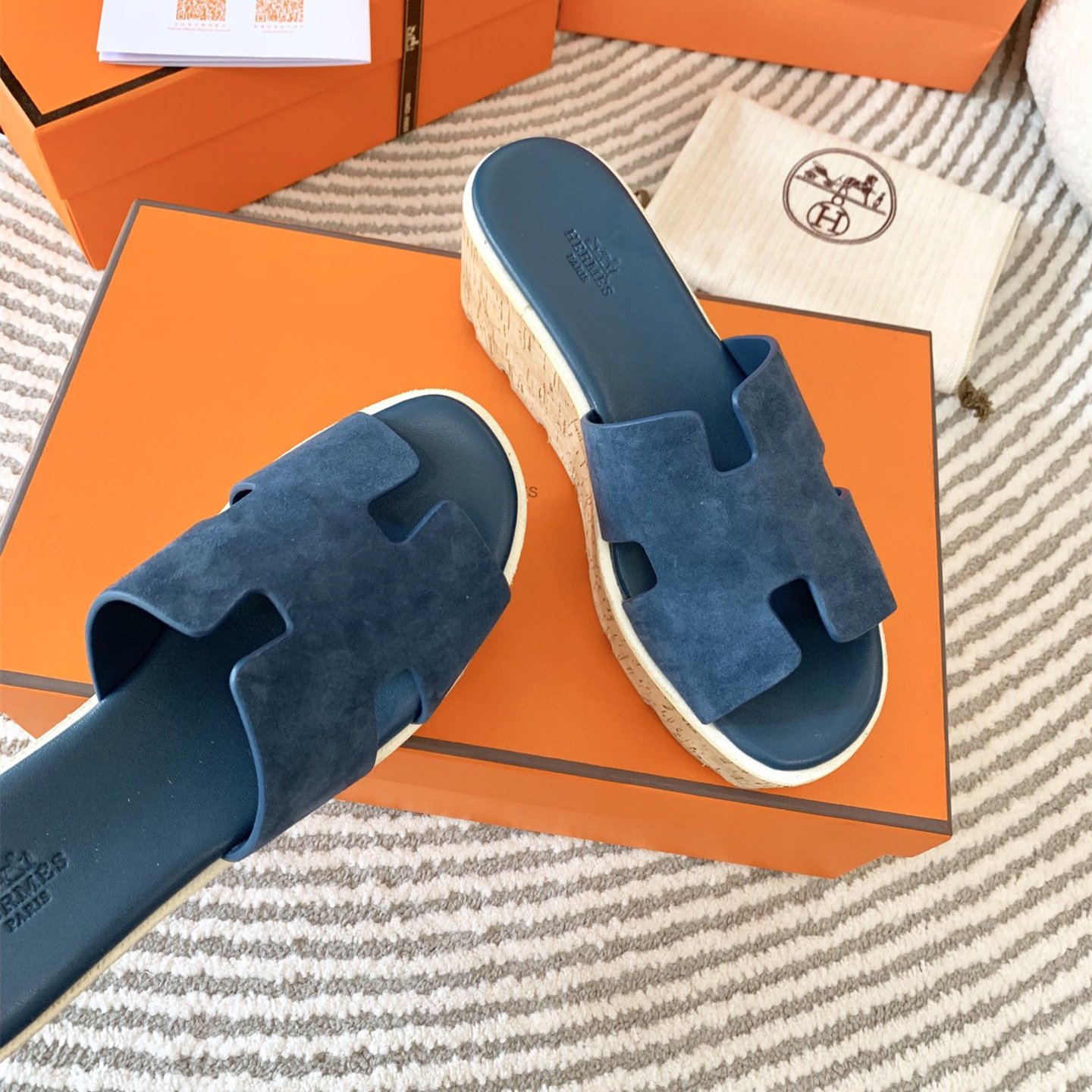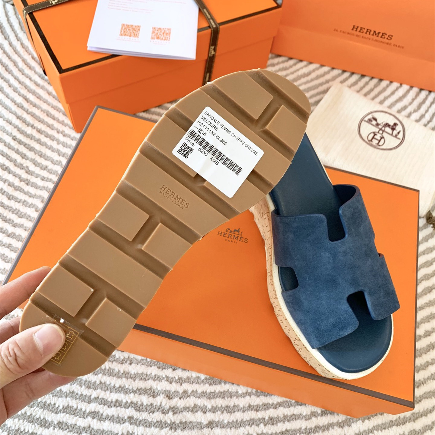 高仿Hermes*H232150ZV9山羊皮厚底涼拖藍色6.5CM免檢版